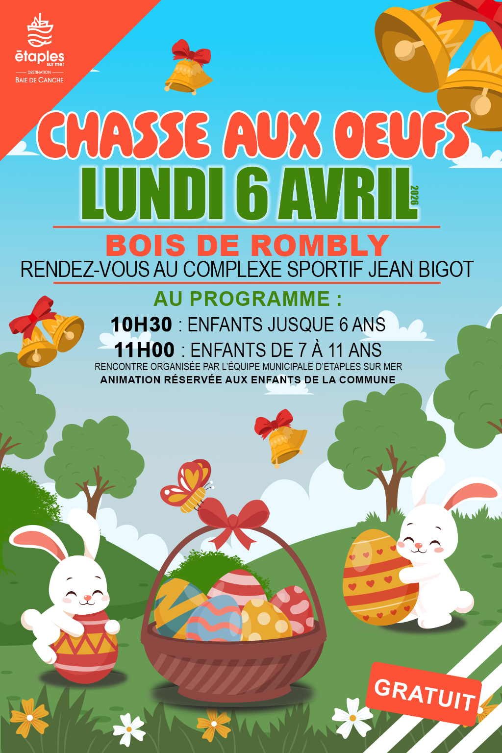 Ce lundi 6 avril 2026, au bois de Rombly. Rendez-vous au complexe sportif Jean Bigot Au programme : 10h30 : enfants jusque 6 ans 11h00 : enfants de 7 à 11 ans Rencontre organisée par l'équipe municipale d'Etaples-sur-mer Animation réservée aux enfants de la commune Gratuit