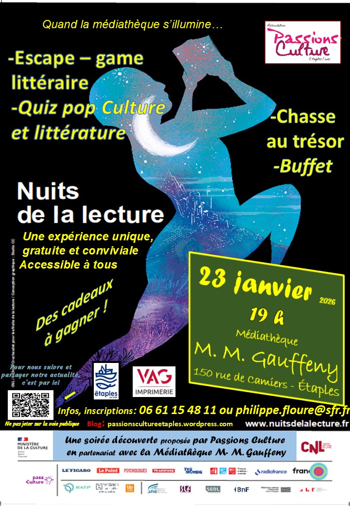 Nuits de la Lecture : animations à la médiathèque d'Étaples L'association Passions Culture, en partenariat avec la Médiathèque M.-M. Gauffeny, organise une soirée dans le cadre des Nuits de la Lecture le vendredi 23 janvier 2026. Dès 19 h, plusieurs activités seront proposées au public : Un escape-game littéraire. Un...