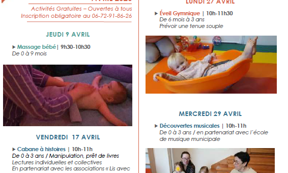 En avril, la Maison de la Petite Enfance vous invite à partager des moments privilégiés en famille : massage pour bébé, cabane à histoires, éveil gymnique et découverte musicale… Autant d’occasions pour s’amuser et s’éveiller ensemble ! Toutes les activités sont gratuites et ouvertes à tous. Inscription obligatoire au 06...