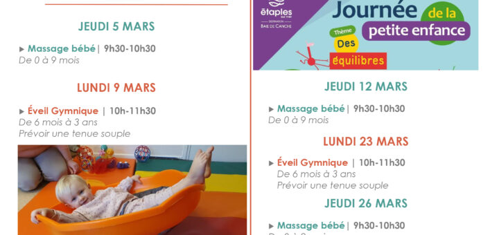 En mars, la Maison de la Petite Enfance vous propose un programme de moments à partager en famille : massage bébé, éveil gymnique, atelier cuisine et découverte musicale… Autant d’occasions de s’éveiller et de s’amuser ensemble ! Découvrez ci-dessous le programme des ateliers parents-enfants. Activités gratuites, ouvertes à tous (inscriptions...