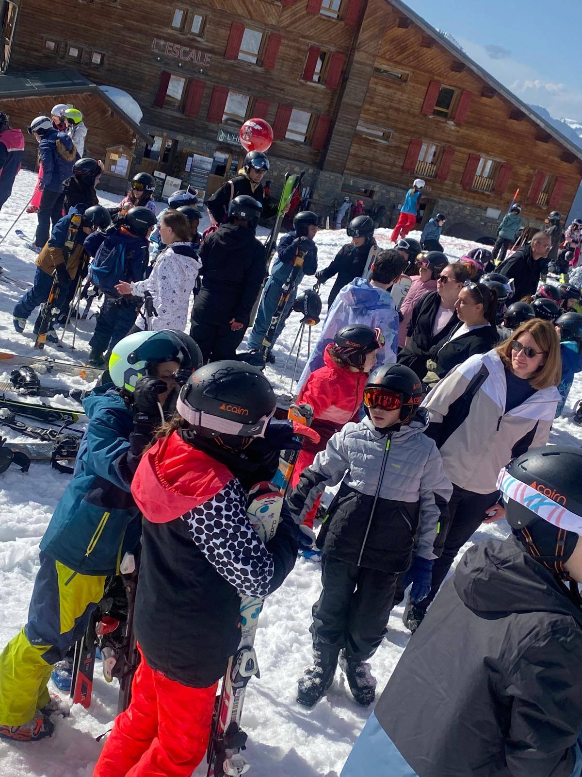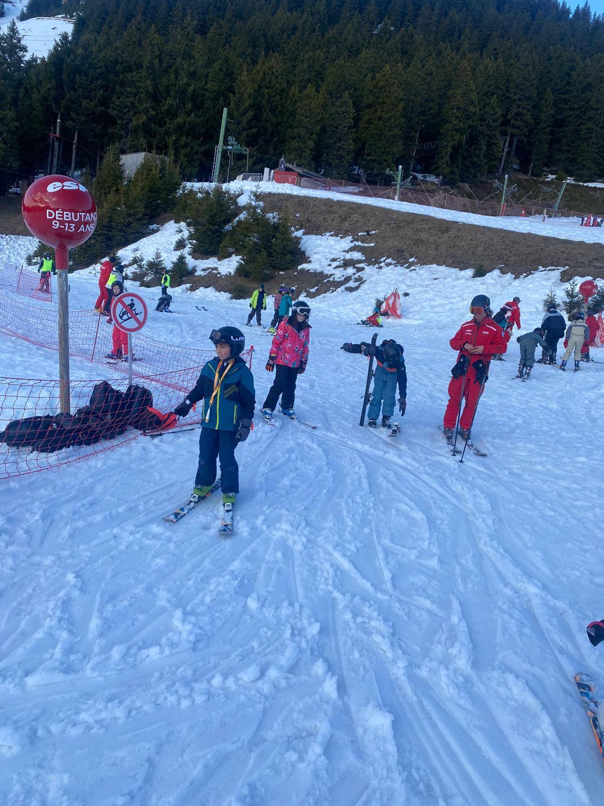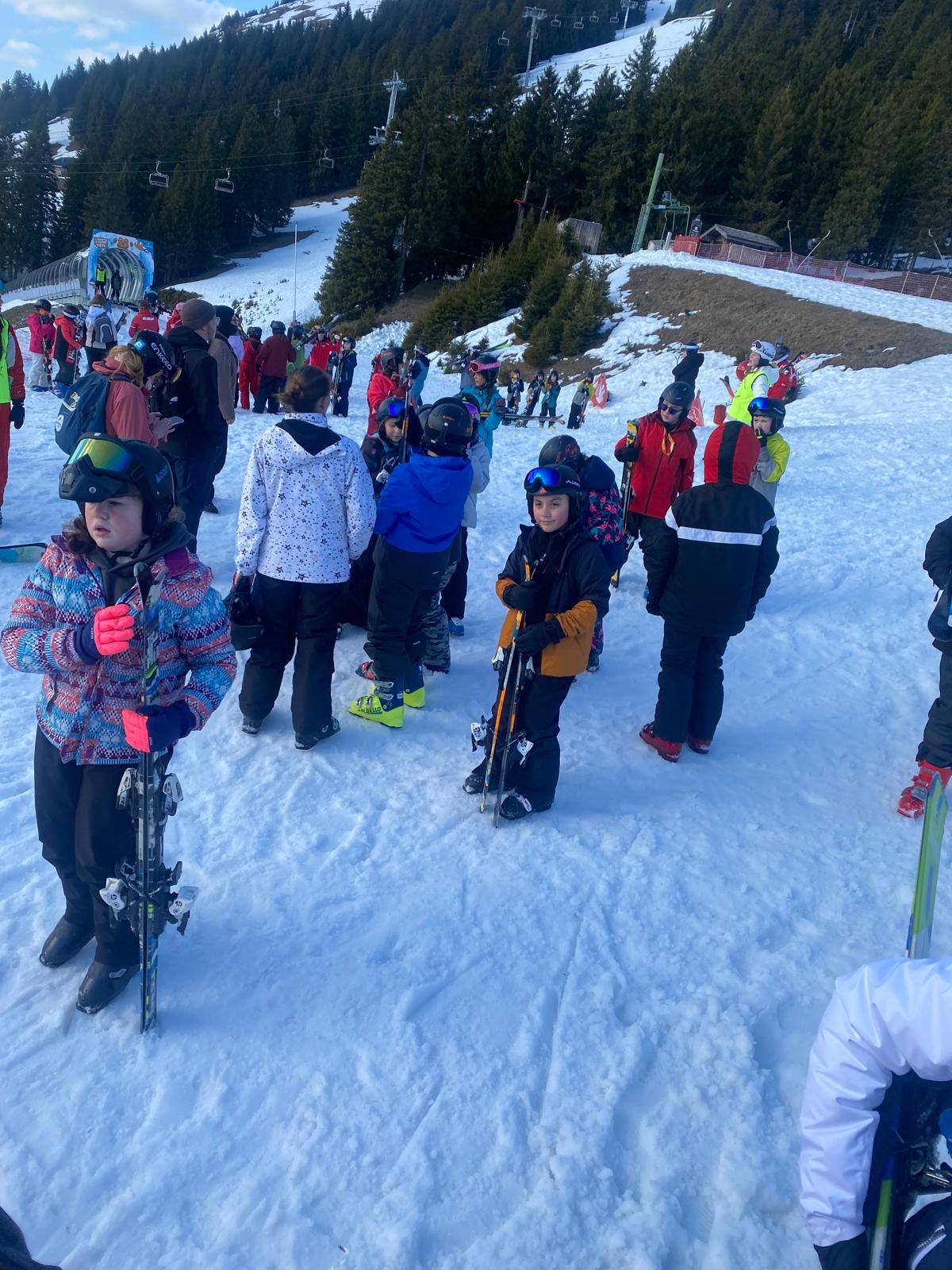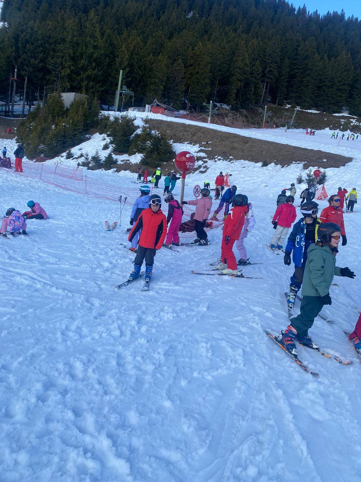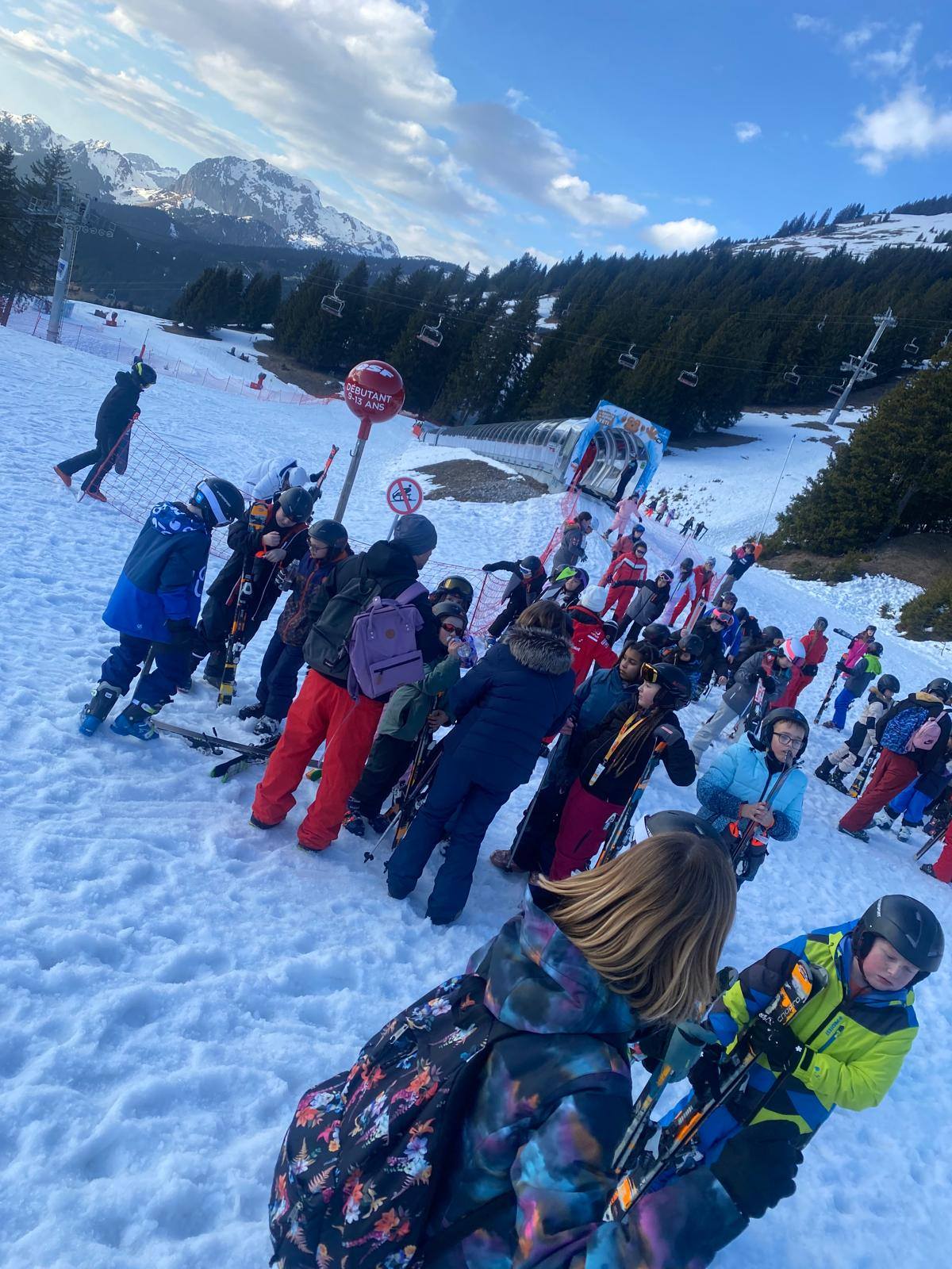 Pour le deuxième jour de ski, après la préparation de l’équipement et la répartition dans les différents groupes, les élèves ont rejoint les pistes avec les autres écoles présentes sur le site. L’ambiance est animée et les pistes sont très fréquentées, mais tout se déroule dans la bonne humeur