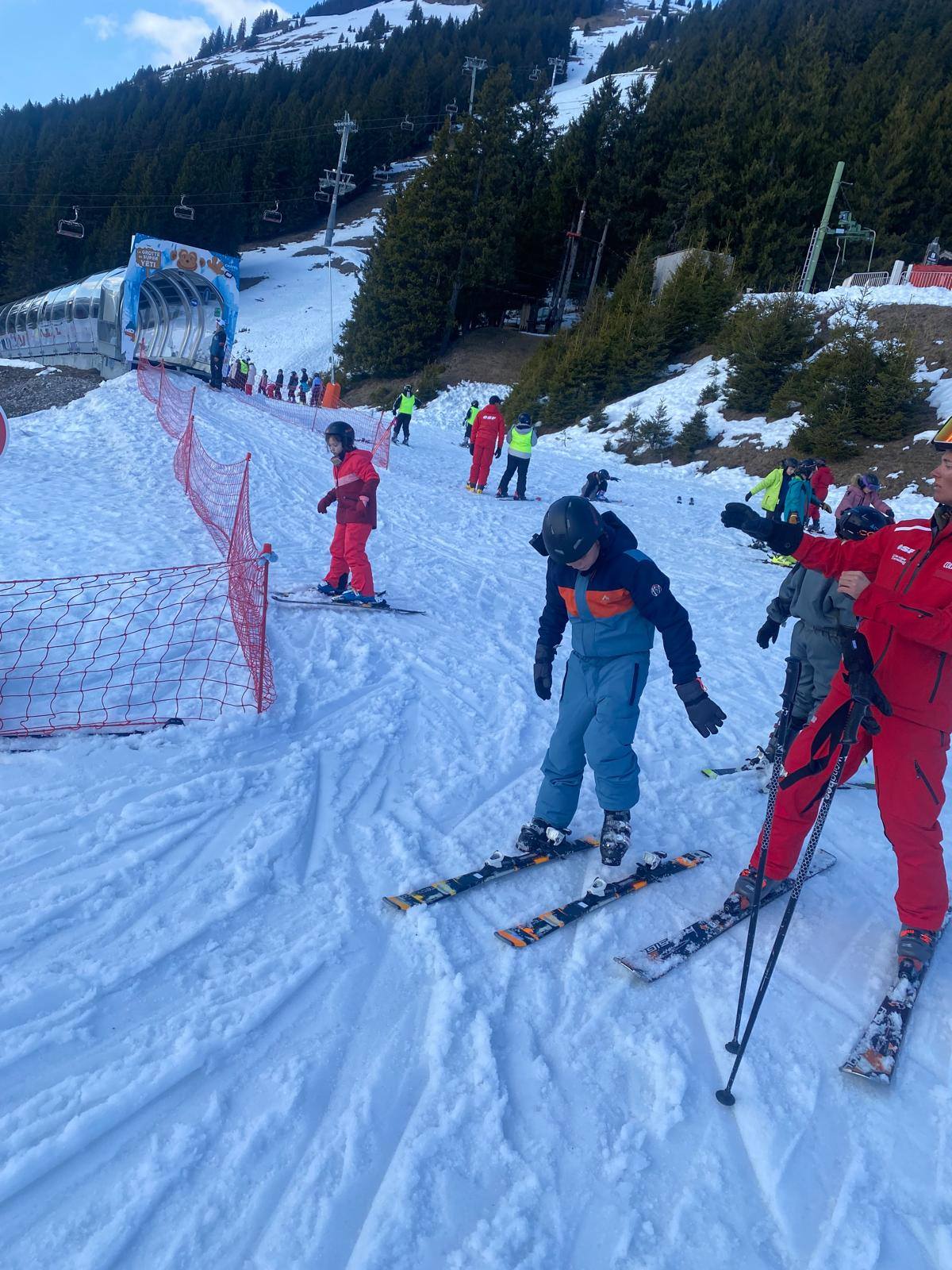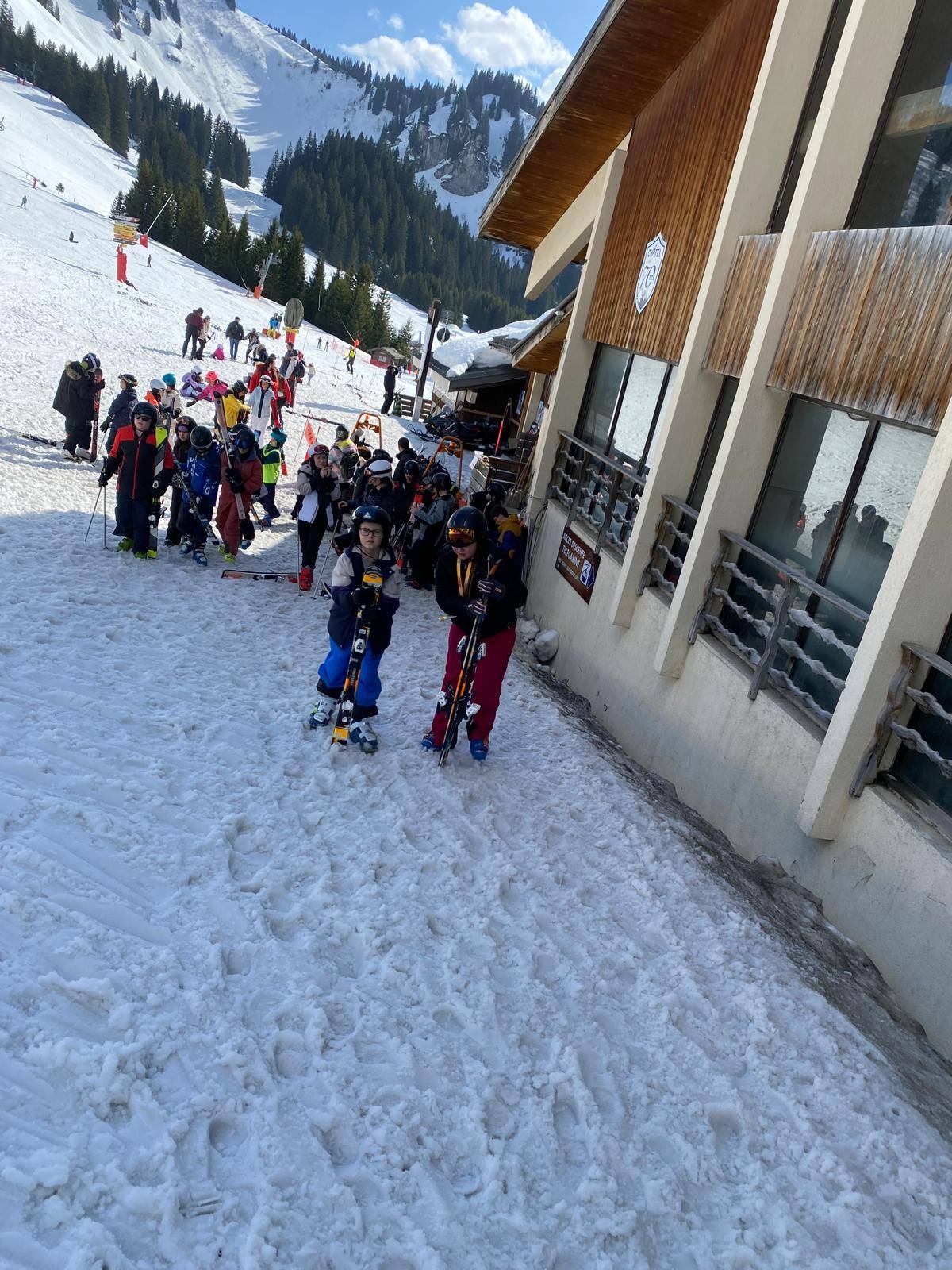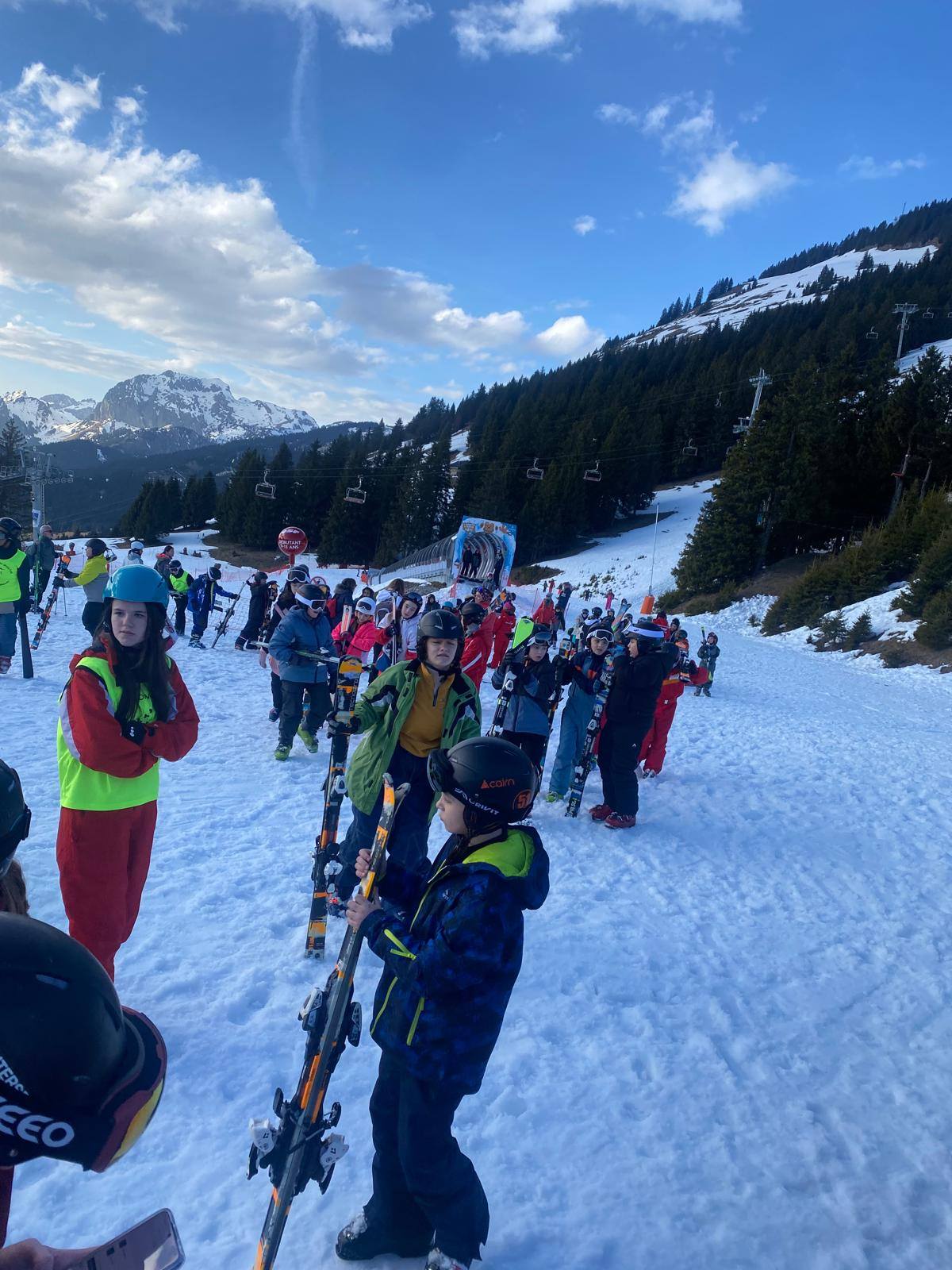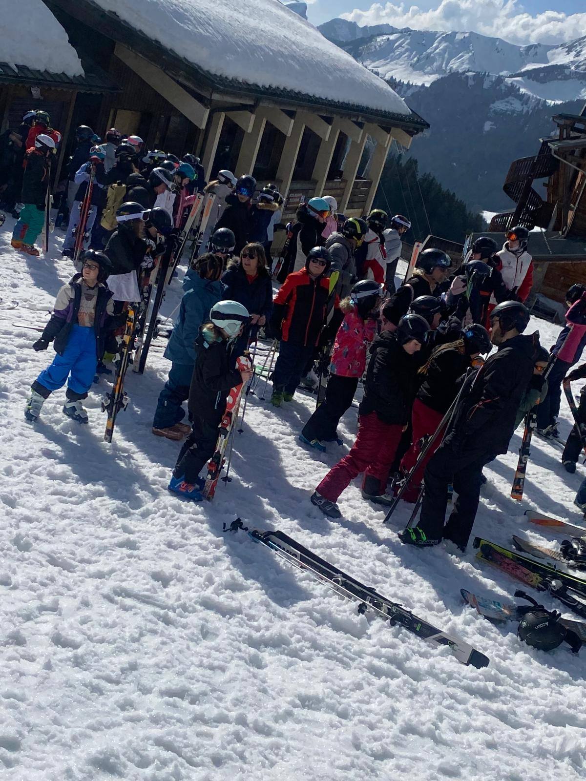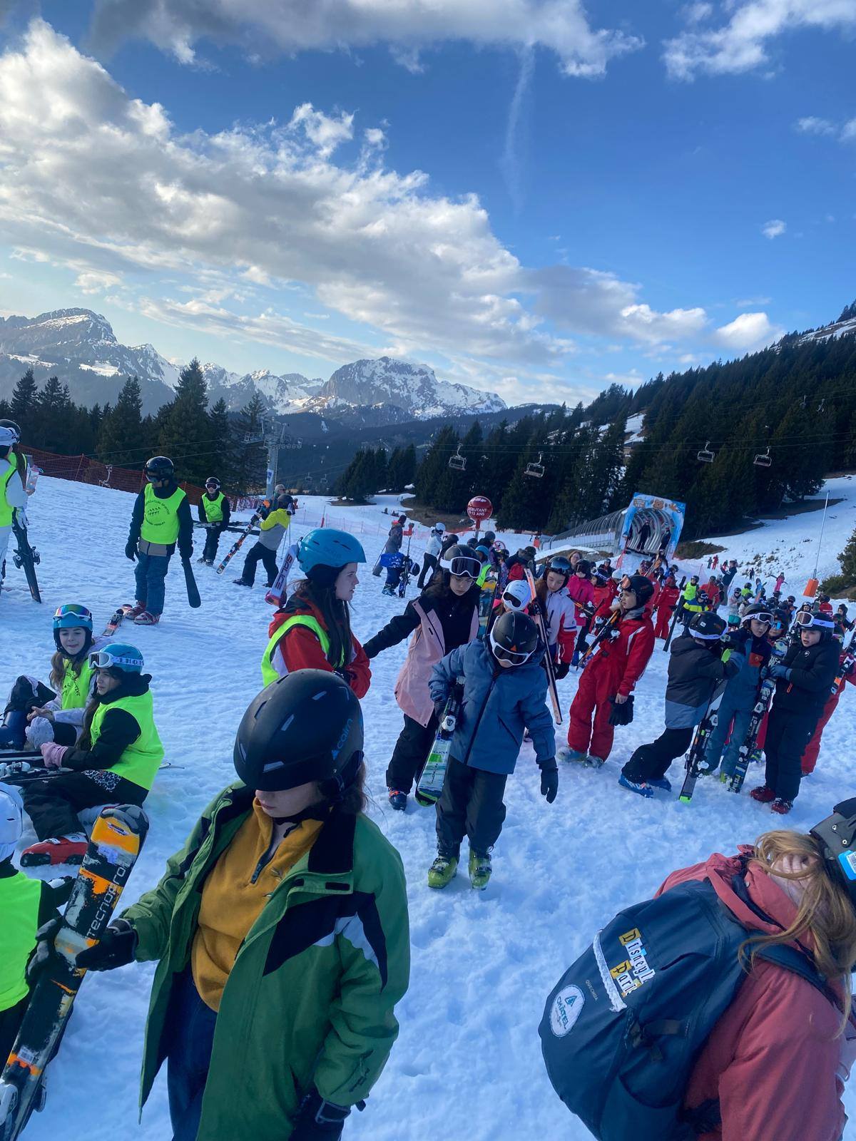 Pour le deuxième jour de ski, après la préparation de l’équipement et la répartition dans les différents groupes, les élèves ont rejoint les pistes avec les autres écoles présentes sur le site. L’ambiance est animée et les pistes sont très fréquentées, mais tout se déroule dans la bonne humeur