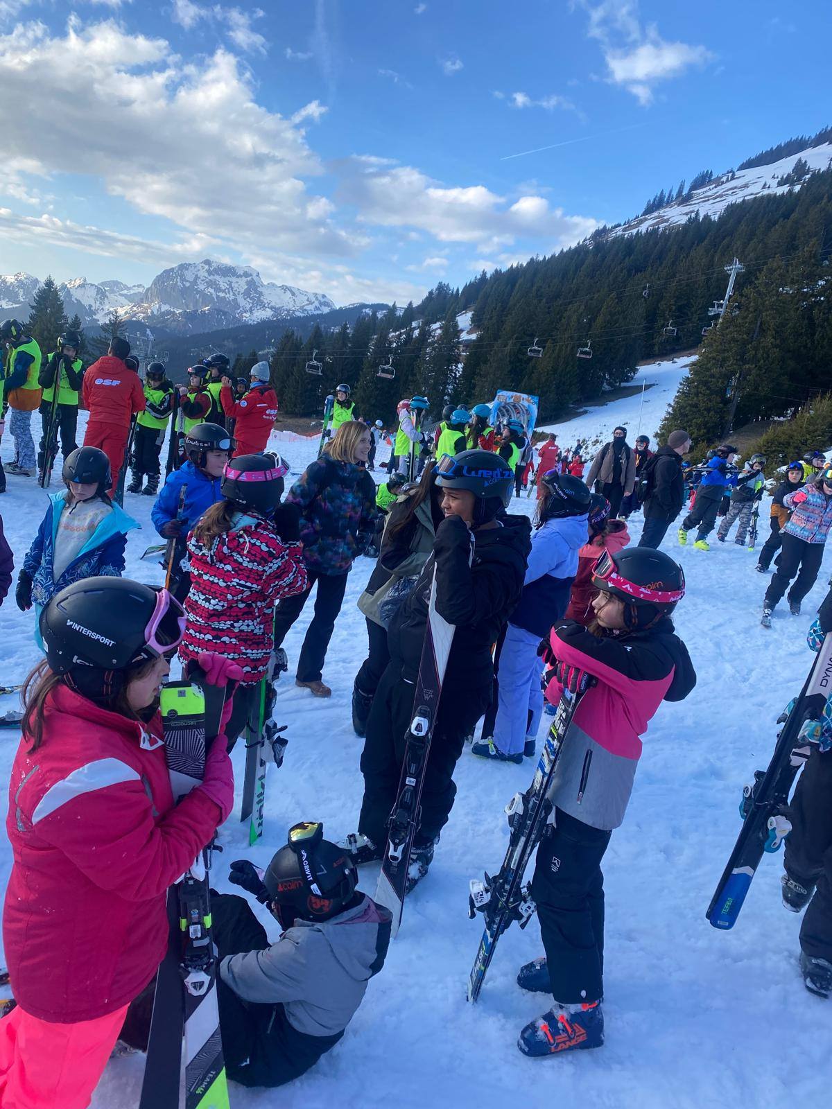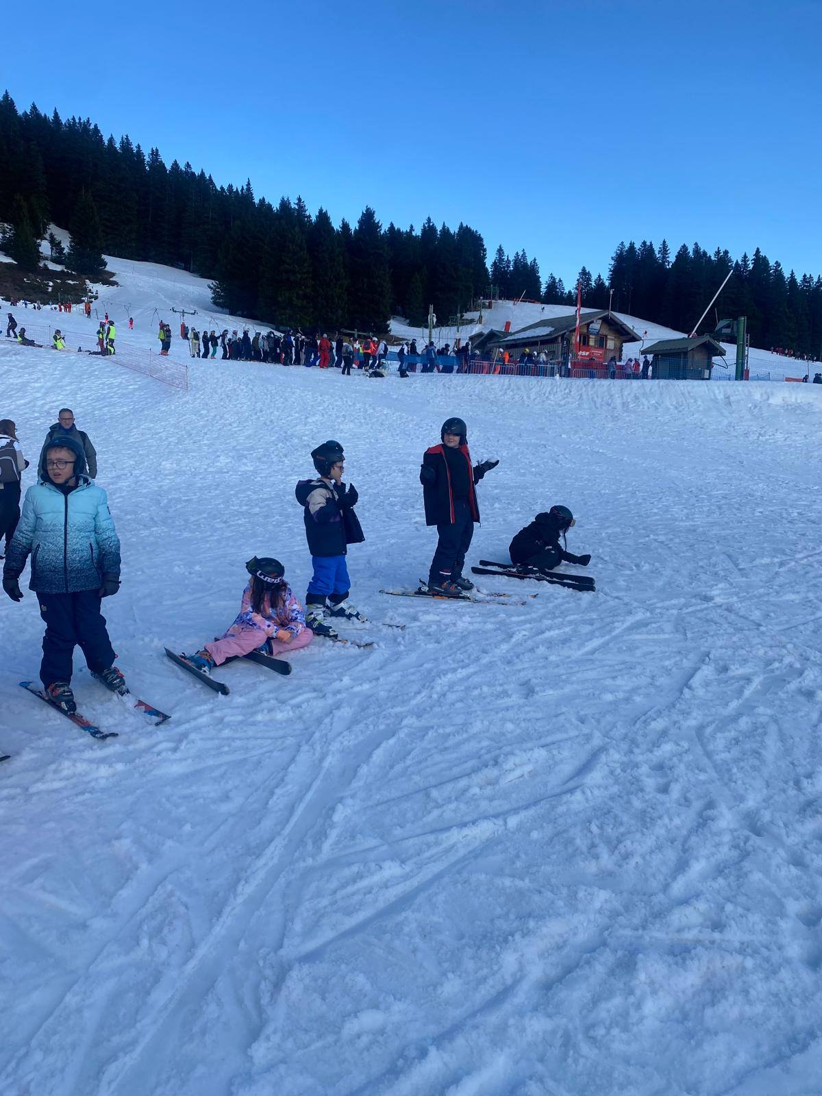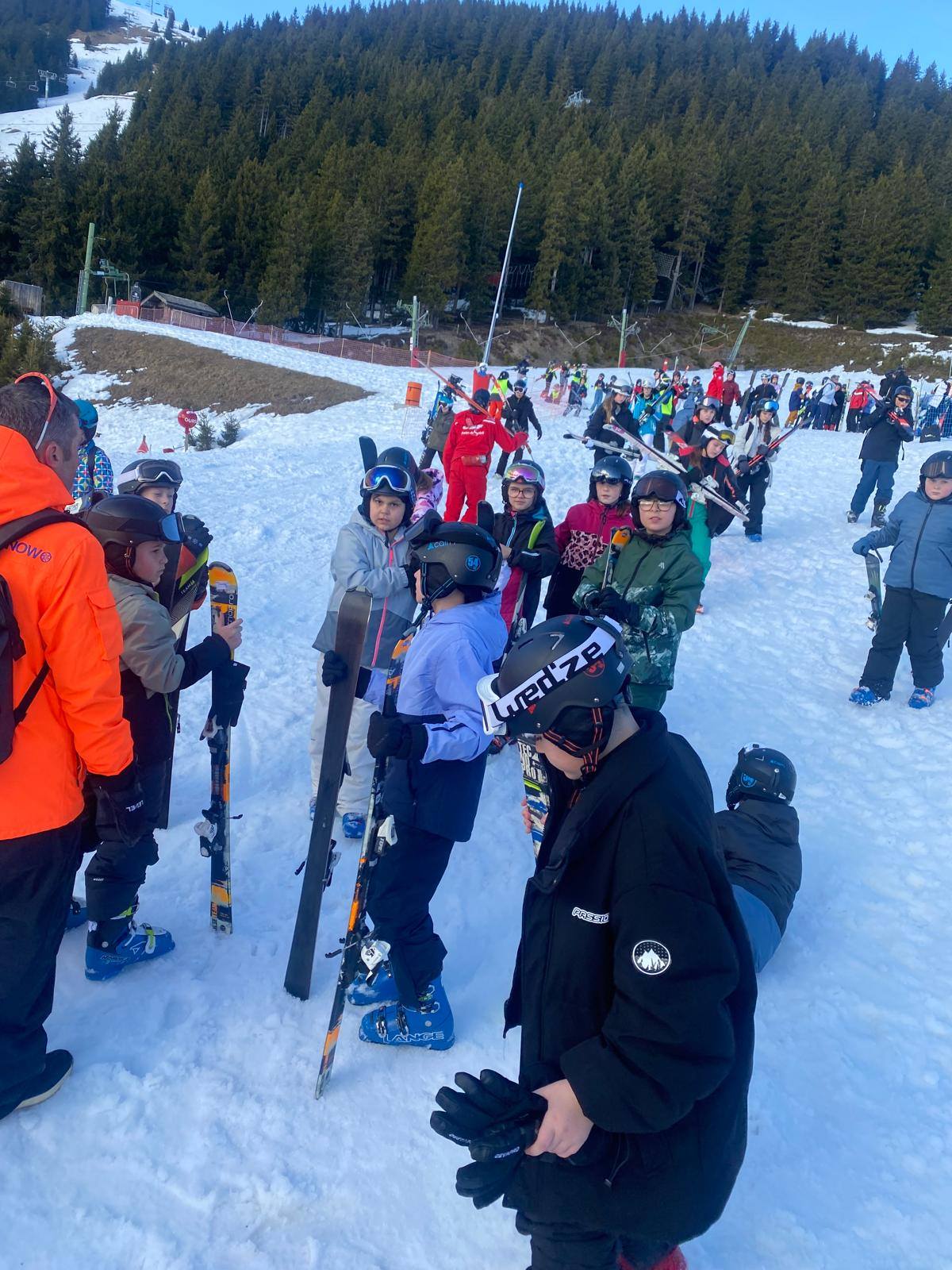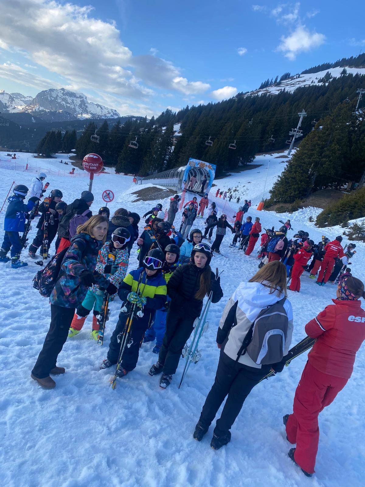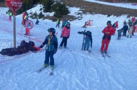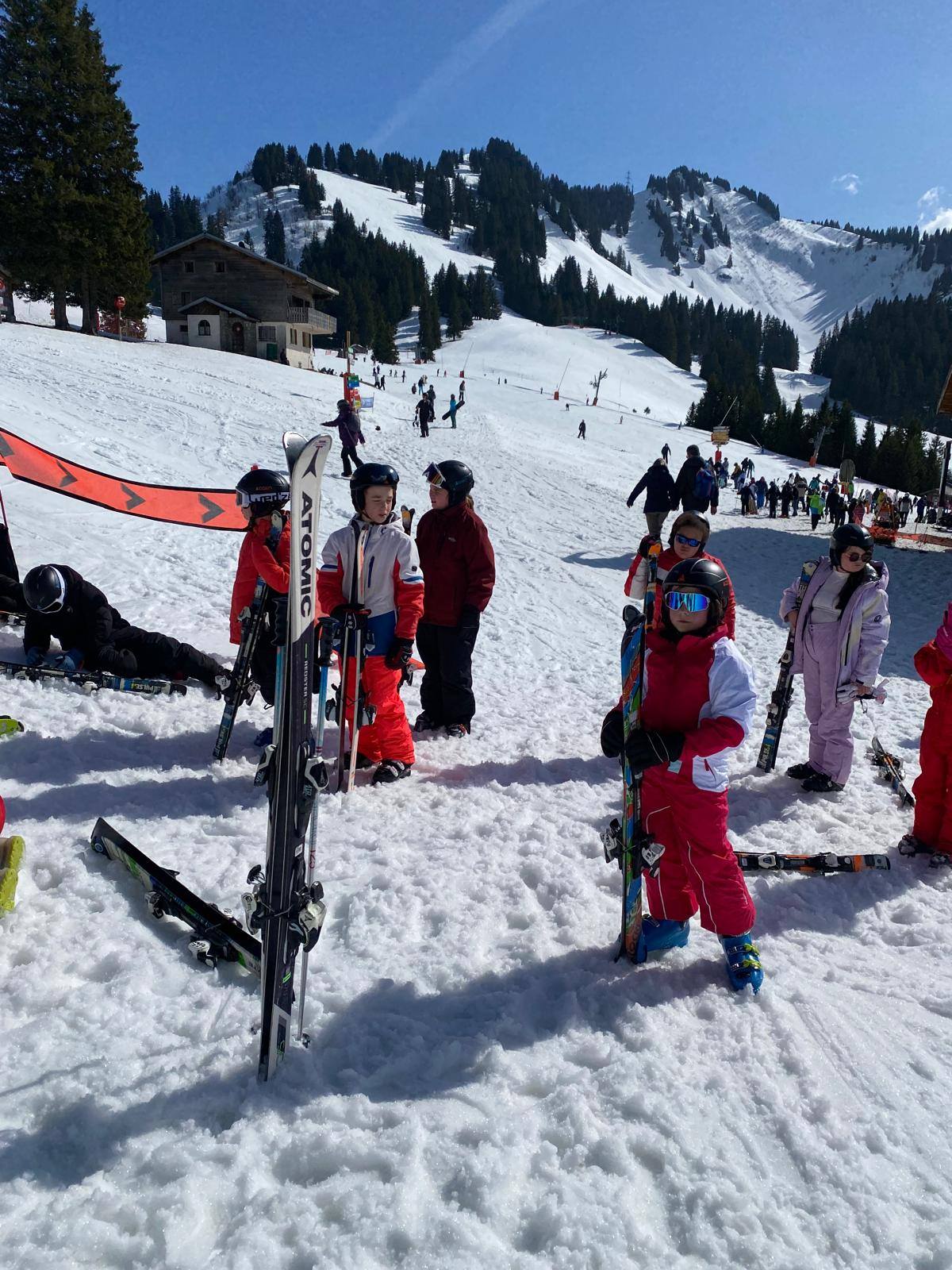 Pour le deuxième jour de ski, après la préparation de l’équipement et la répartition dans les différents groupes, les élèves ont rejoint les pistes avec les autres écoles présentes sur le site. L’ambiance est animée et les pistes sont très fréquentées, mais tout se déroule dans la bonne humeur