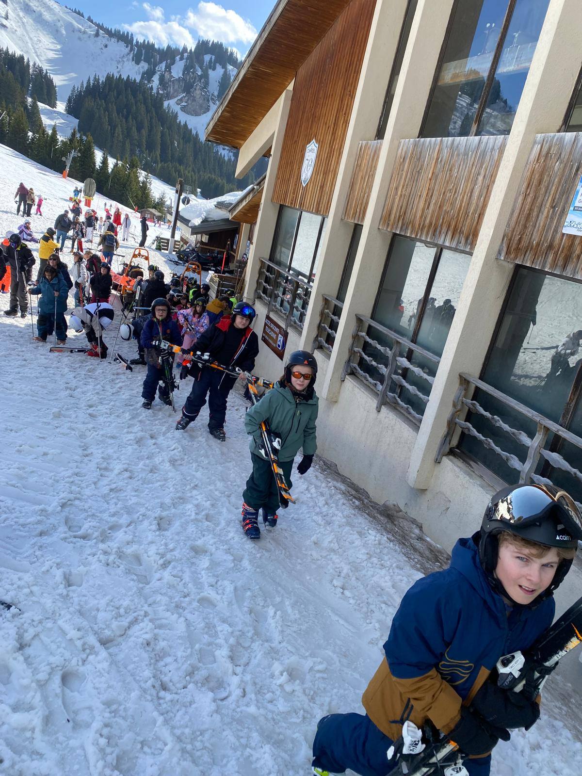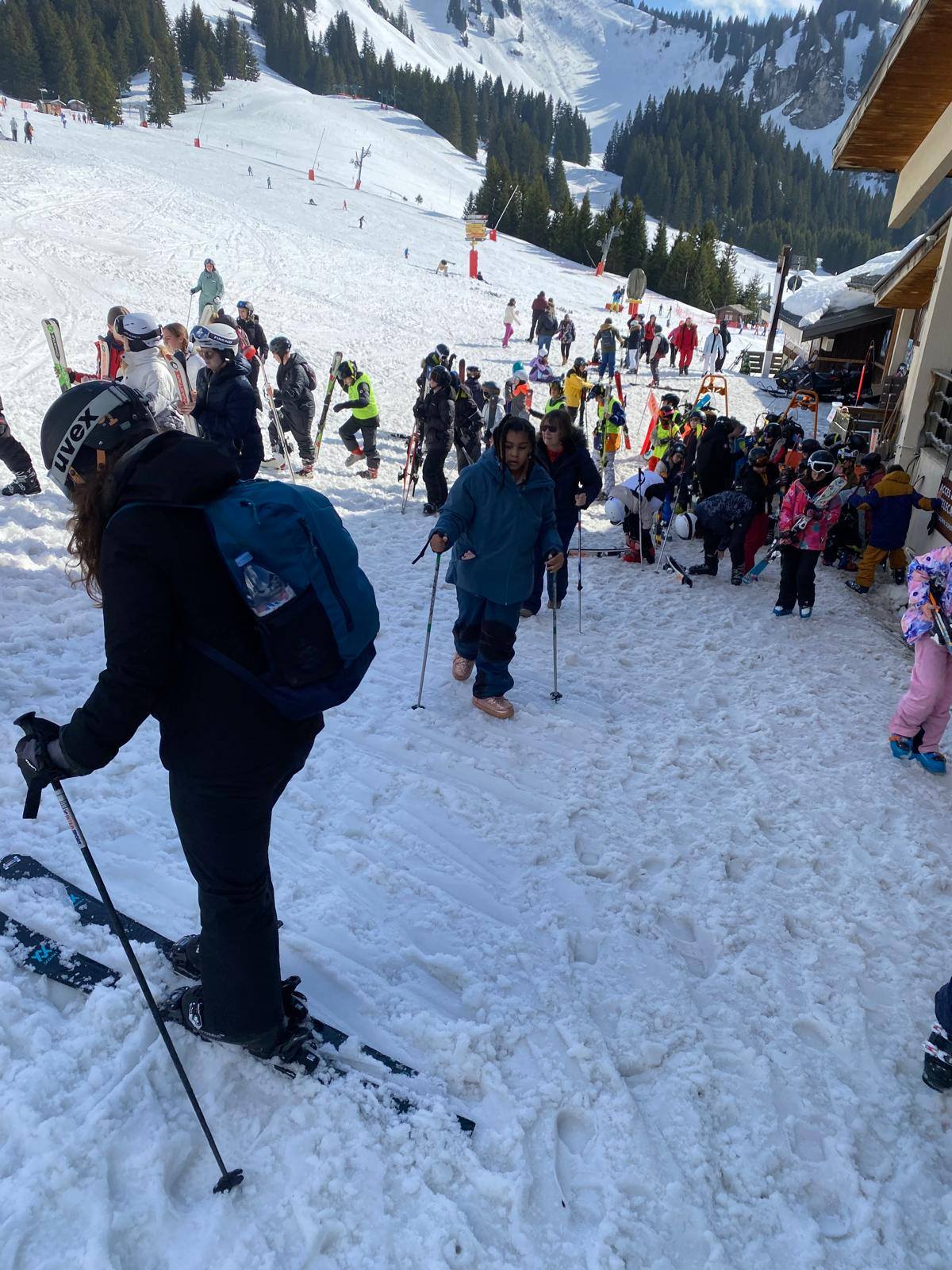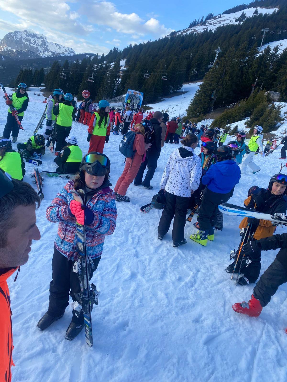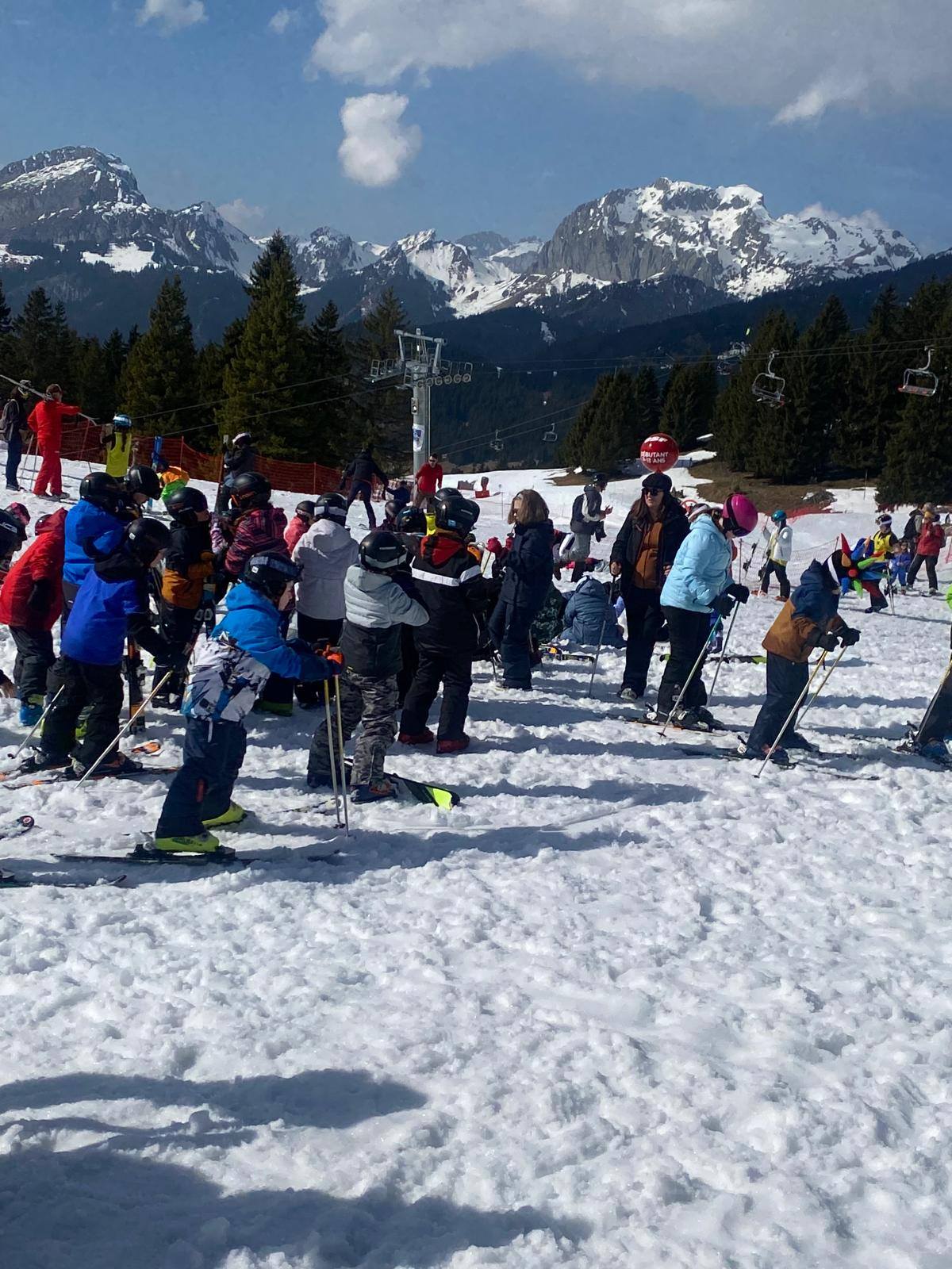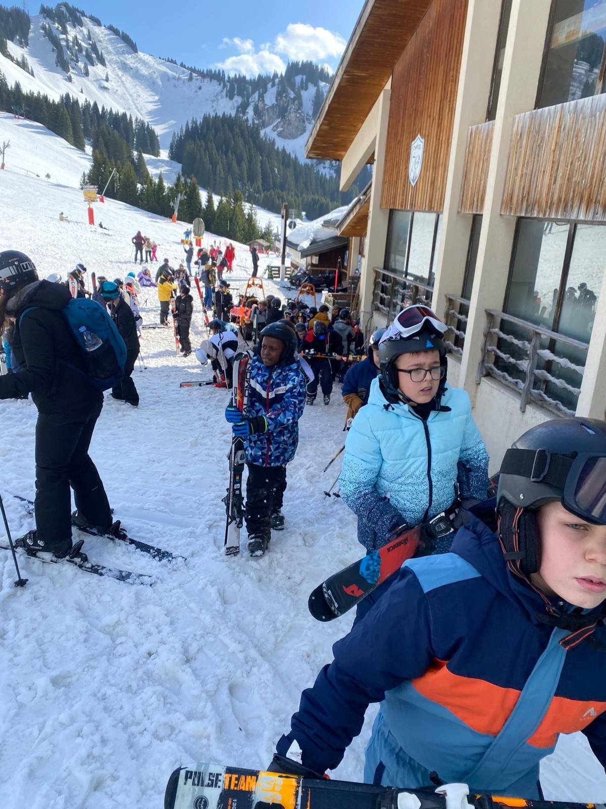 Pour le deuxième jour de ski, après la préparation de l’équipement et la répartition dans les différents groupes, les élèves ont rejoint les pistes avec les autres écoles présentes sur le site. L’ambiance est animée et les pistes sont très fréquentées, mais tout se déroule dans la bonne humeur
