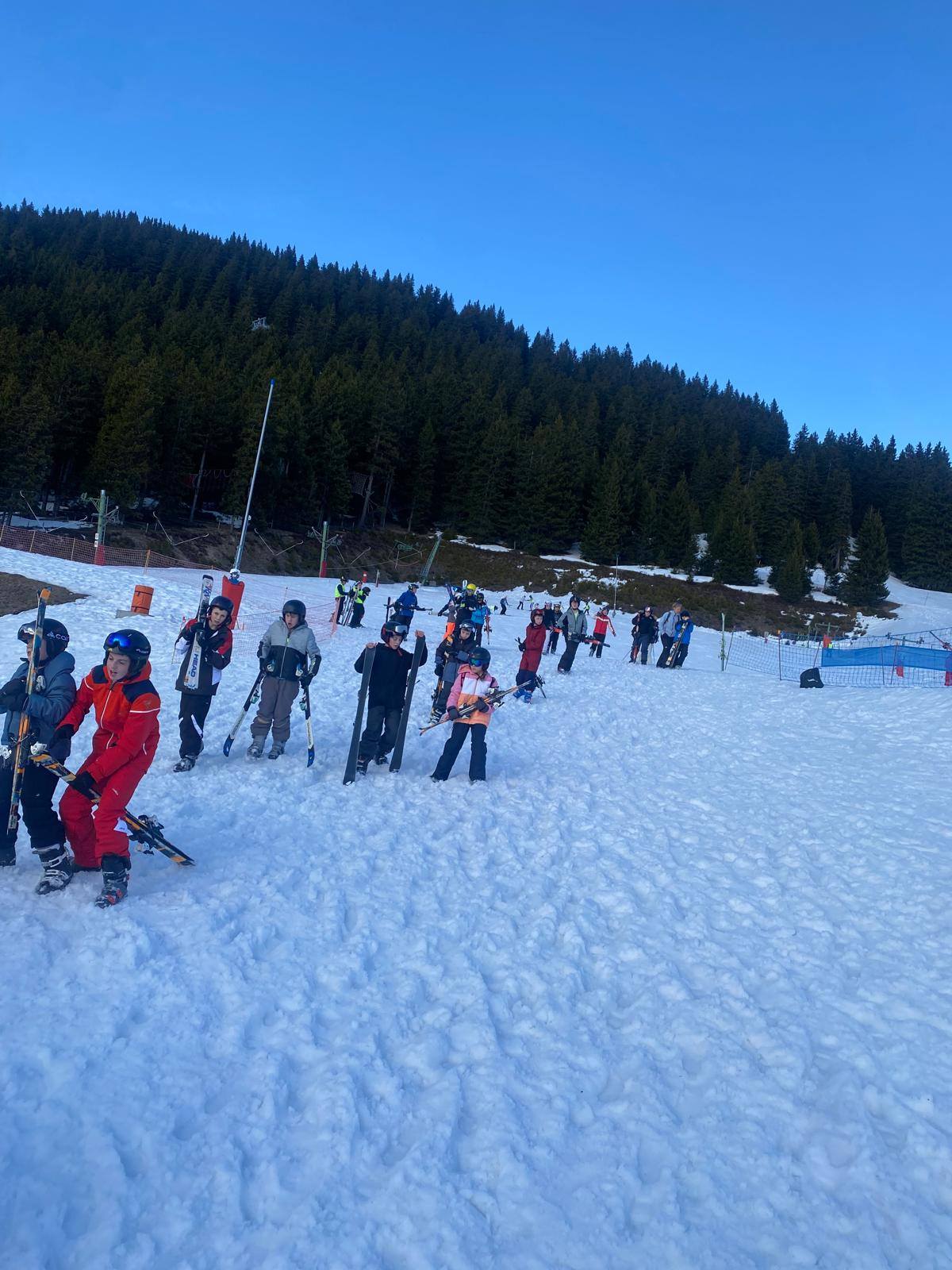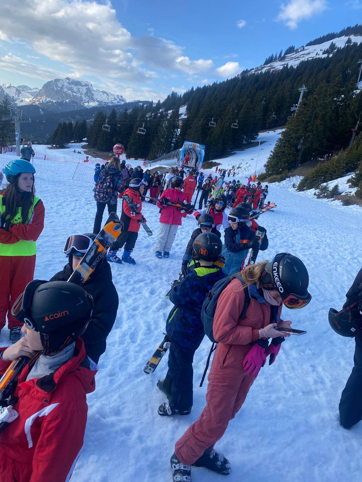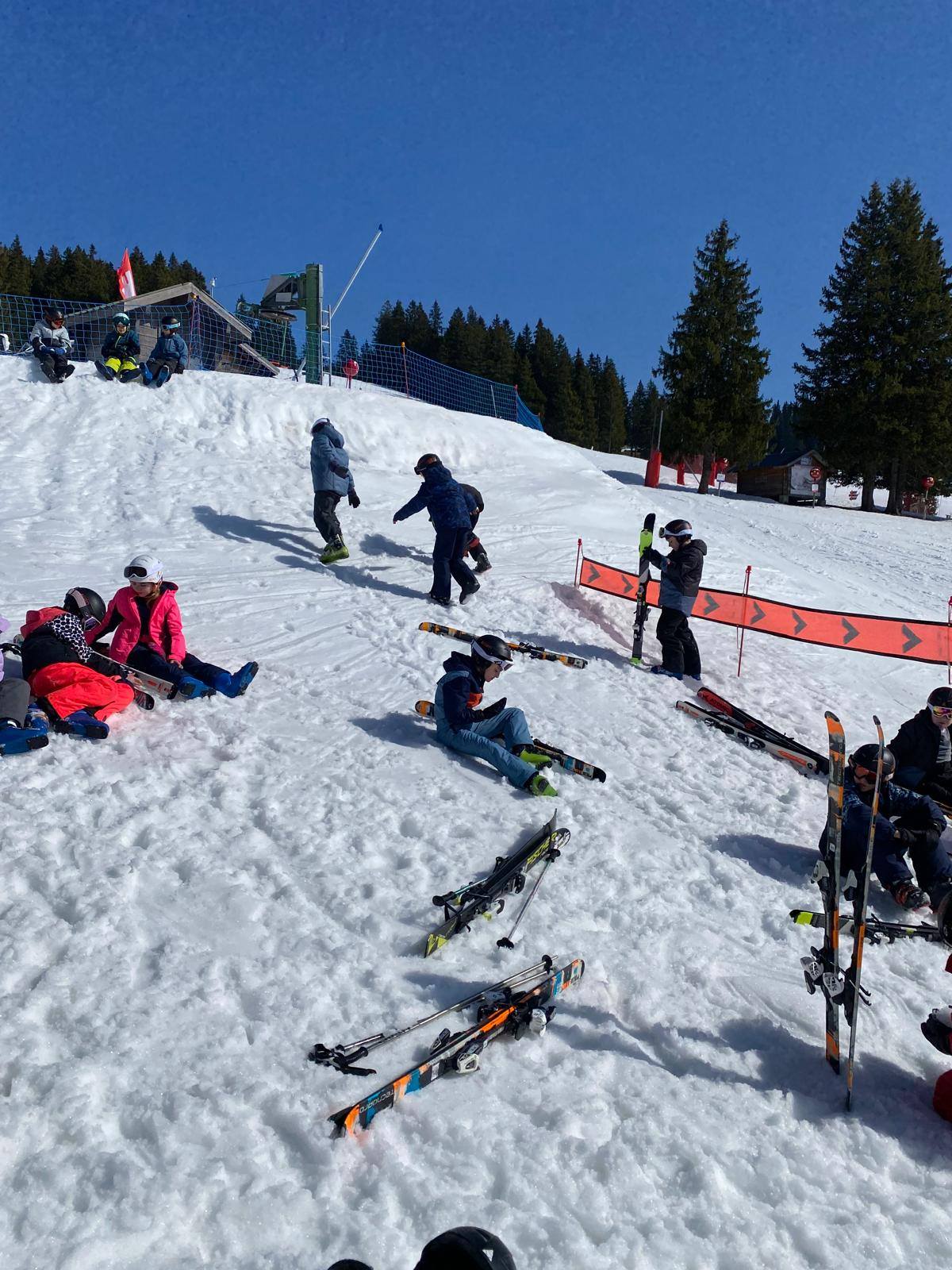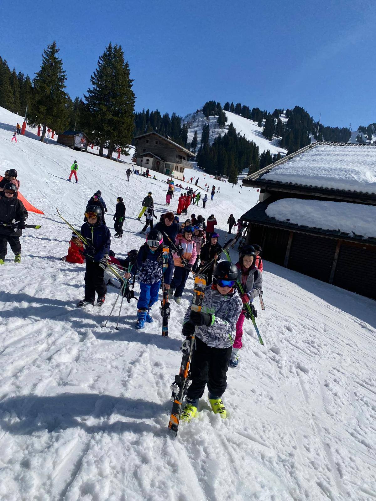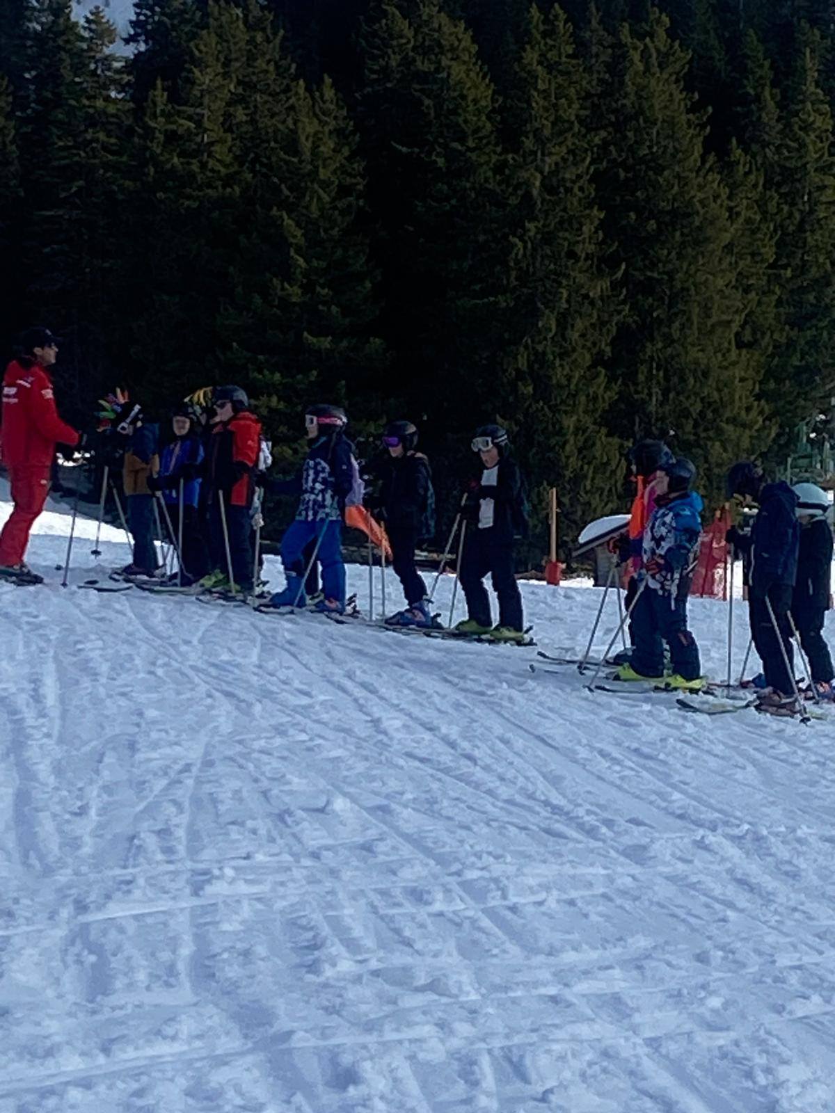 Pour le deuxième jour de ski, après la préparation de l’équipement et la répartition dans les différents groupes, les élèves ont rejoint les pistes avec les autres écoles présentes sur le site. L’ambiance est animée et les pistes sont très fréquentées, mais tout se déroule dans la bonne humeur