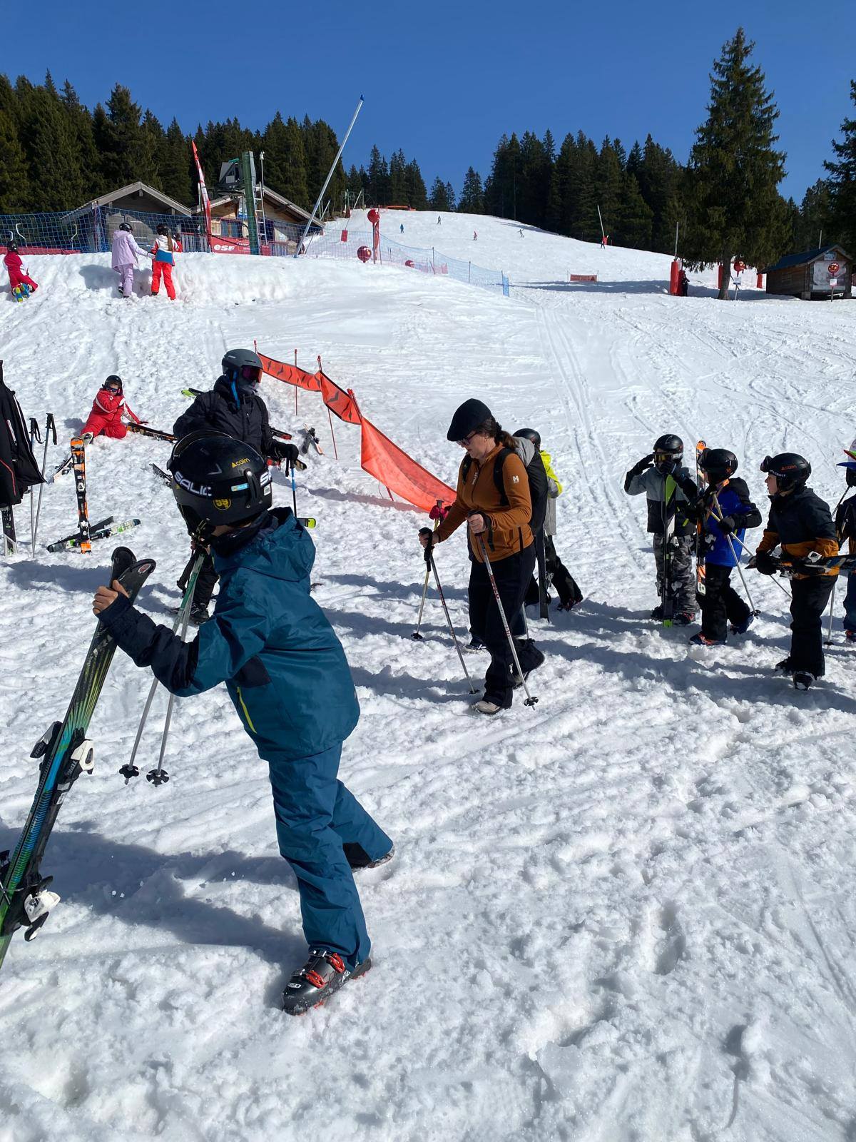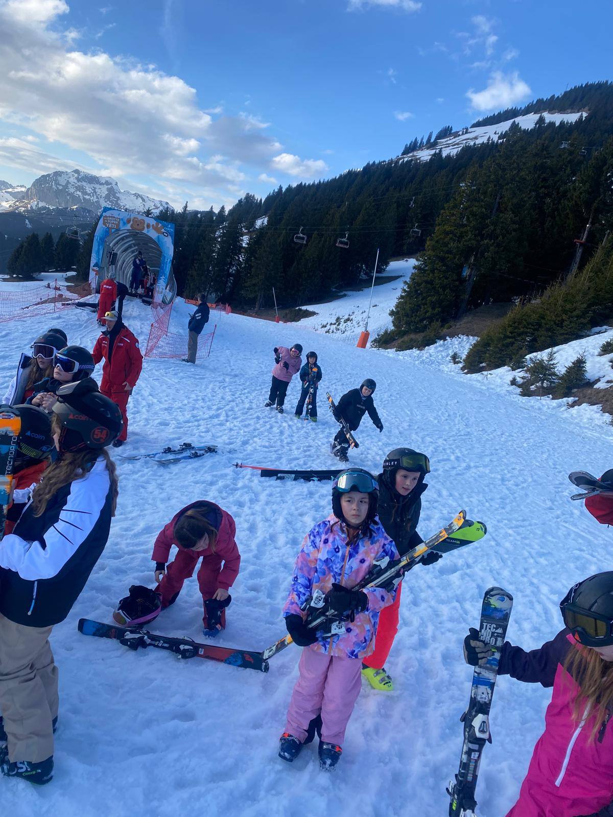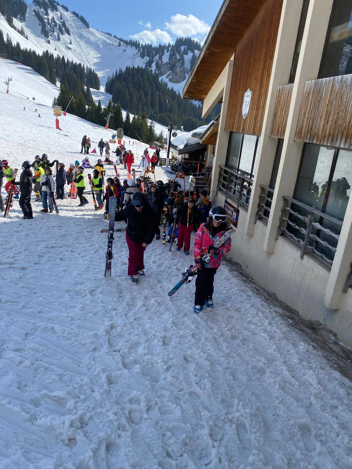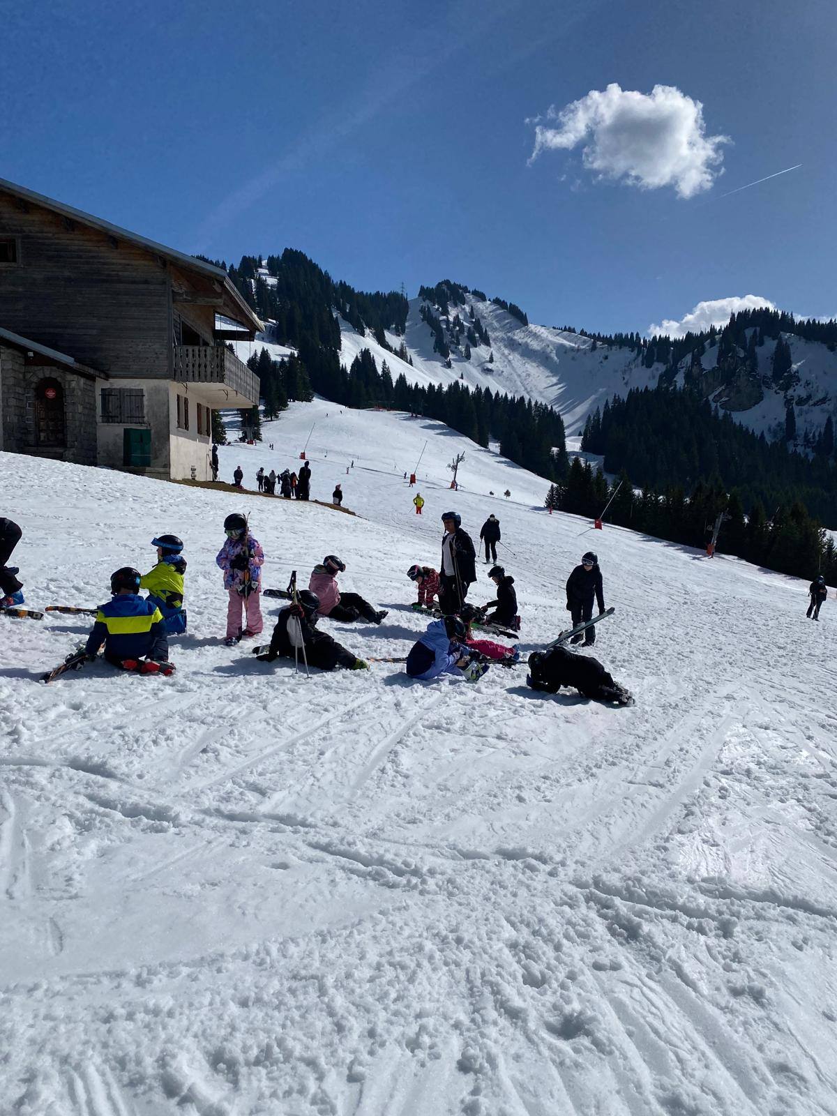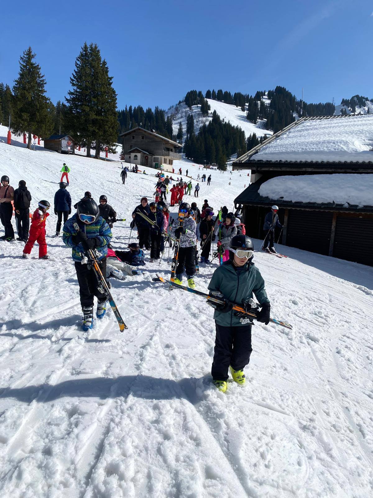 Pour le deuxième jour de ski, après la préparation de l’équipement et la répartition dans les différents groupes, les élèves ont rejoint les pistes avec les autres écoles présentes sur le site. L’ambiance est animée et les pistes sont très fréquentées, mais tout se déroule dans la bonne humeur