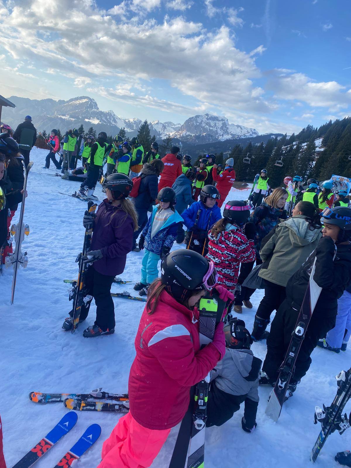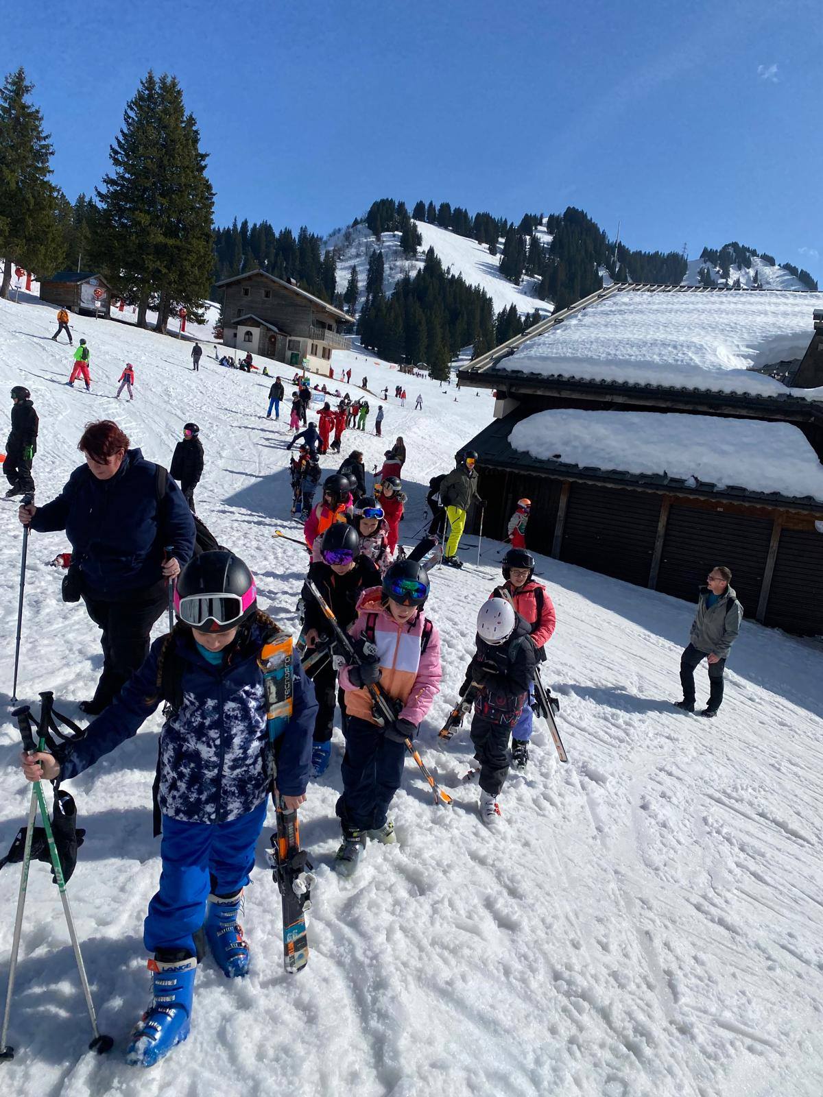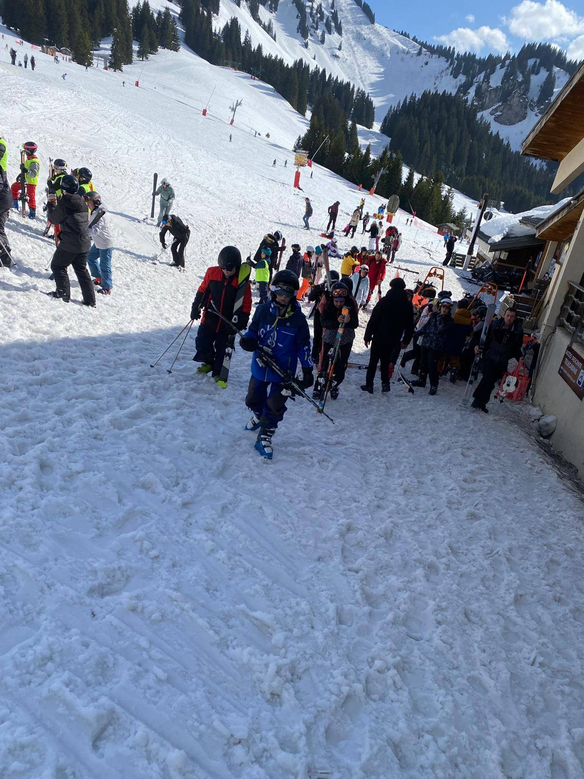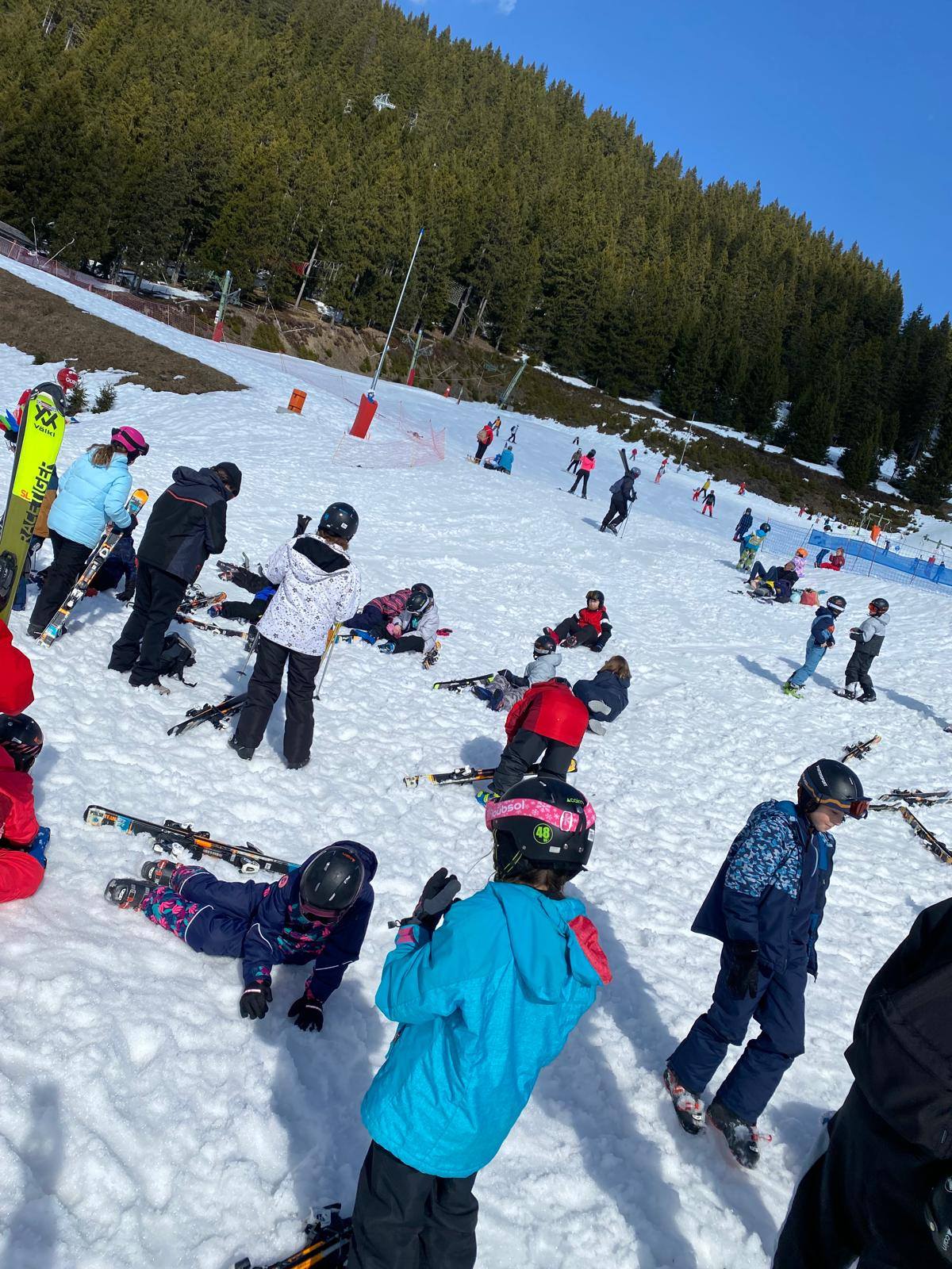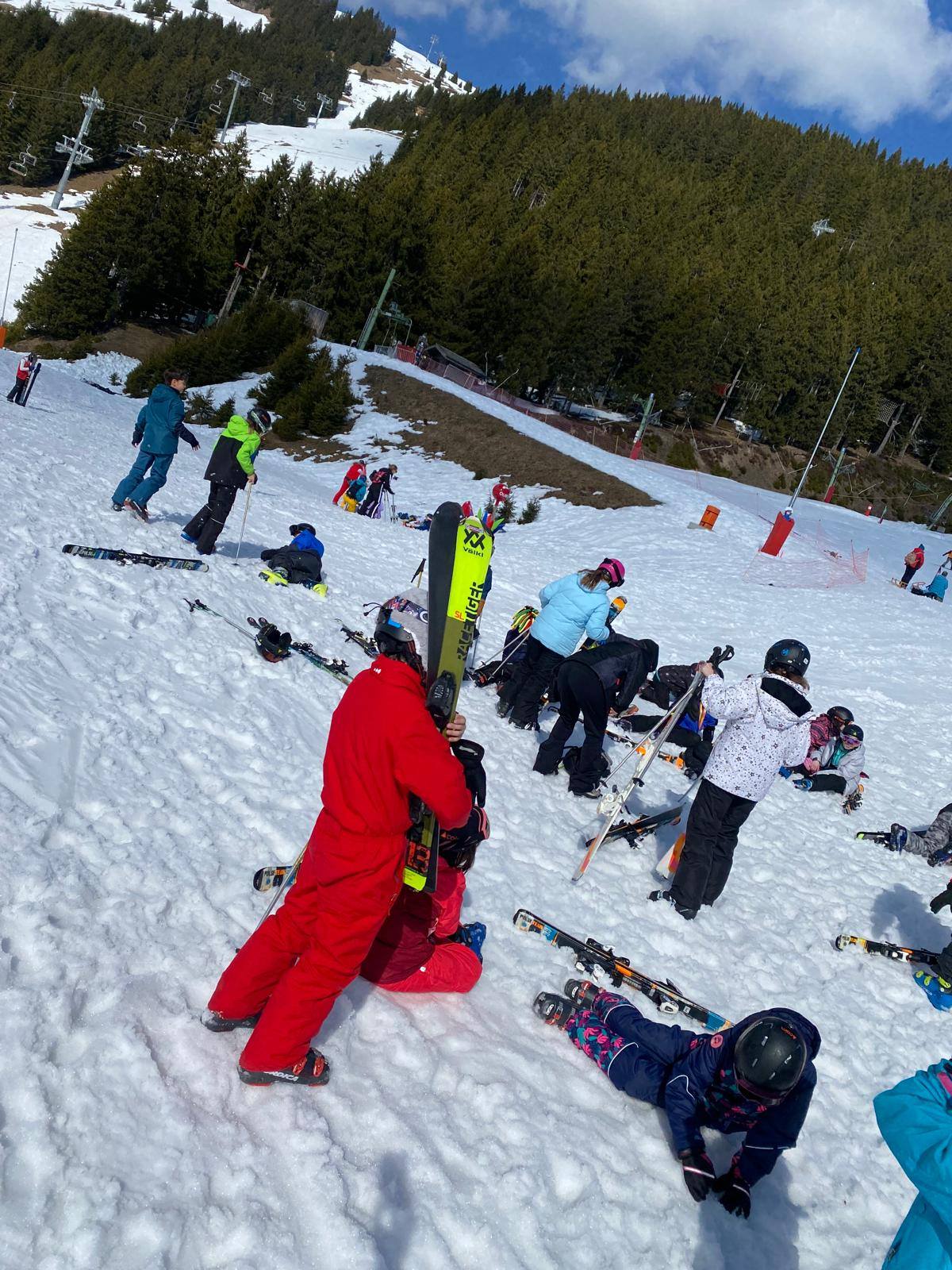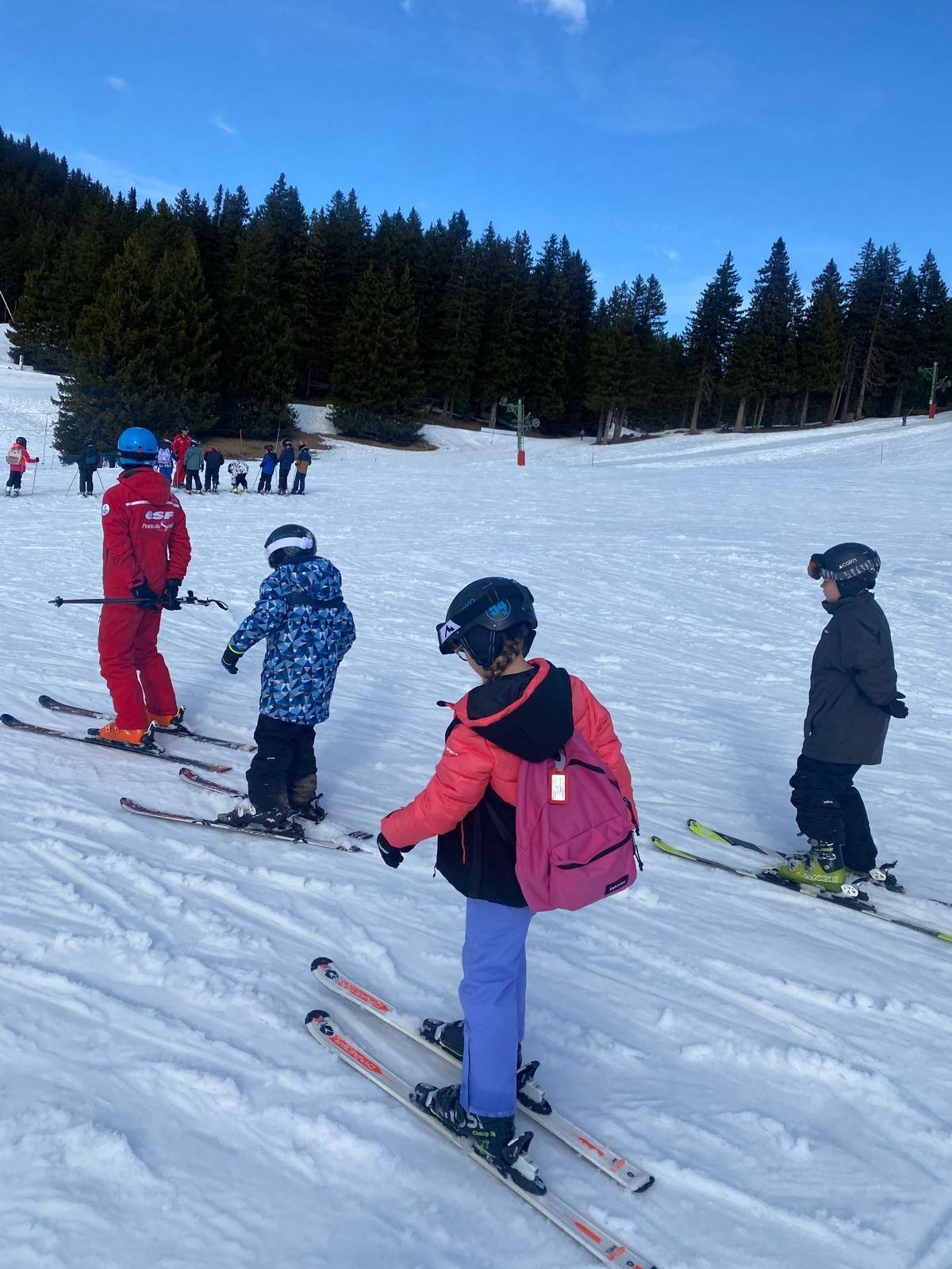 Pour le deuxième jour de ski, après la préparation de l’équipement et la répartition dans les différents groupes, les élèves ont rejoint les pistes avec les autres écoles présentes sur le site. L’ambiance est animée et les pistes sont très fréquentées, mais tout se déroule dans la bonne humeur