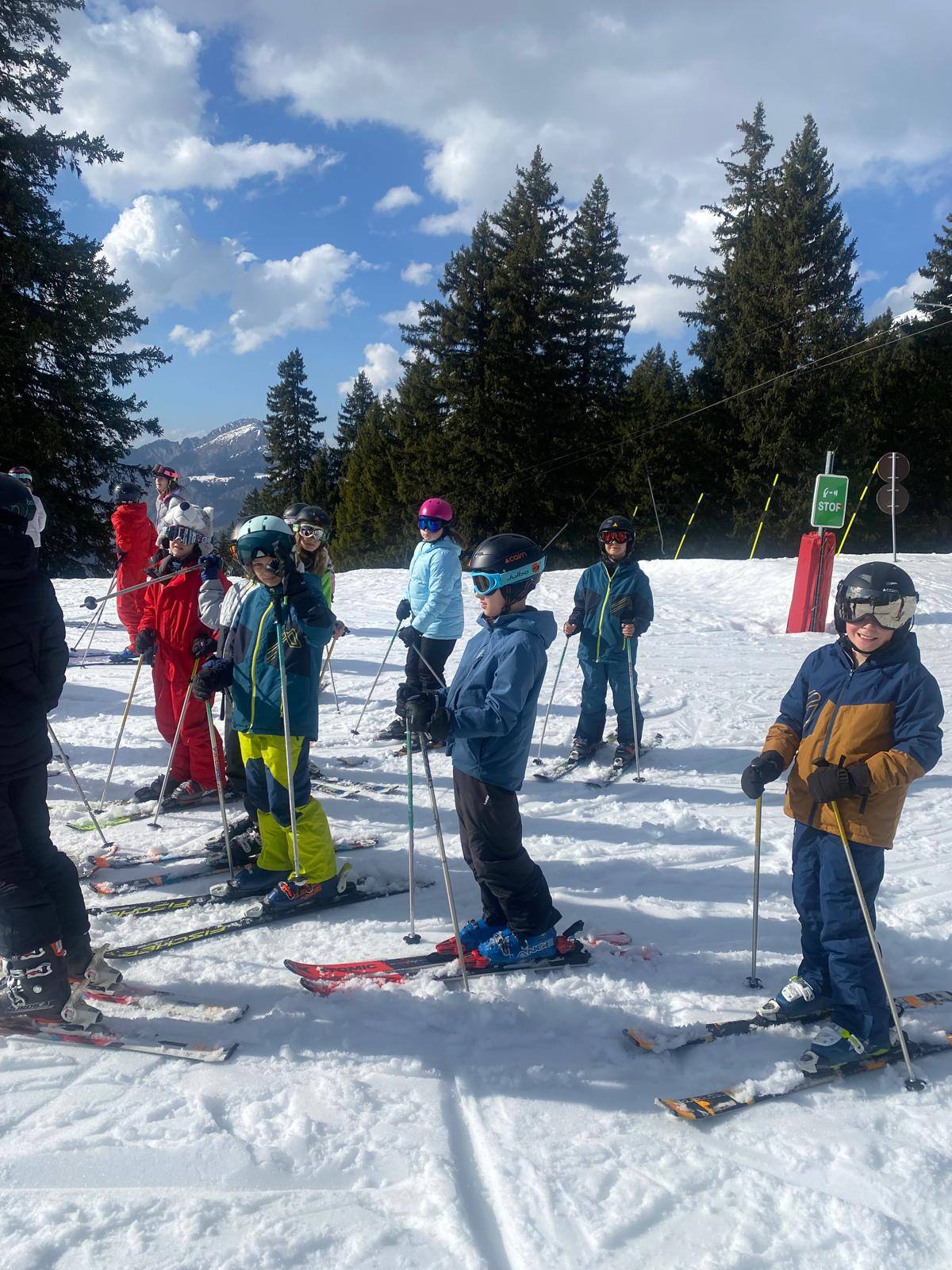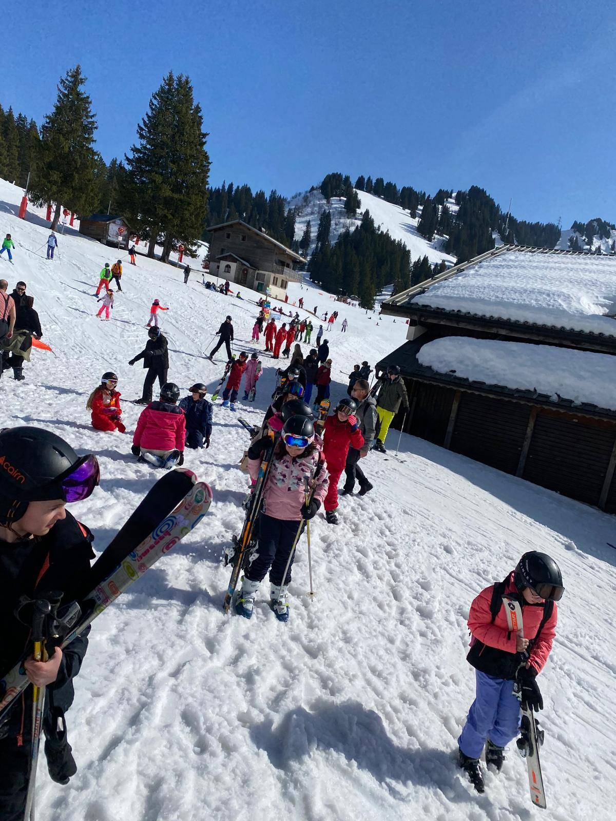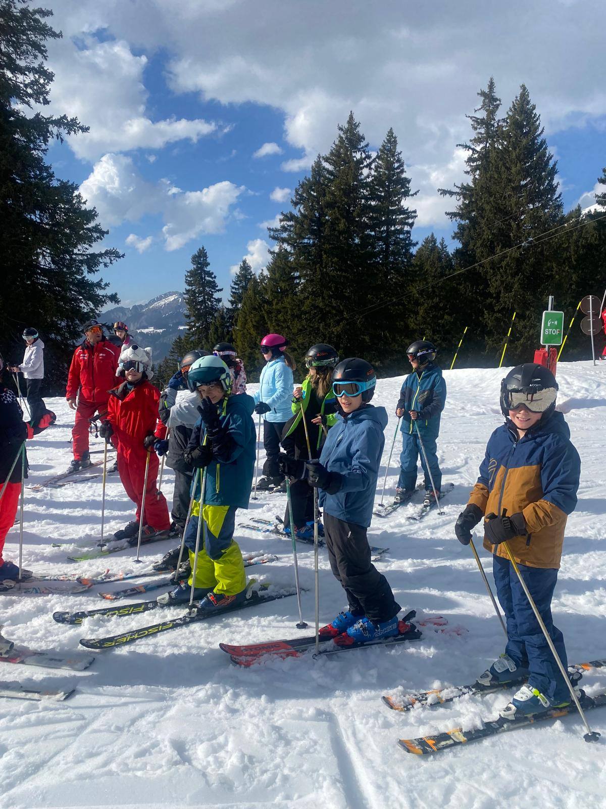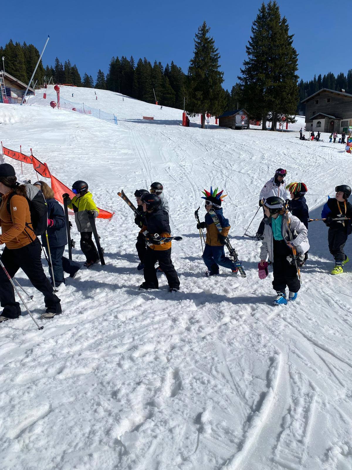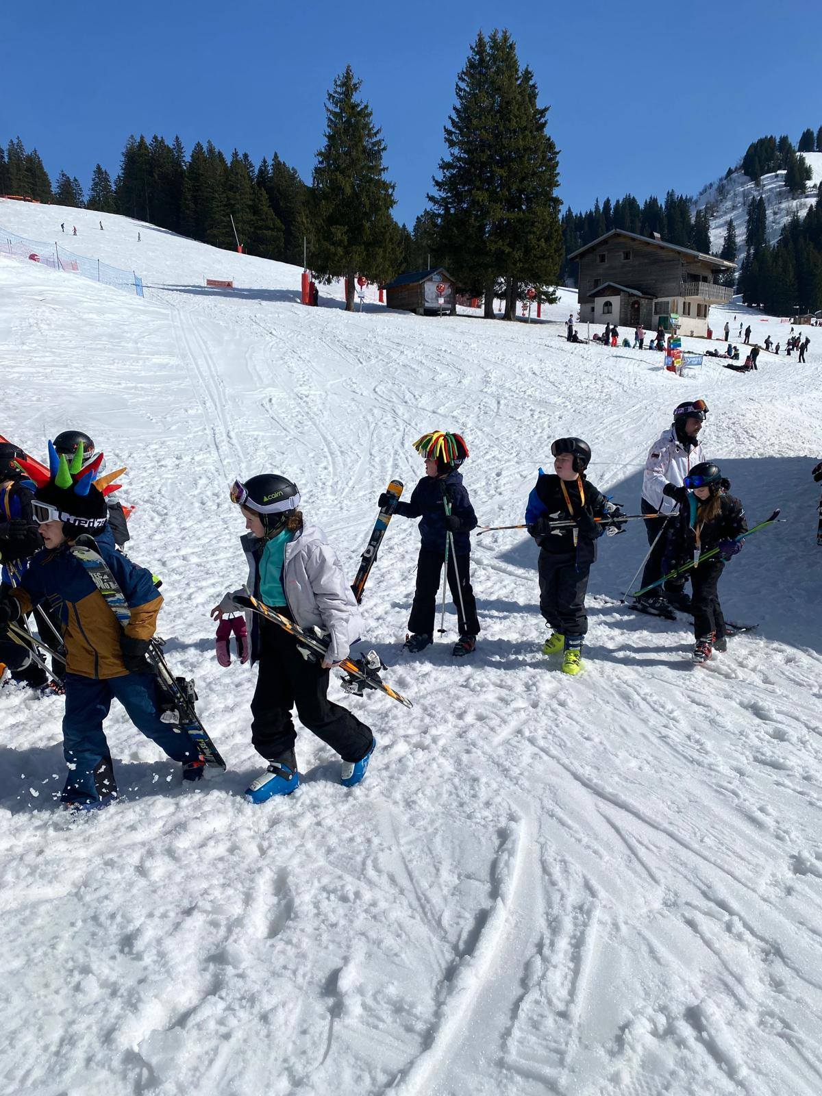 Pour le deuxième jour de ski, après la préparation de l’équipement et la répartition dans les différents groupes, les élèves ont rejoint les pistes avec les autres écoles présentes sur le site. L’ambiance est animée et les pistes sont très fréquentées, mais tout se déroule dans la bonne humeur