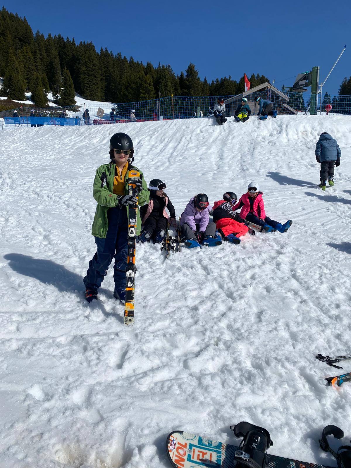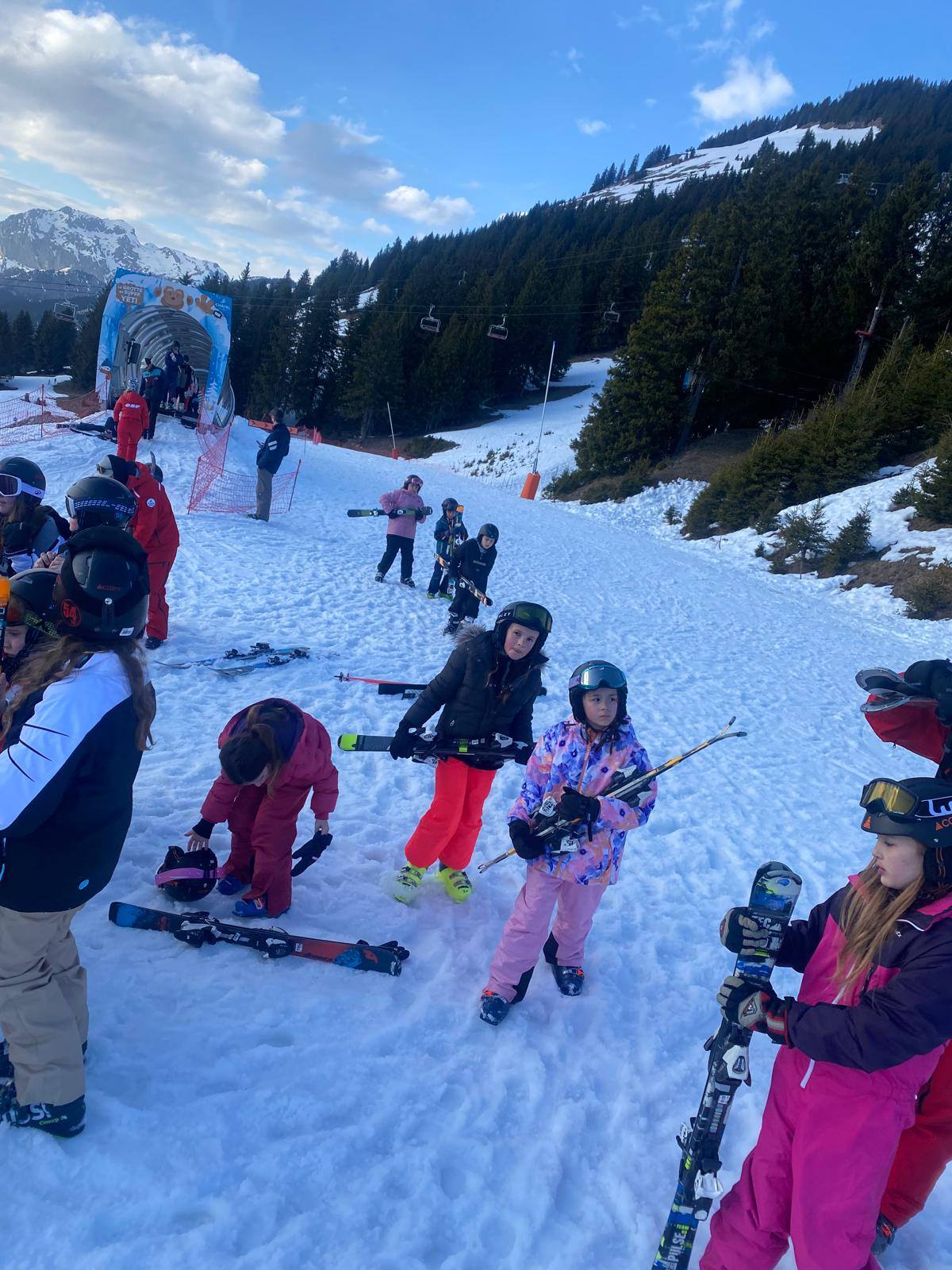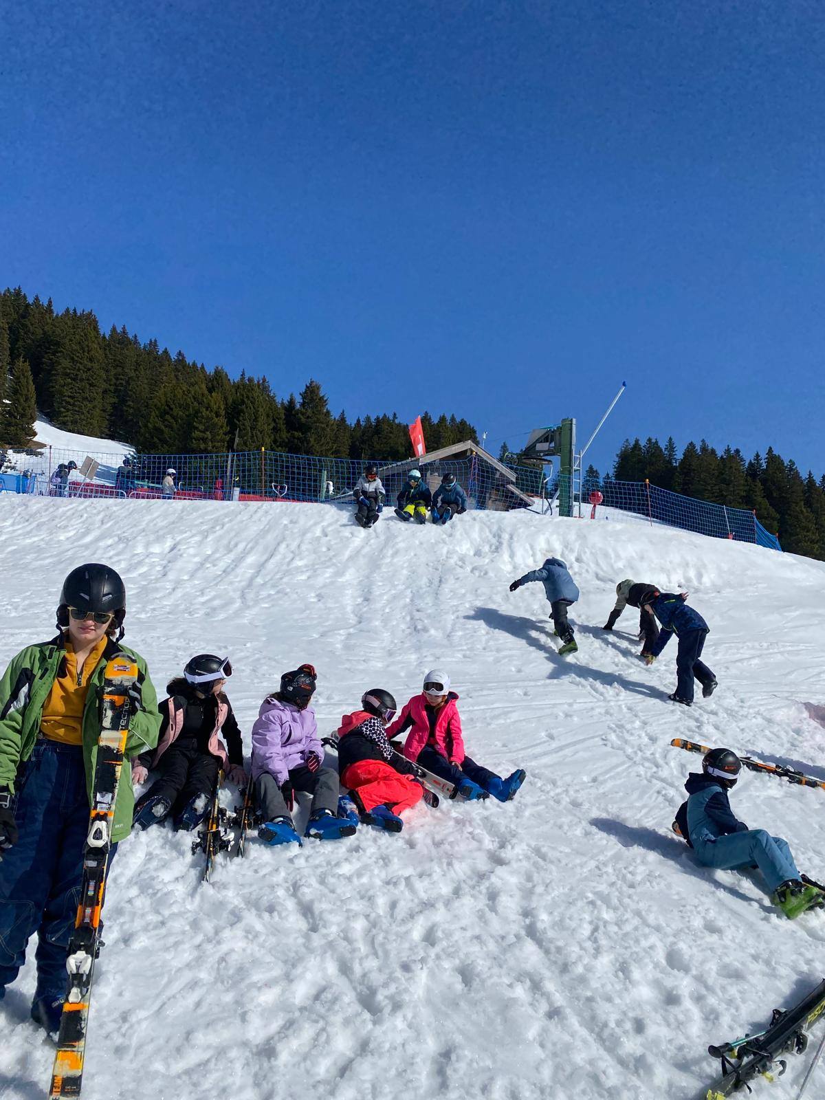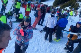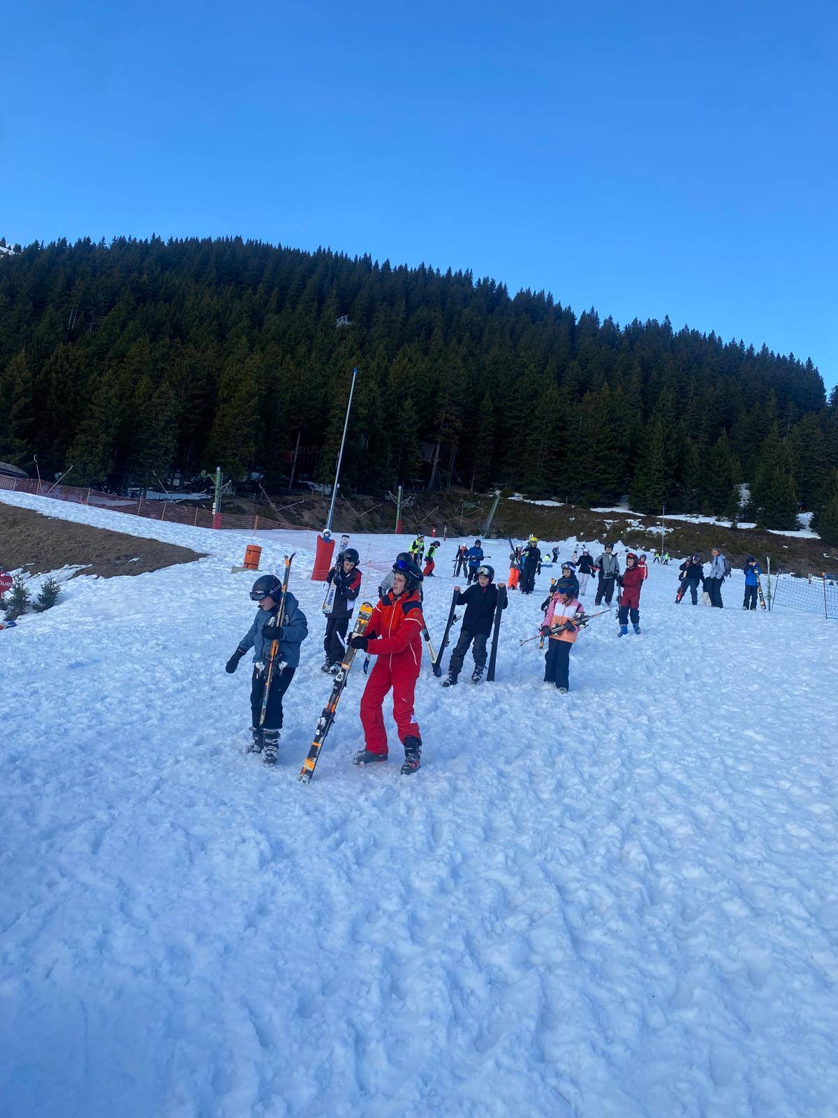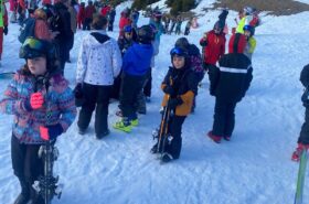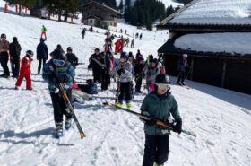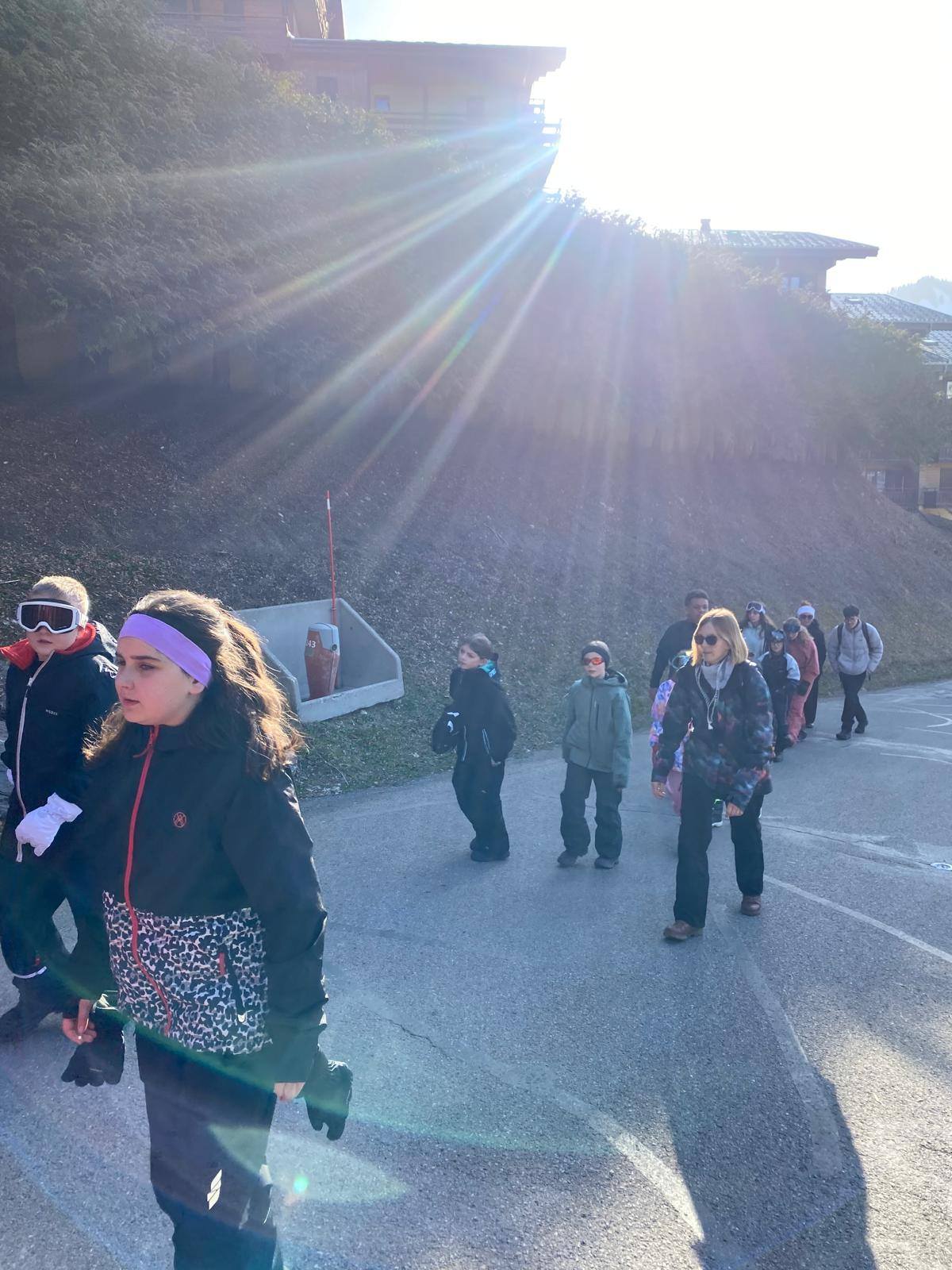 Pour le deuxième jour de ski, après la préparation de l’équipement et la répartition dans les différents groupes, les élèves ont rejoint les pistes avec les autres écoles présentes sur le site. L’ambiance est animée et les pistes sont très fréquentées, mais tout se déroule dans la bonne humeur