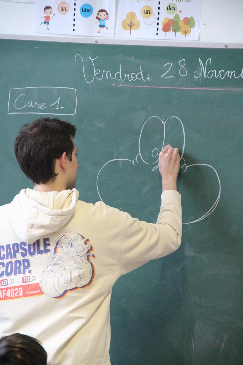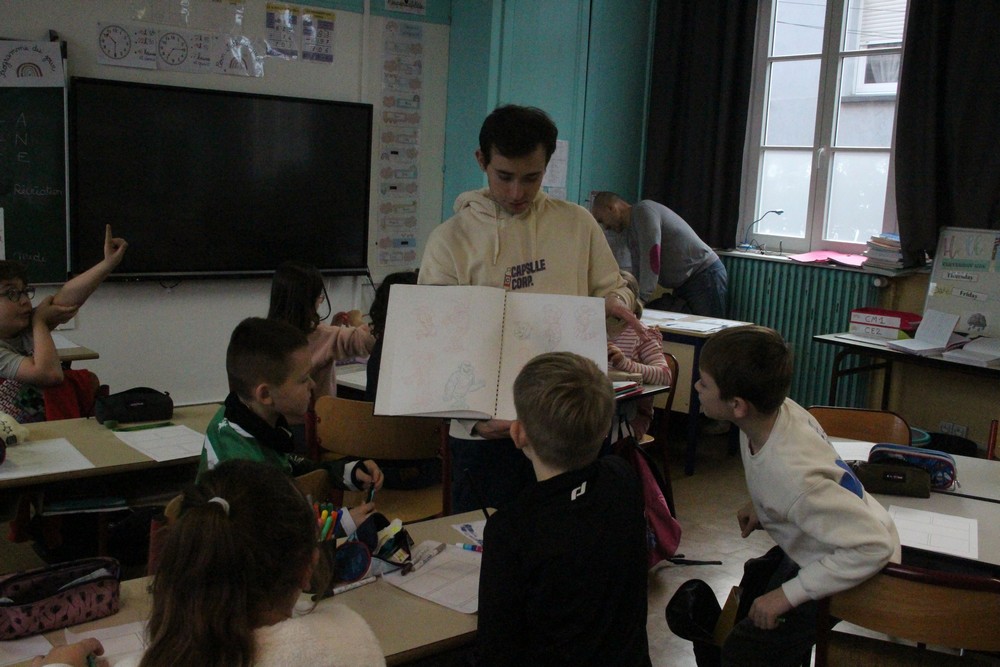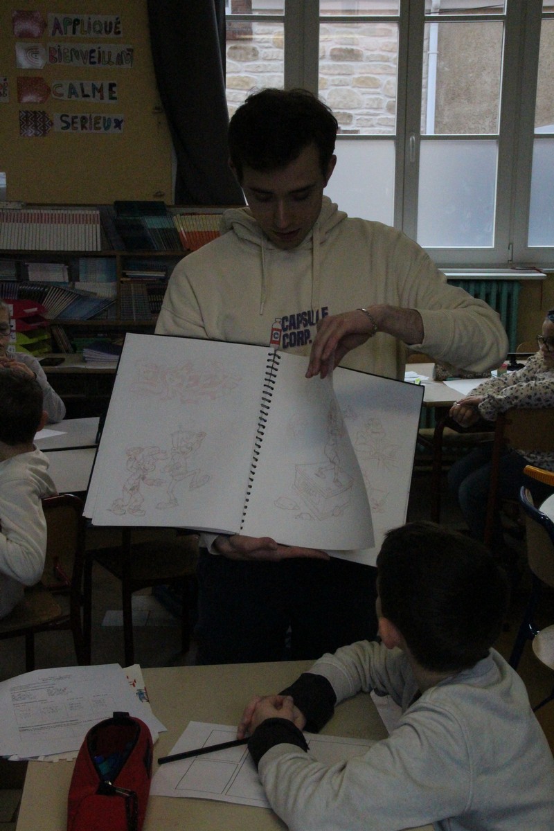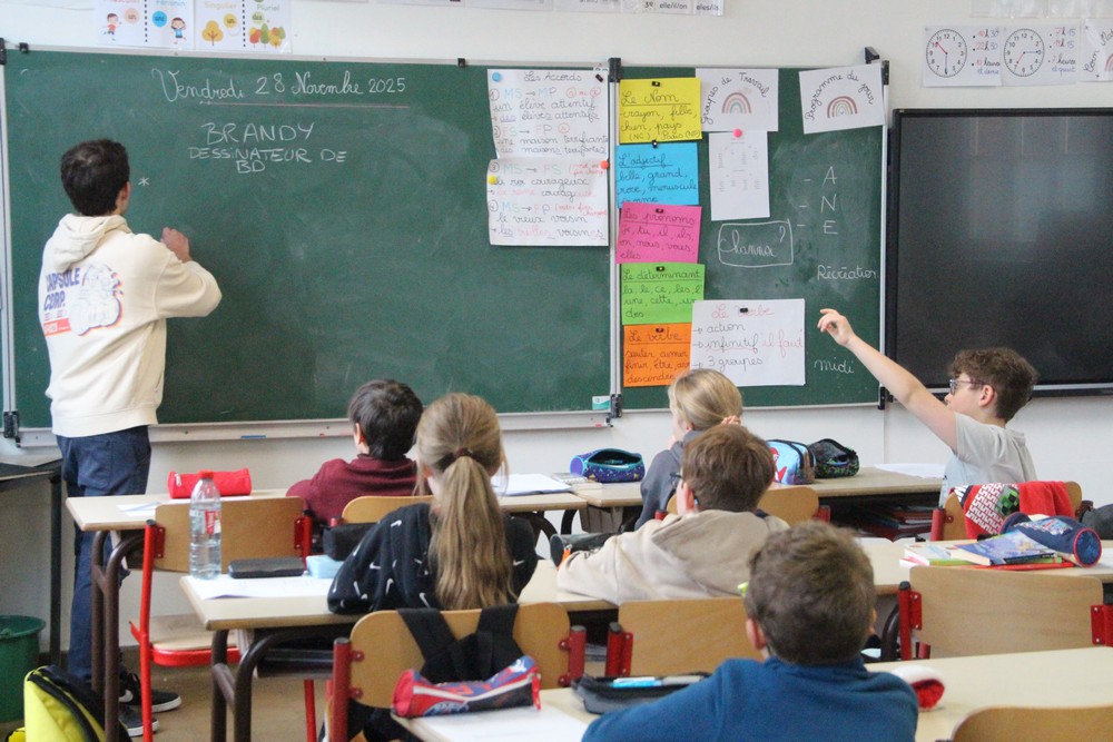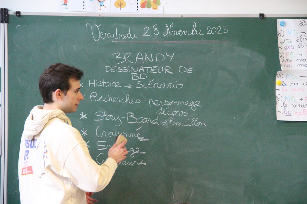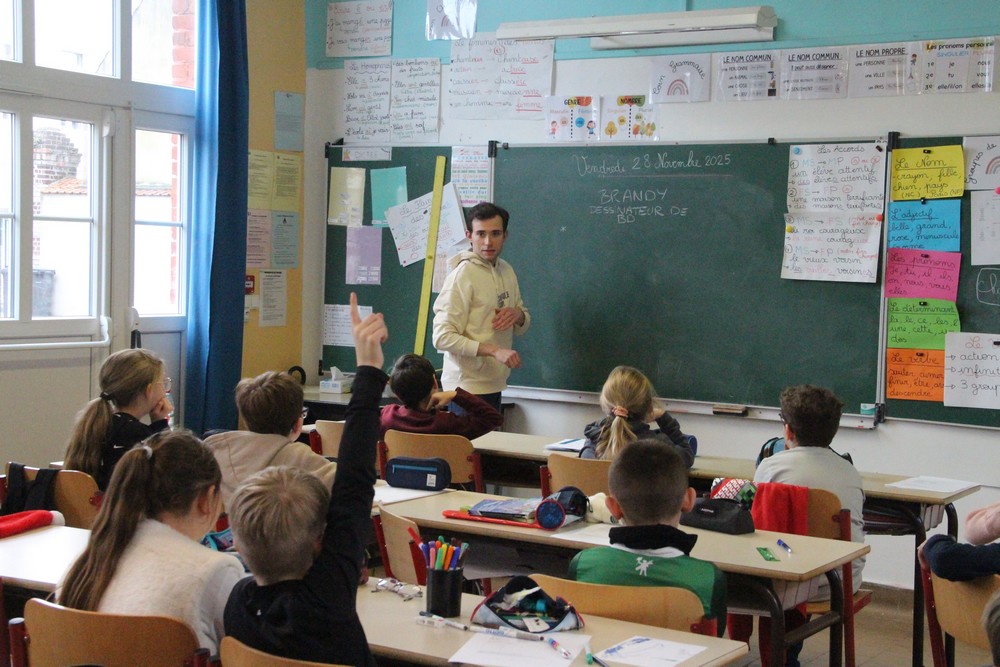 À l’occasion du salon « Je lis jeu’nesse », qui s’est tenu les 29 et 30 novembre à la salle de la Corderie, les élèves de CE2/CM1 de l’école Jean Macé ont bénéficié d’un moment privilégié ce vendredi 28 novembre après-midi. Ils ont accueilli Brandon Lecocq, dessinateur et illustrateur de bande dessinée connu sous le pseudo Brandy, venu leur proposer un atelier d’initiation à la création d’une BD. L’artiste travaille notamment sur « Les Graffeurs », une série scénarisée par Olivier Andrieu, l’un des auteurs d’Iznogoud, et publiée depuis juillet 2023 dans Pif Gadget.