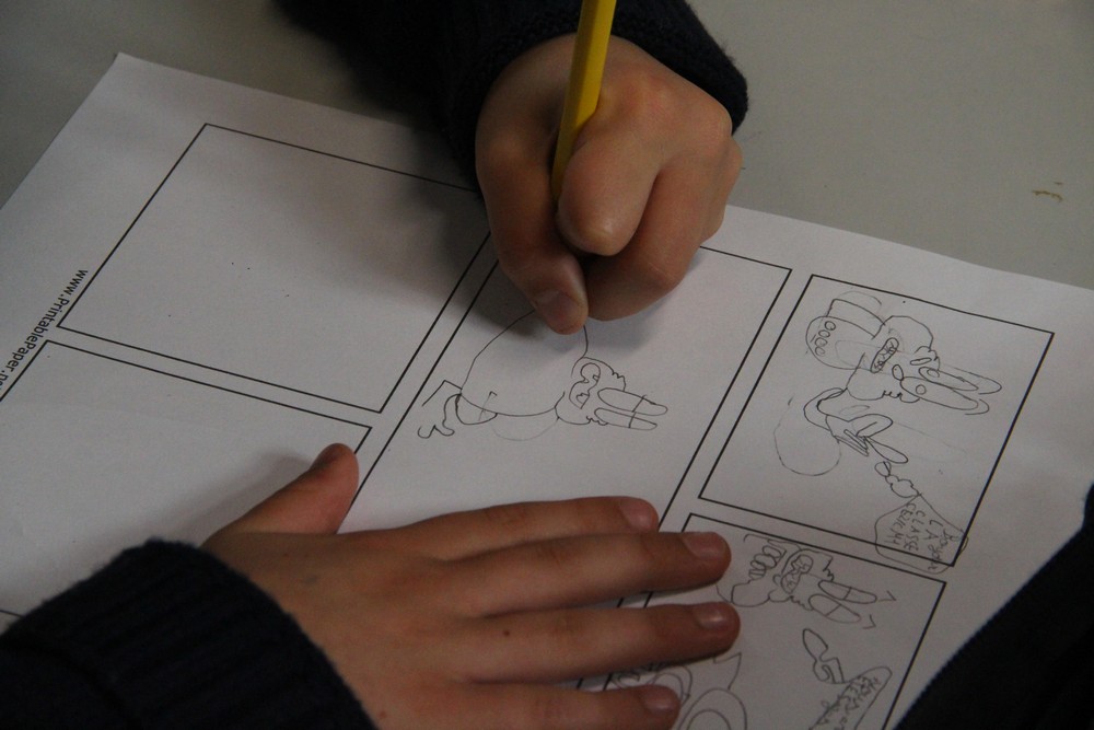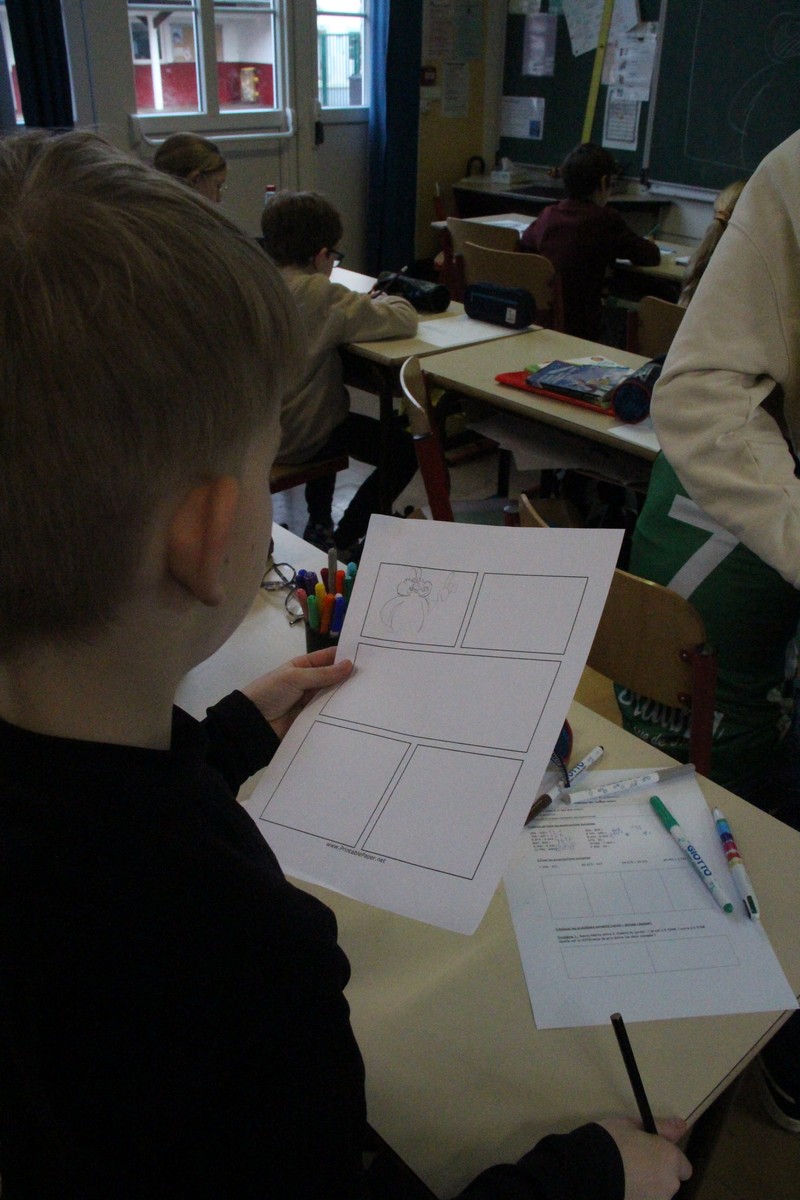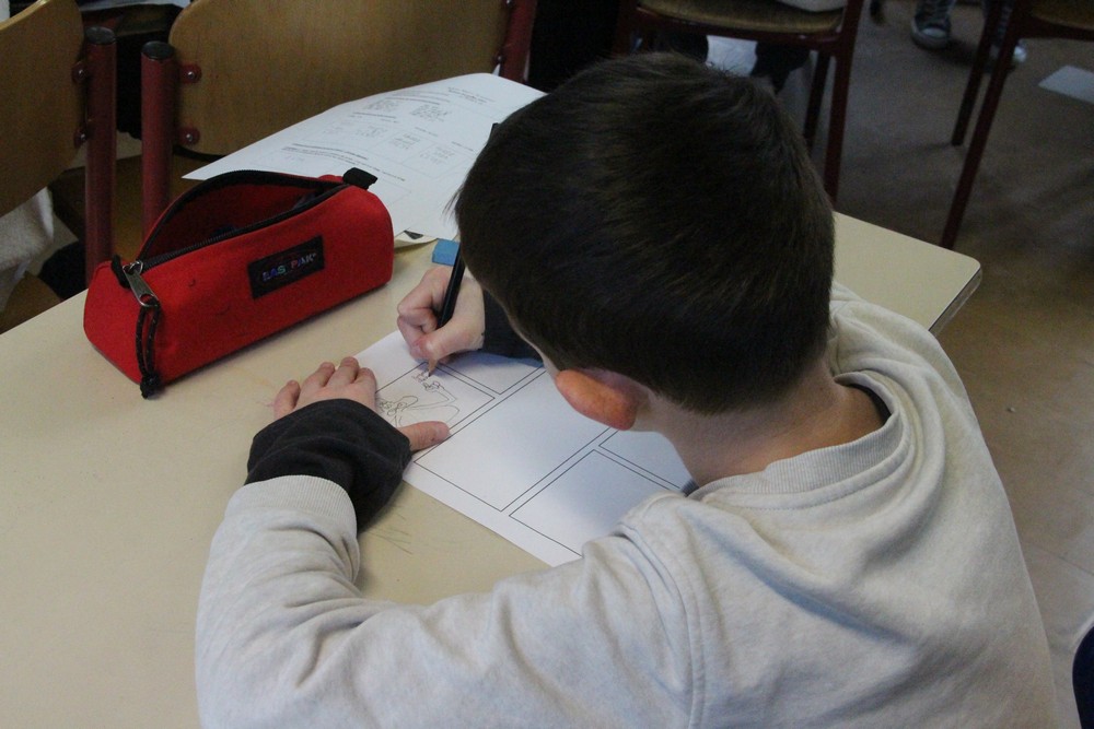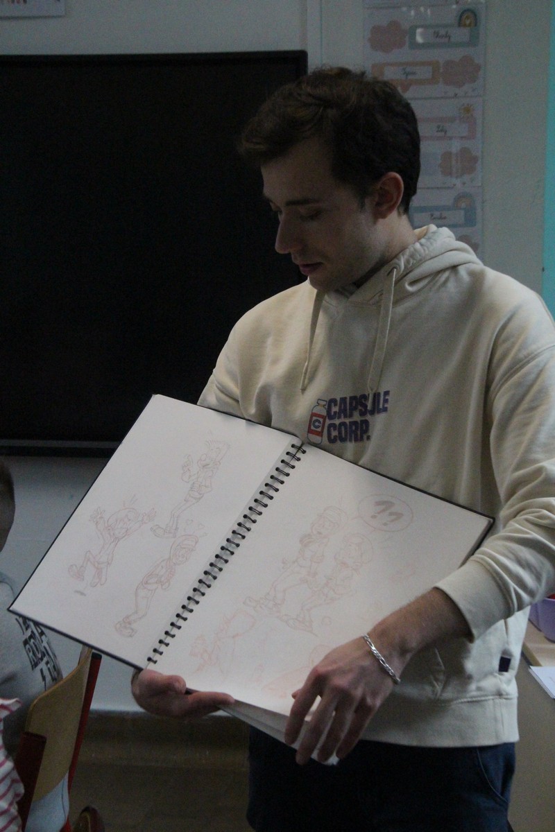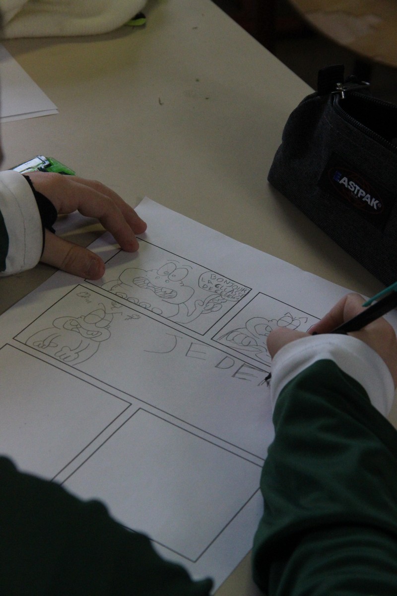 Dans un premier temps, l’intervenant a commencé par expliquer aux élèves les différentes étapes nécessaires pour réaliser une bande dessinée : l’histoire et le scénario, les recherches (personnages et décors…), le story-board (brouillon), crayonné, l’encrage et la couleur. Cette introduction a permis aux jeunes de comprendre tout le cheminement qui mène à une planche de BD aboutie.
