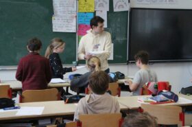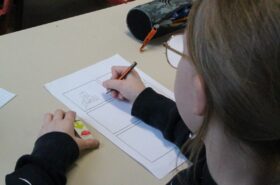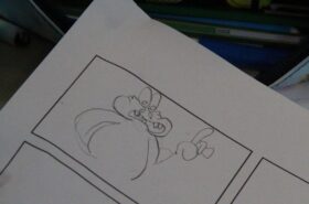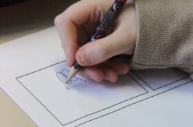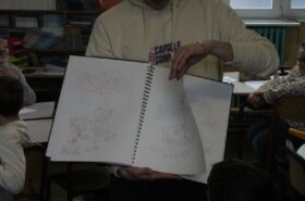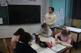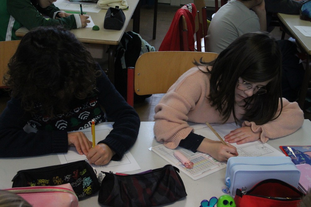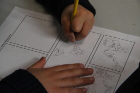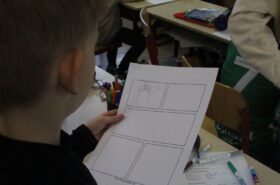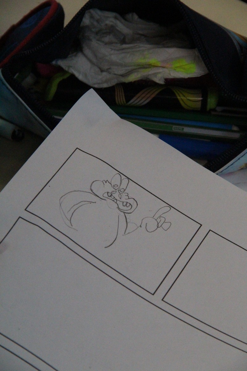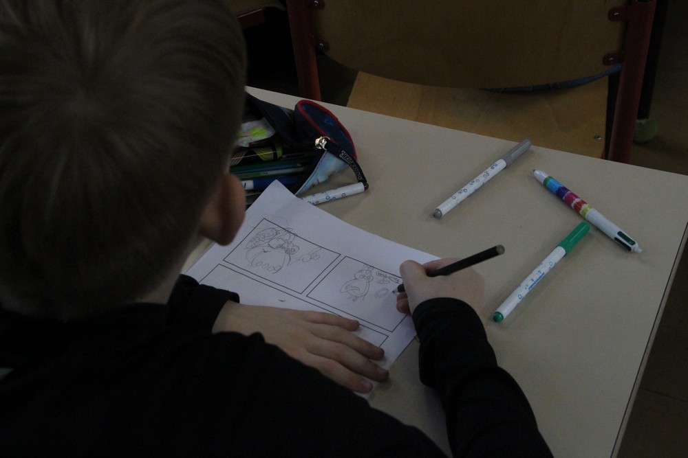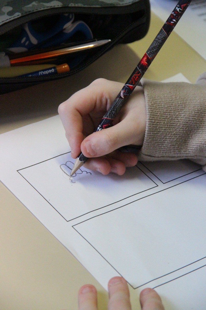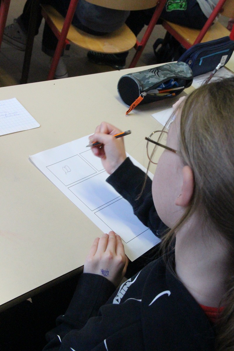 Dans un premier temps, l’intervenant a commencé par expliquer aux élèves les différentes étapes nécessaires pour réaliser une bande dessinée : l’histoire et le scénario, les recherches (personnages et décors…), le story-board (brouillon), crayonné, l’encrage et la couleur. Cette introduction a permis aux jeunes de comprendre tout le cheminement qui mène à une planche de BD aboutie.