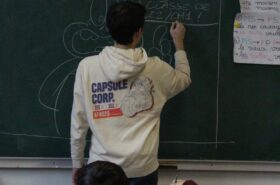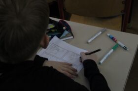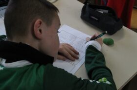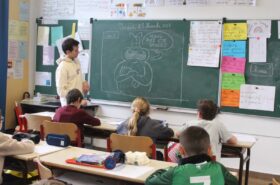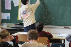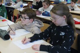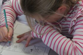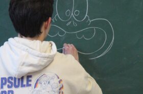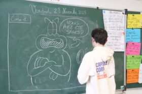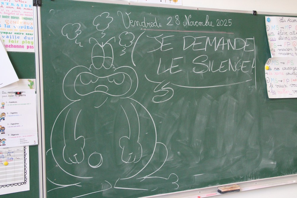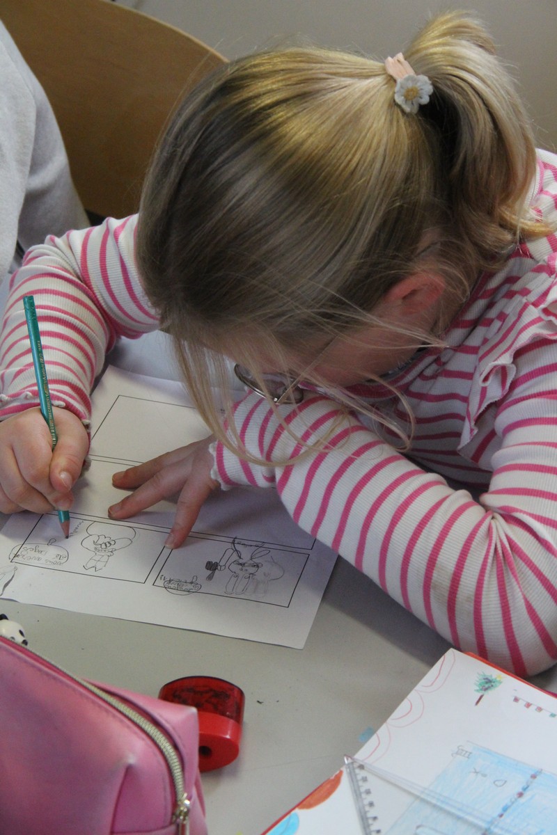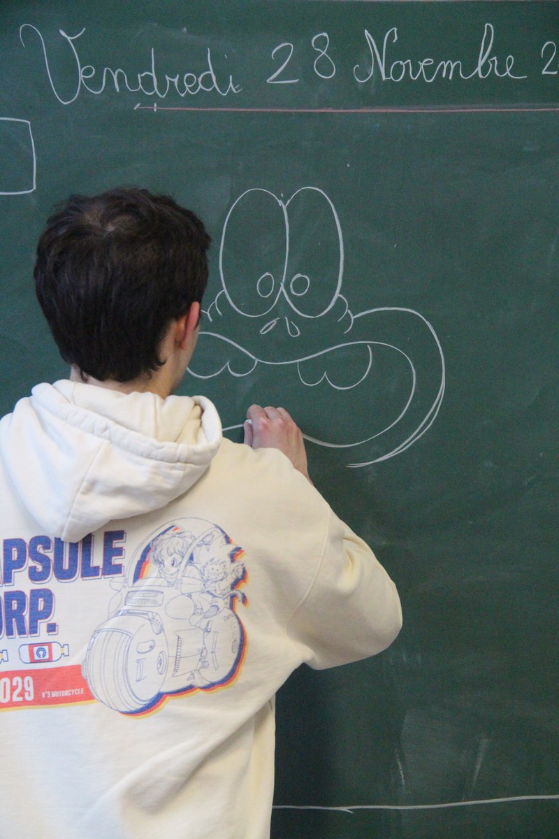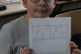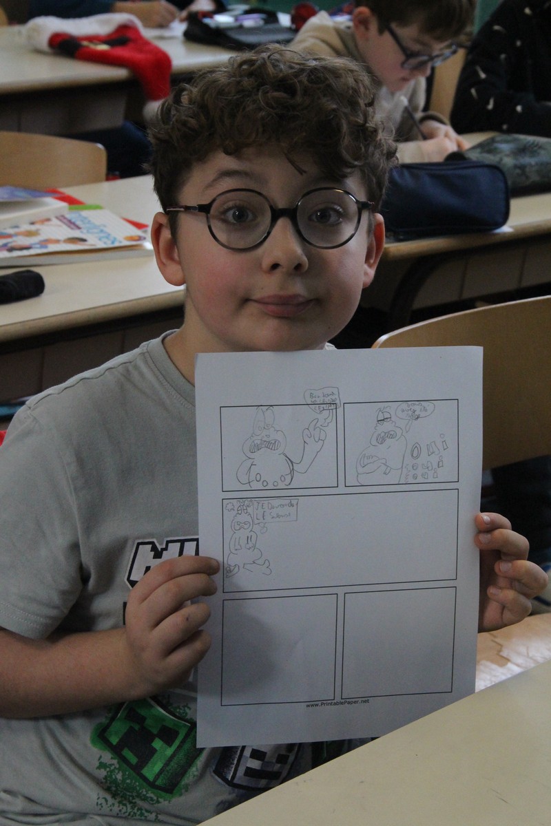 La séance s’est poursuivie par une mise en pratique. Chaque élève a reçu une feuille comportant une planche vierge afin de réaliser sa propre bande dessinée en compagnie du professionnel. Pour chacune des étapes, Brandy dessinait d’abord au tableau, donnant un exemple concret que les enfants pouvaient ensuite reproduire sur leur feuille. Ils ont ainsi appris à respecter les proportions, à utiliser des onomatopées et à travailler le lettrage (bulles de texte). Ensemble, ils ont illustré les aventures de « Gronouille », un personnage inventé spécialement pour l’occasion.
