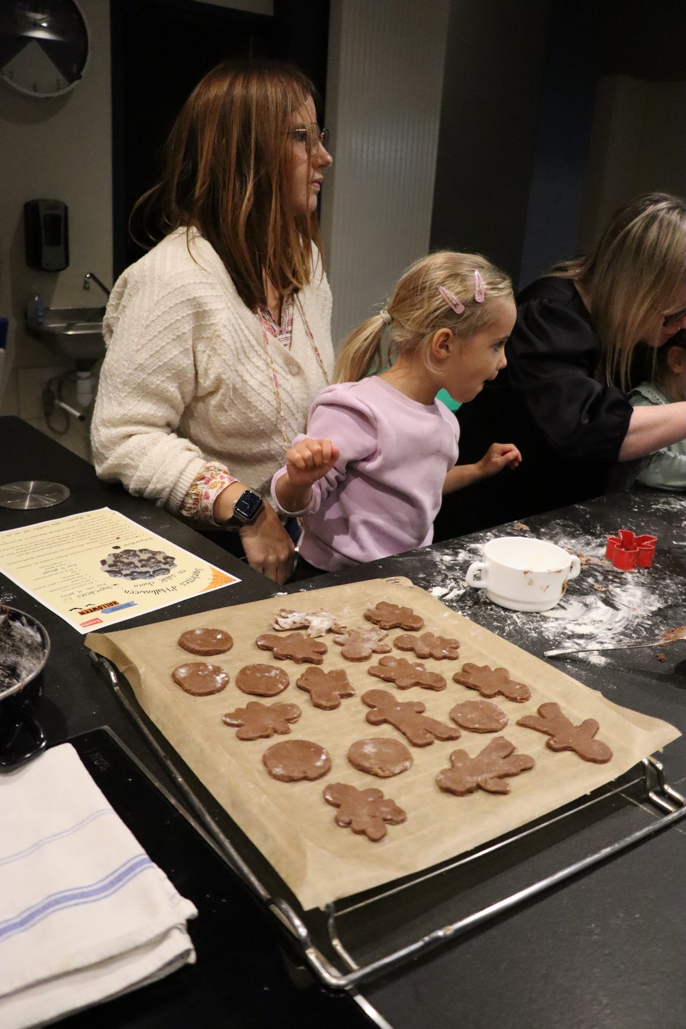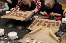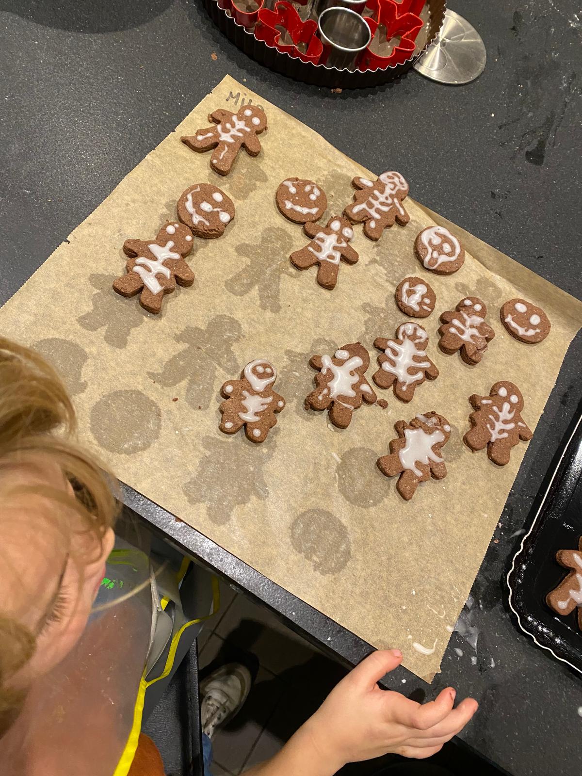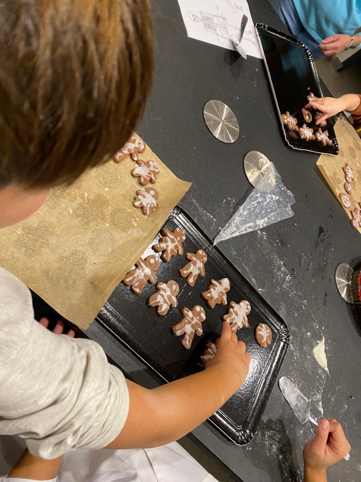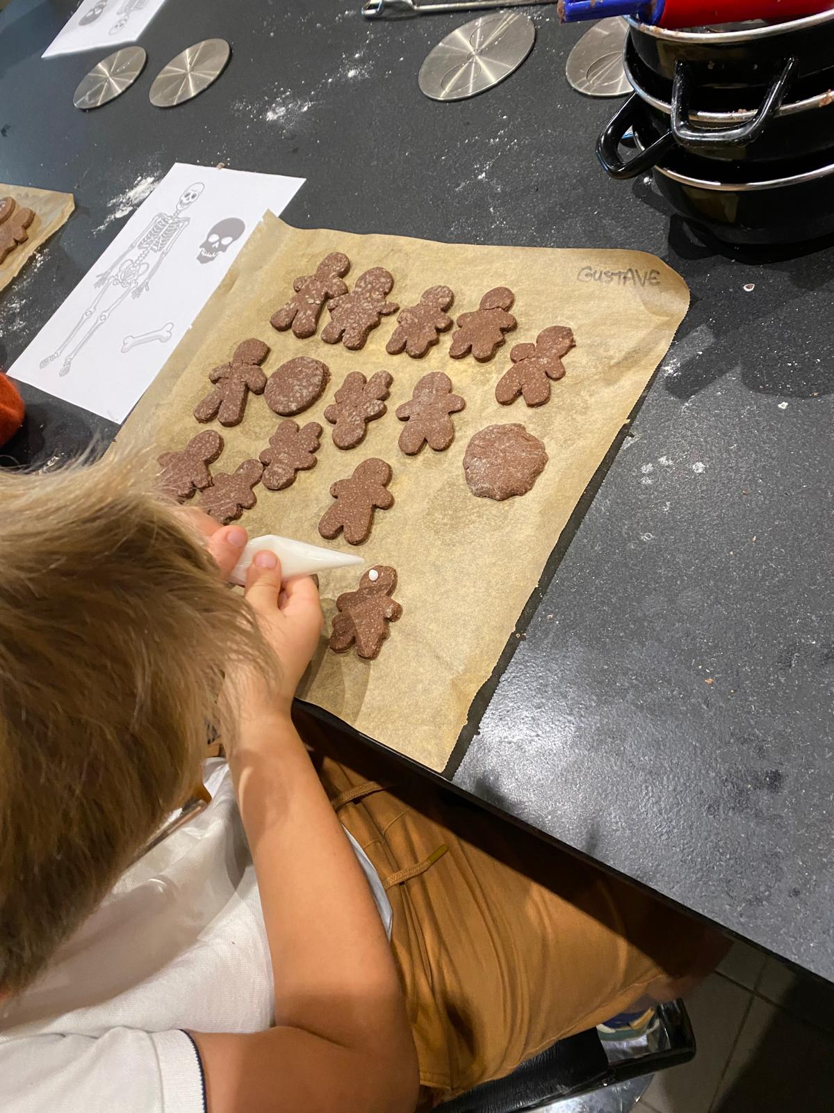 Avant de commencer l’atelier, les petits pâtissiers se sont lavés les mains. Ils ont ensuite pris plaisir à malaxer du beurre, de la poudre de cacao et du sucre cassonade auxquels ils ont ajouté un œuf et de la farine afin d’obtenir une pâte homogène. À l’aide d’emporte-pièces en forme de personnages, les enfants ont découpé les silhouettes qu’ils ont passé au four pendant une dizaine de minutes. Une fois refroidis, ils ont dessiné sur les biscuits des crânes et le squelette avec un glaçage blanc obtenu en mélangeant du sucre glace avec un peu d’eau. Le temps est enfin arrivé de s’installer autour de la table et de déguster ces succulents gâteaux. Une rumeur prétend que quelques-uns sont tombés sur un os !