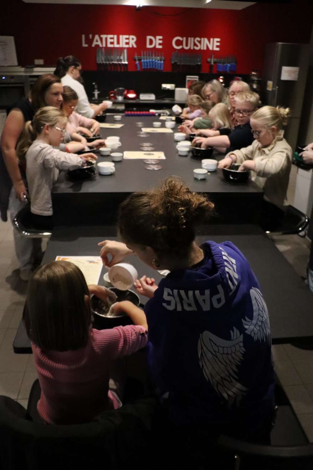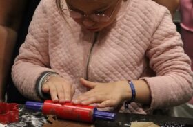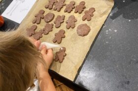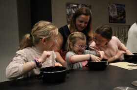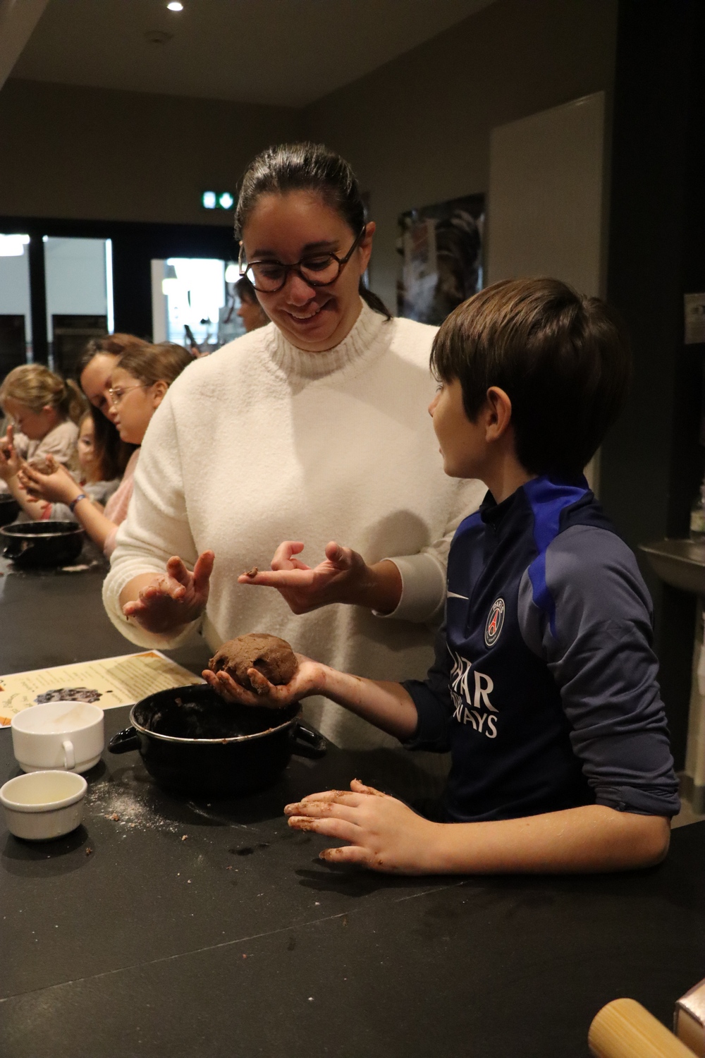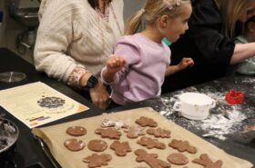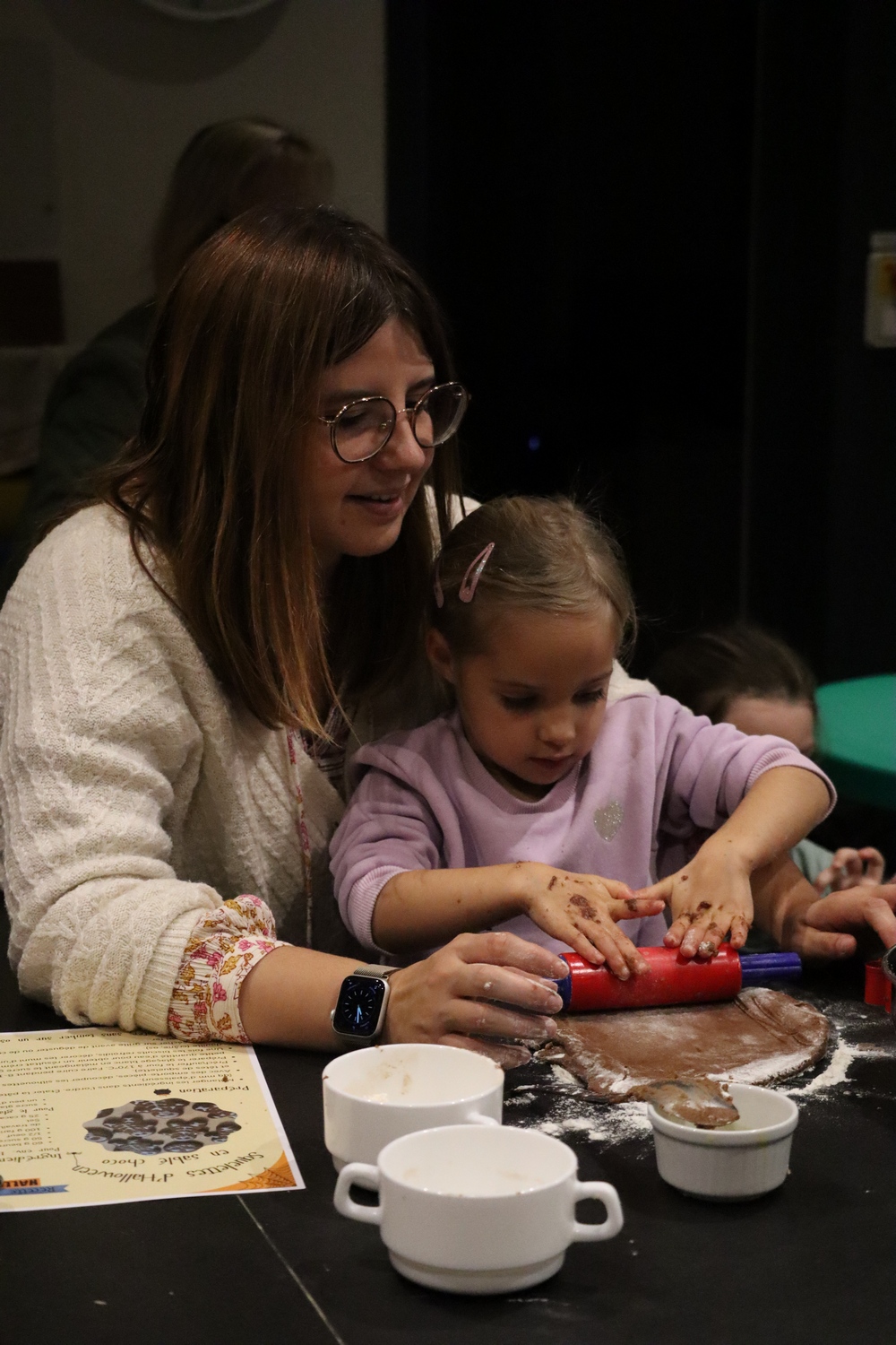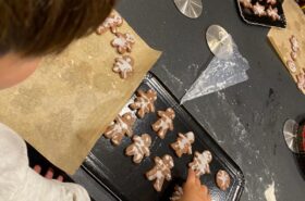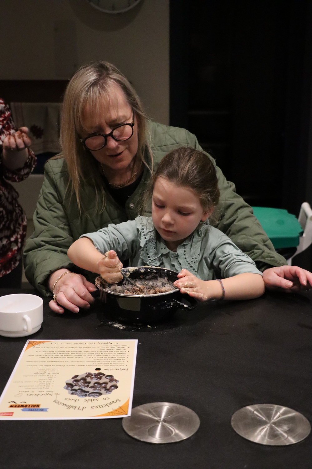 Avant de commencer l’atelier, les petits pâtissiers se sont lavés les mains. Ils ont ensuite pris plaisir à malaxer du beurre, de la poudre de cacao et du sucre cassonade auxquels ils ont ajouté un œuf et de la farine afin d’obtenir une pâte homogène. À l’aide d’emporte-pièces en forme de personnages, les enfants ont découpé les silhouettes qu’ils ont passé au four pendant une dizaine de minutes. Une fois refroidis, ils ont dessiné sur les biscuits des crânes et le squelette avec un glaçage blanc obtenu en mélangeant du sucre glace avec un peu d’eau. Le temps est enfin arrivé de s’installer autour de la table et de déguster ces succulents gâteaux. Une rumeur prétend que quelques-uns sont tombés sur un os !