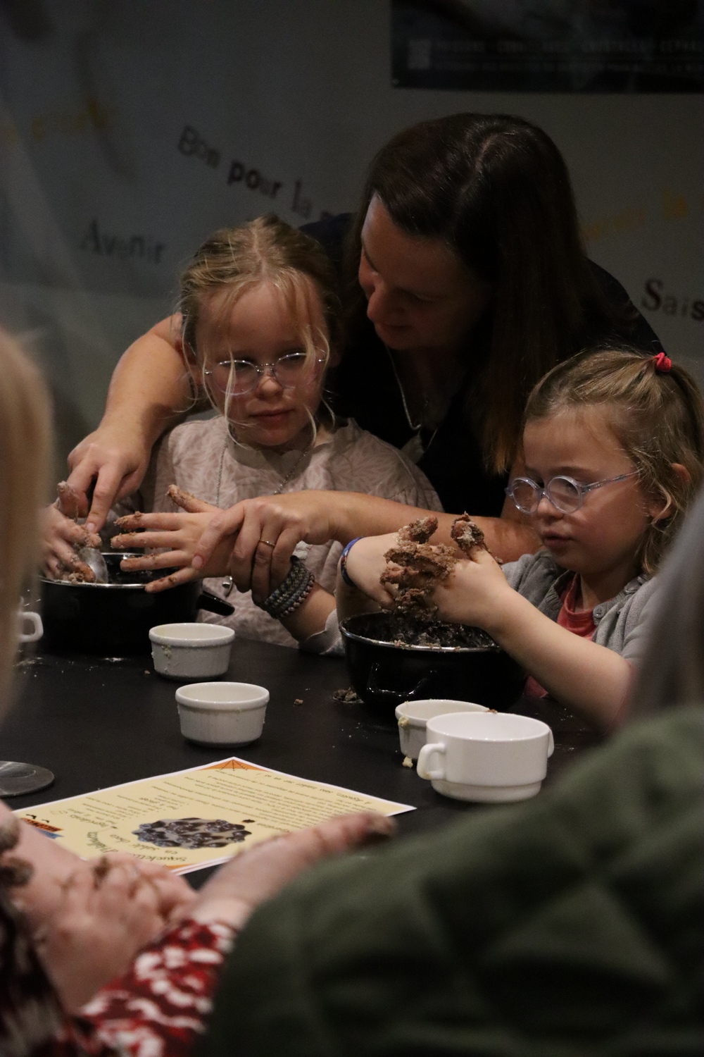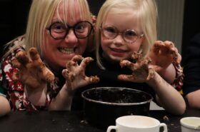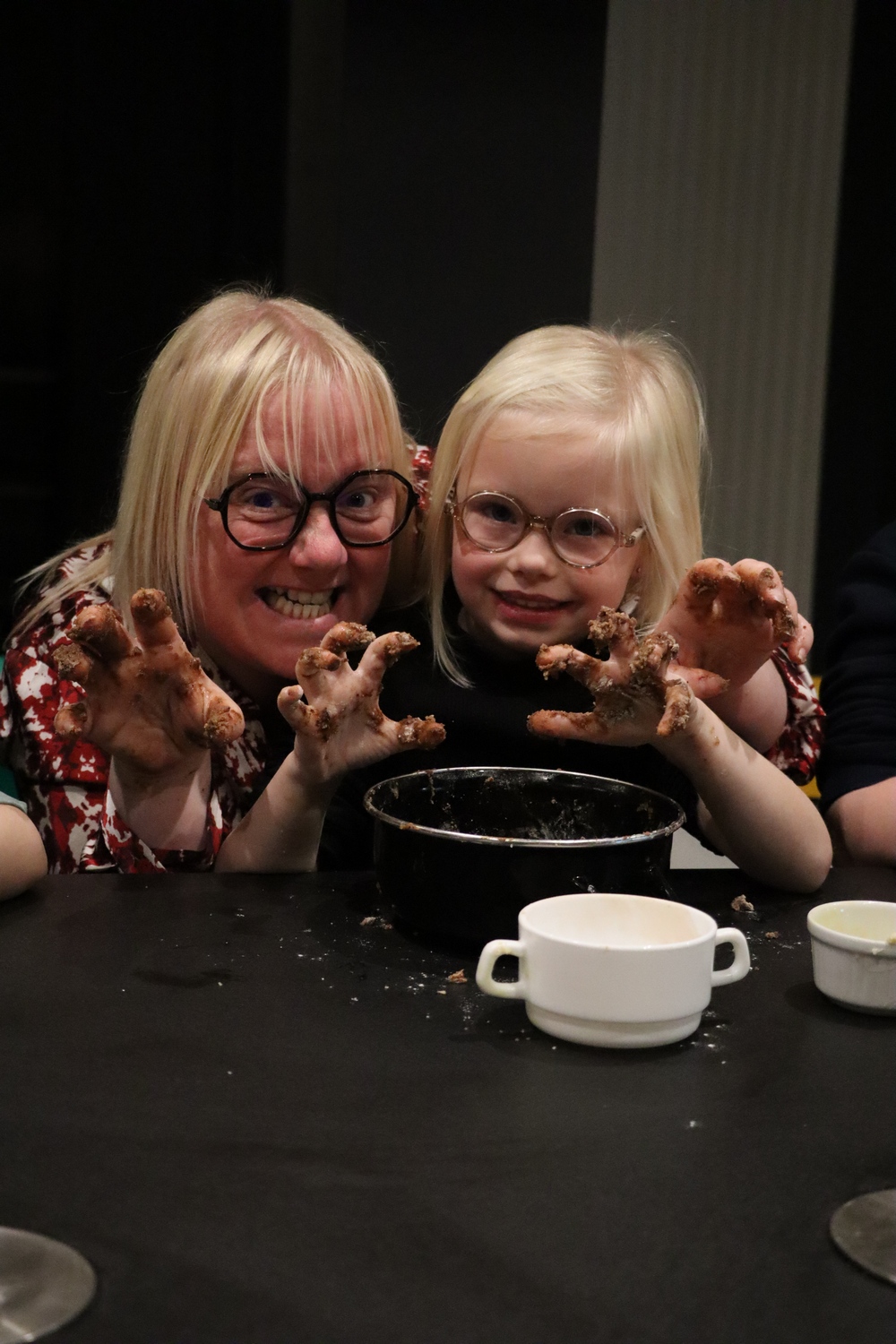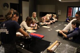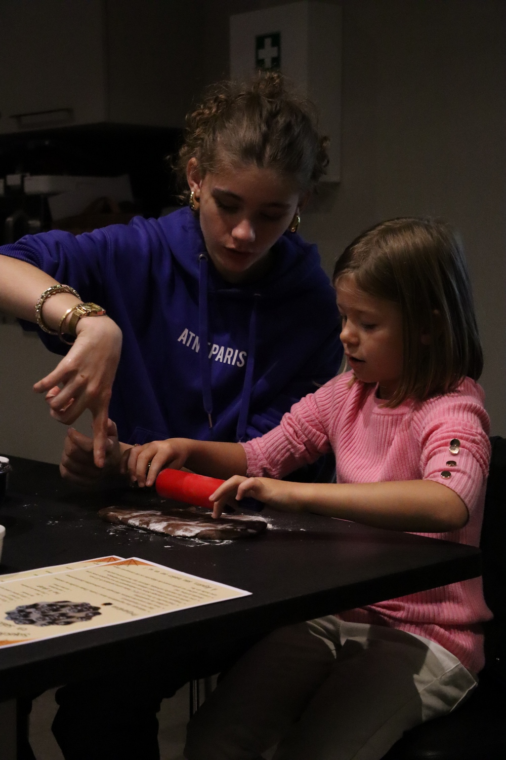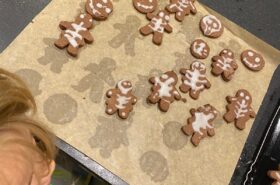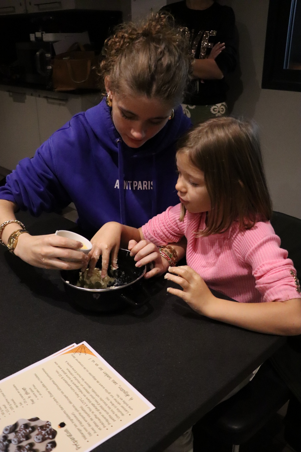 Avant de commencer l’atelier, les petits pâtissiers se sont lavés les mains. Ils ont ensuite pris plaisir à malaxer du beurre, de la poudre de cacao et du sucre cassonade auxquels ils ont ajouté un œuf et de la farine afin d’obtenir une pâte homogène. À l’aide d’emporte-pièces en forme de personnages, les enfants ont découpé les silhouettes qu’ils ont passé au four pendant une dizaine de minutes. Une fois refroidis, ils ont dessiné sur les biscuits des crânes et le squelette avec un glaçage blanc obtenu en mélangeant du sucre glace avec un peu d’eau. Le temps est enfin arrivé de s’installer autour de la table et de déguster ces succulents gâteaux. Une rumeur prétend que quelques-uns sont tombés sur un os !