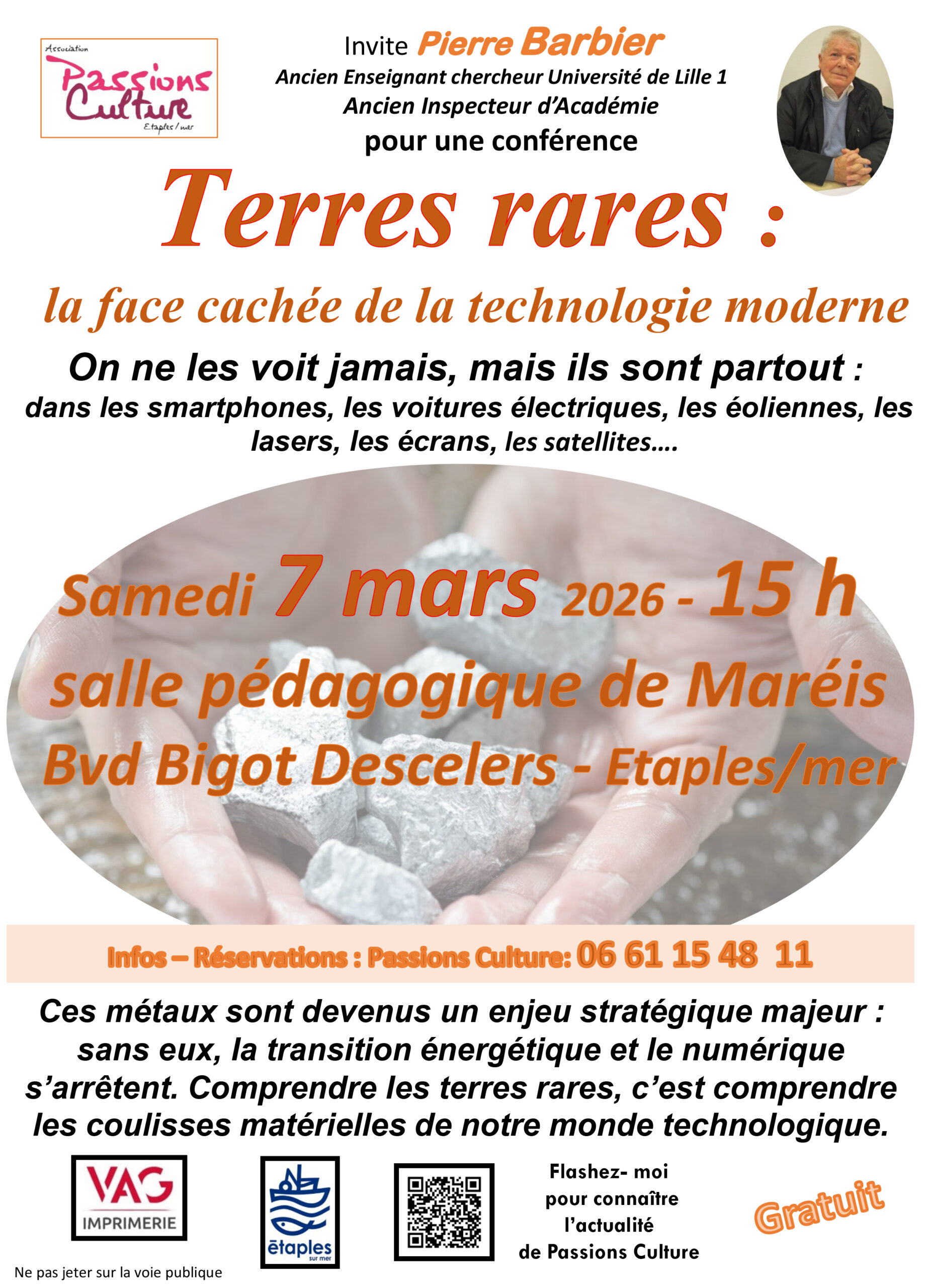 salle pédagogique de Maréis boulevard Bigot Descelers, etaples, FranceConférence : Les terres rares : la face cachée de la technologie morderne "On ne les voit jamais, mais ils sont partout : On ne les voit jamais, mais ils sont partout : dans les smartphones, les voitures électriques, les éoliennes, les lasers, les écrans, les satellites... Par l’association «...