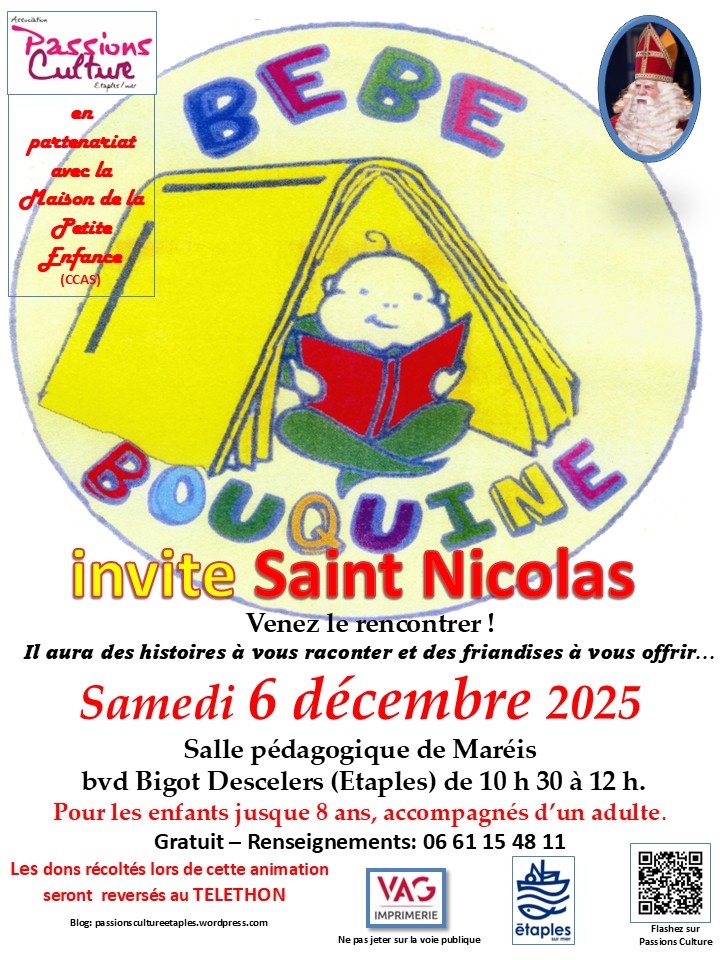 salle pédagogique de Maréis boulevard Bigot Descelers, etaples, FrancePar l’association « Passions Culture » Samedi 6 décembre – 10h30 – salle pédagogique de « maréis » Saint-Nicolas vient à la rencontre des enfants. Il aura des histoires et des friandises à partager Gratuit RENSEIGNEMENTS : P. Floure – 06 61 15 48 11