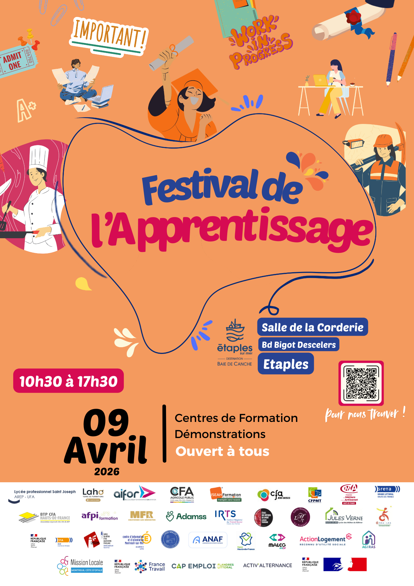 « Tous les Évènements FESTIVAL DE L’APPRENTISSAGE 9 avril à 10:30 > 17:30 « Chasse à l’œuf Parcours du cœur » Festival de l’ApprentissageSalle de la Corderie ETAPLESde 10h30 à 17h30le 9 avril 2026 Ajouter au calendrier Google Agenda iCalendar Outlook 365 Outlook Live Détails Date : 9 avril Heure : 10:30 > 17:30 Catégories d’Évènement: Animations, emploi, Jeunesse Organisateur Mission locale Téléphone 0321867696 Voir le site Organisateur Lieu Salle de la Corderie