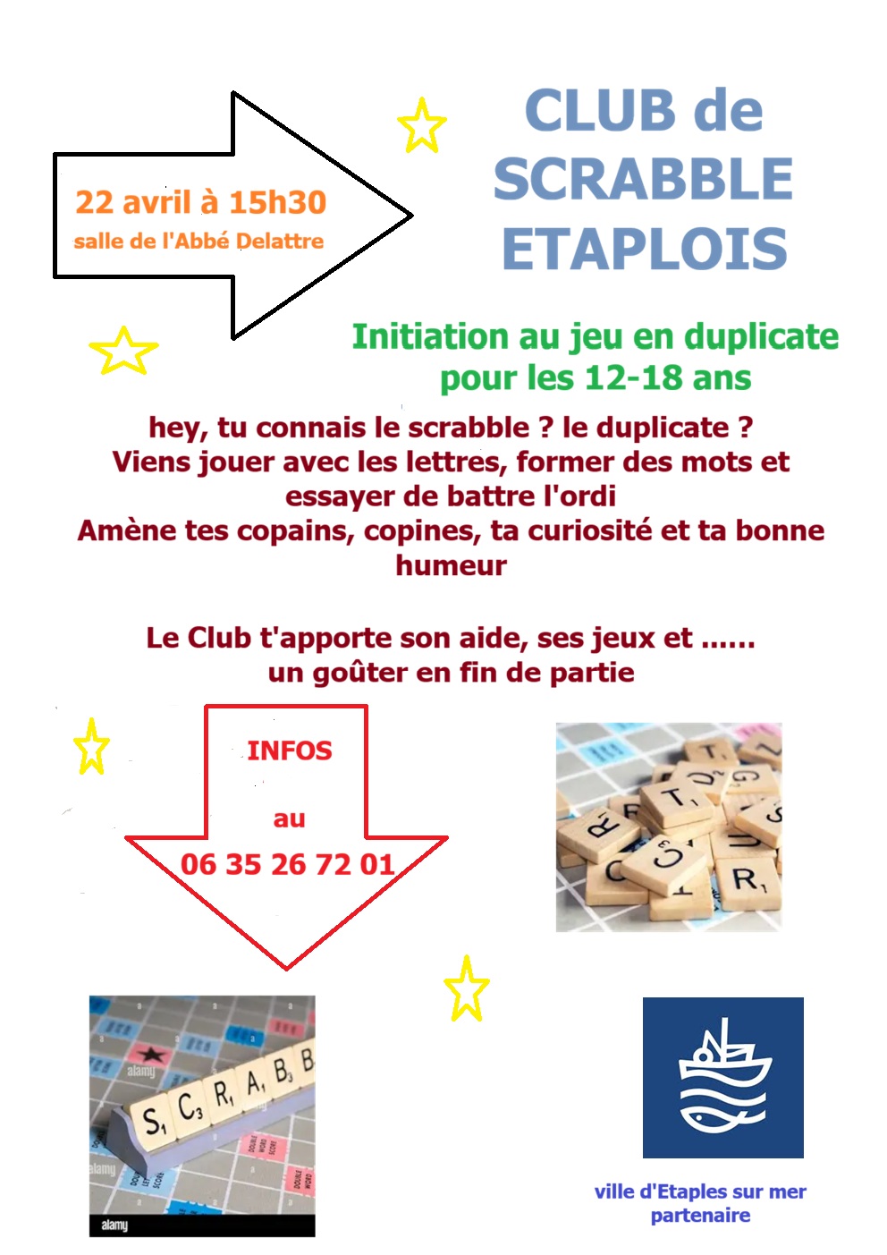 « Tous les Évènements INITIATION AU JEU DE DUPLICATE POUR LES 12-18 ANS 22 avril à 15:30 > 17:00 « Visite « Histoire d’Etaples-sur-mer » Structures gonflables » par le Club de Scrabble Etaploisle Mercredi 22 avril 2026 à 15h30 à la salle de l’Abbé DelattreINFOS : 06 35 26 72 01 Ajouter au calendrier Google Agenda iCalendar Outlook 365 Outlook Live Détails Date : 22 avril Heure : 15:30 > 17:00 Catégories d’Évènement: Animations, Associations Organisateur association scrabble étaplois Téléphone 06 35 26 72 01 Lieu Salle Abbé Delattre Boulevard de l'impératrice etaples, 62630 France + Google Map