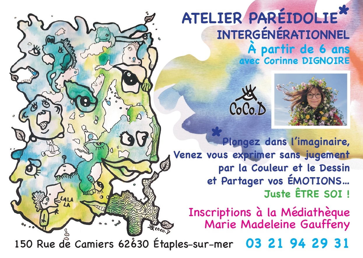 Médiathèque Marie-Madeleine GauffenyPendant les vacances, laissez-vous porter par l’imaginaire et libérez votre créativité lors d’un atelier artistique encadré par l’artiste illustratrice Coco D. À travers cette expérience ludique et créative, les enfants découvriront la paréidolie, un concept fascinant qui consiste à reconnaître des visages ou des formes surprenantes dans des images, des...