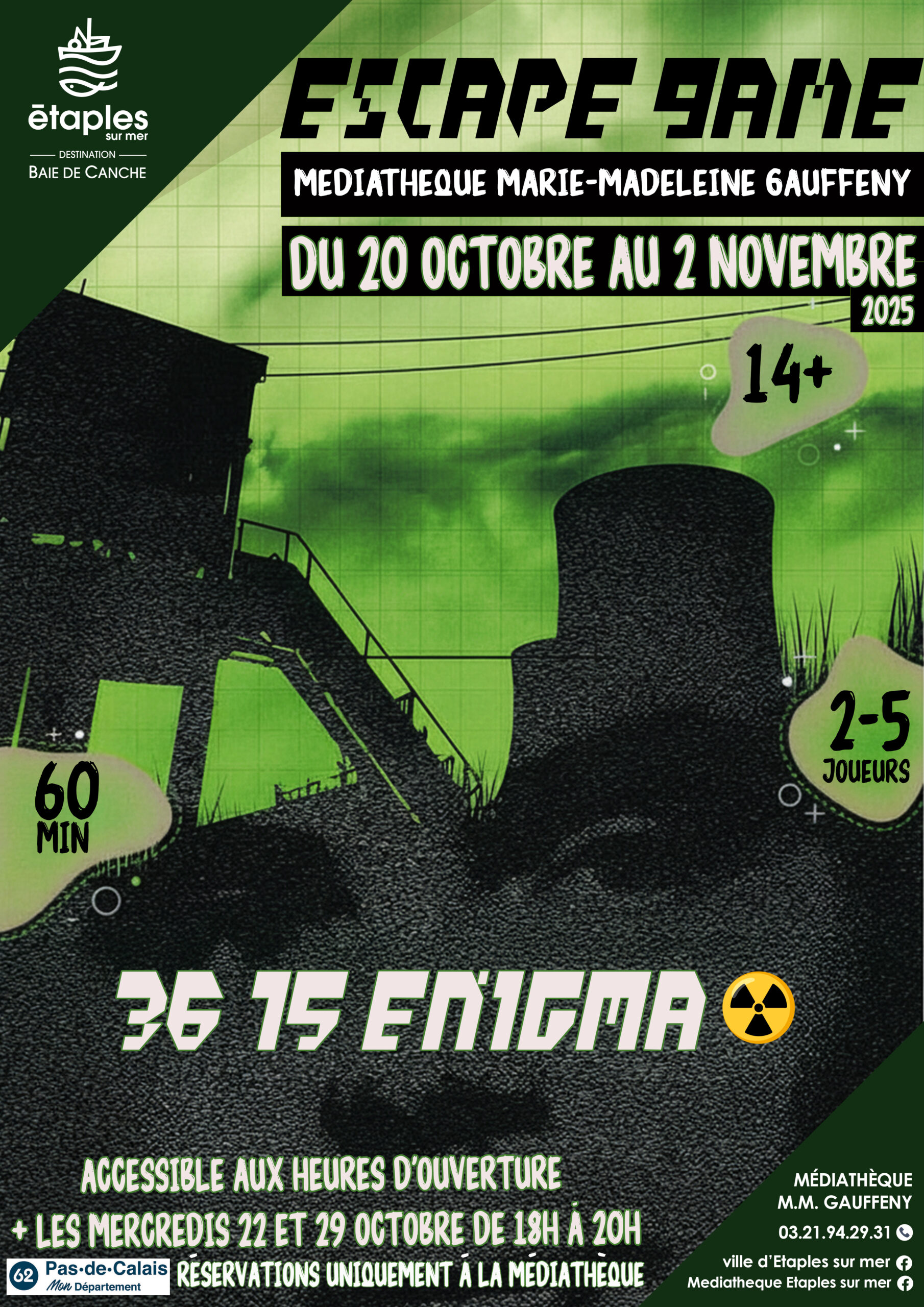 ![]() Par la médiathèque Du mardi 18 au vendredi 31 octobre – aux horaires de la médiathèque – médiathèque Gratuit sur réservation Infos : 03 21 94 29 31 Escape Game - 3615 Enigma La France est en alerte. en raison d'un black-out, le système de refroidissement de la centrale nucléaire est...