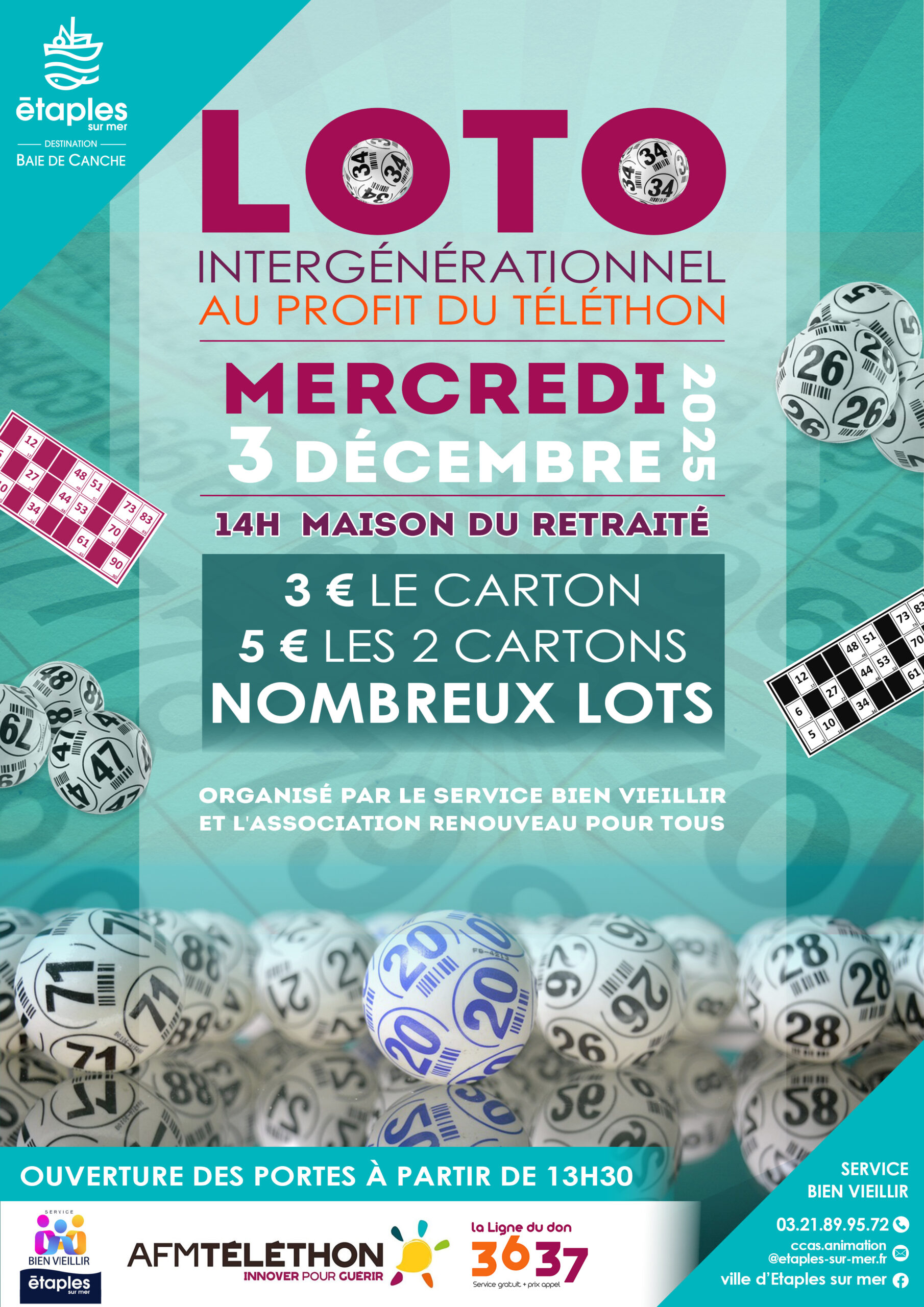 Le mercredi 3 décembre 2025, le service « Bien vieillir » d’Étaples-sur-Mer, en partenariat avec l’association Renouveau pour tous, organise son traditionnel loto intergénérationnel au profit du Téléthon, à la Maison du retraité. À partir de 14h, tentez votre chance et contribuez à votre manière à cette belle action caritative...