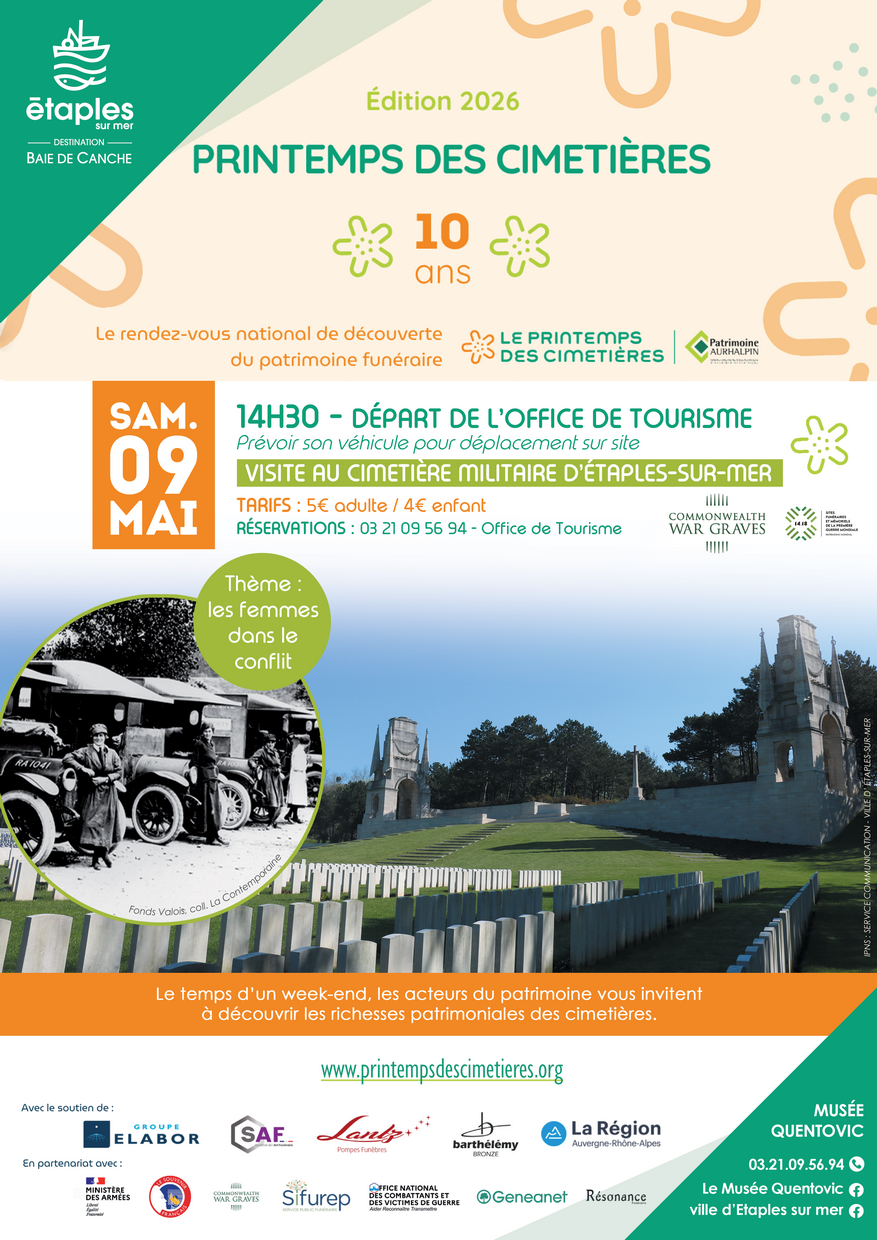 Saviez-vous que plus de 2 500 femmes ont joué un rôle actif dans le camp britannique d’Etaples-sur-mer pendant la Première Guerre mondiale ? Infirmières, volontaires, artistes ou mécènes, elles ont marqué l’histoire par leur engagement, parfois au prix de leur vie. Cette visite guidée vous invite à découvrir leur quotidien, leurs témoignages et les raisons pour lesquelles certaines reposent aujourd’hui dans ce cimetière du Commonwealth.