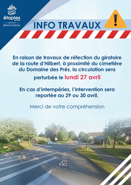 La Ville vous informe que des travaux de réfection du giratoire de la route d’Hilbert, à proximité du cimetière du Domaine des Prés, seront réalisés le lundi 27 avril par la société EUROVIA.