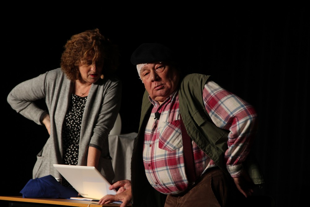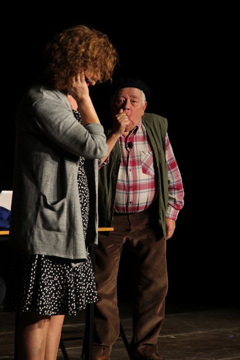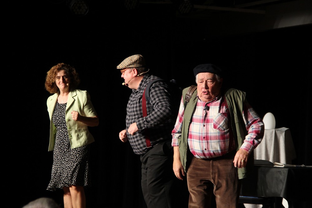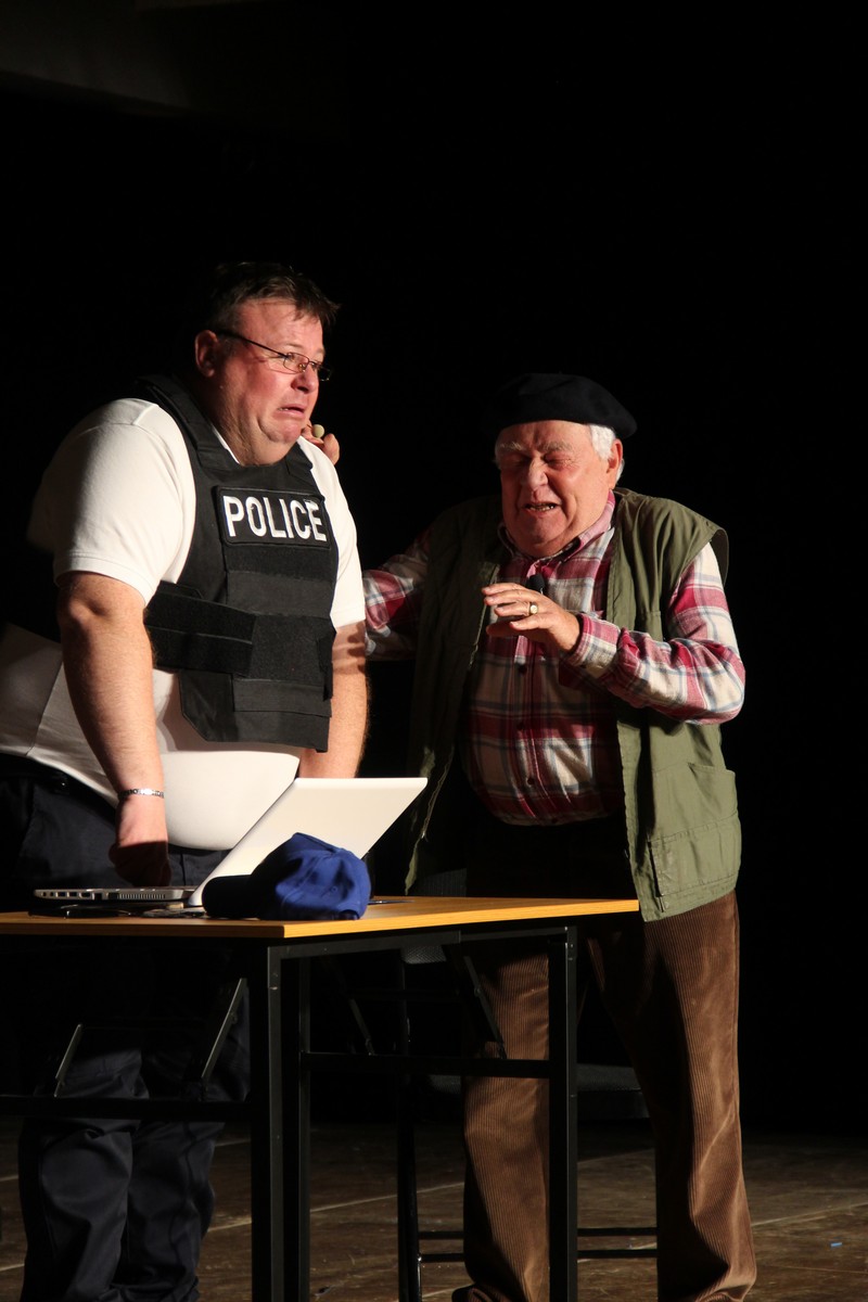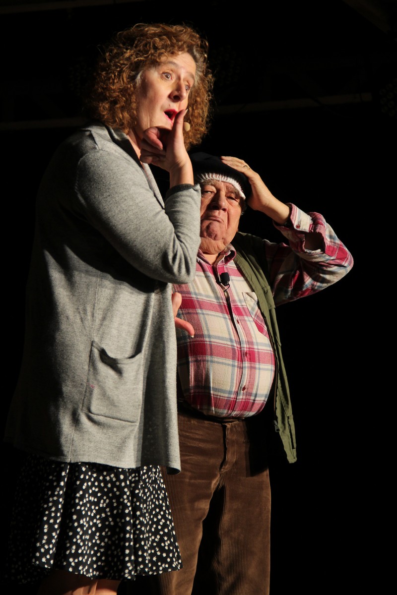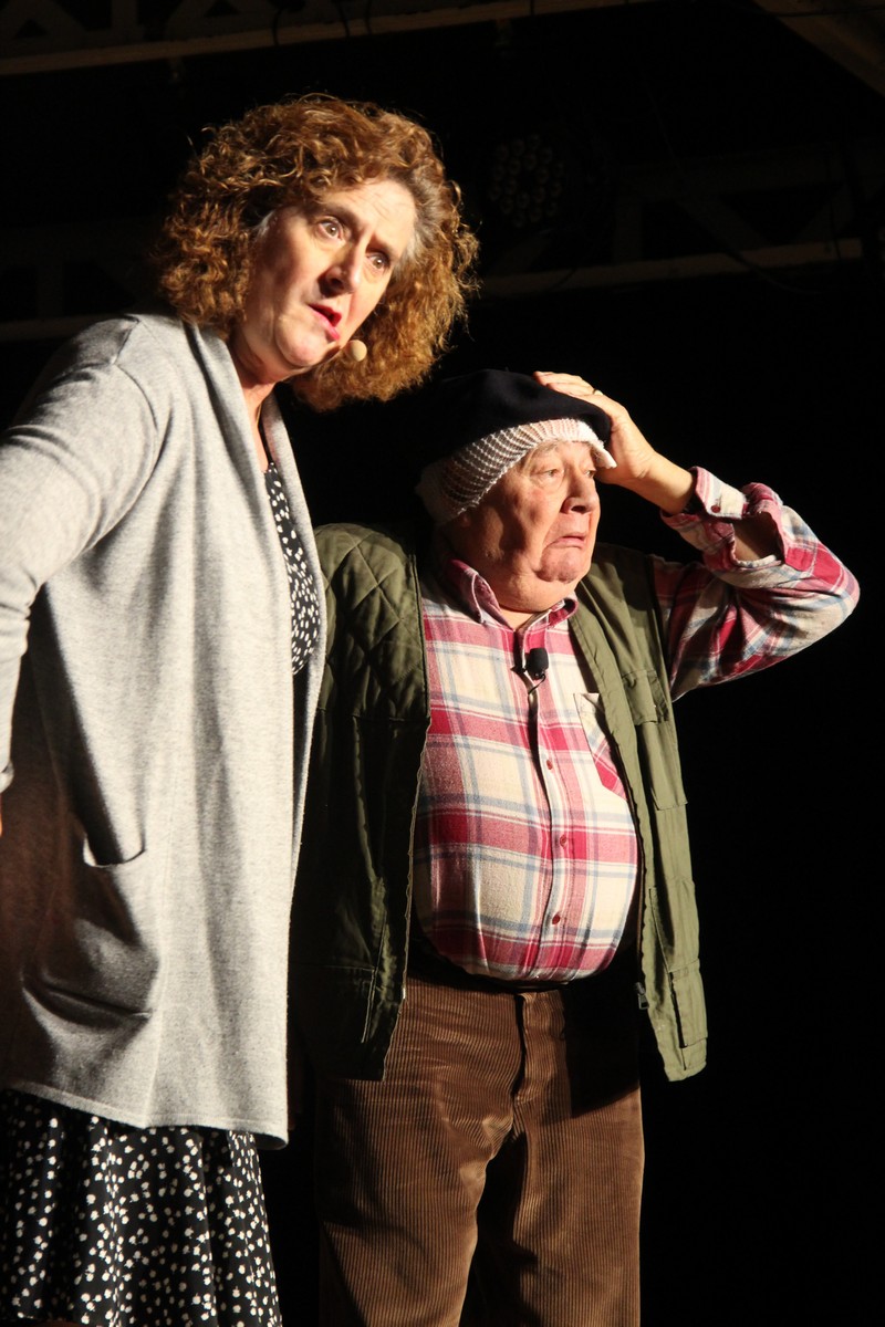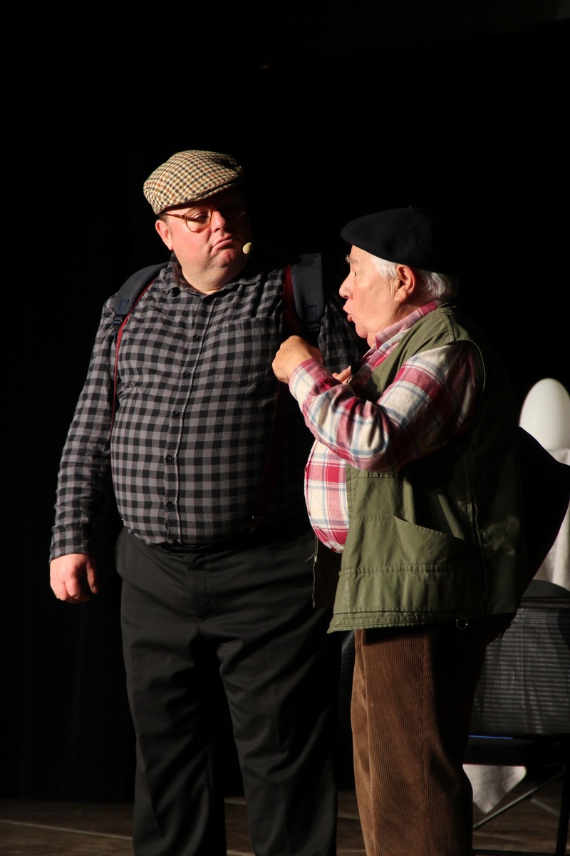 Pendant 1h30, le public a suivi les mésaventures d’Eugène et Phonsine, un couple comme on les aime. Un brin râleur, souvent dépassé, ils sont toujours plein de bon sens enfin, quand ils ne « marchent pas sus l’tête » ! Entre un skateboard rebelle qui renverse Eugène sur le trottoir et une plainte à la police qui vire à la rigolade, nos deux compères n’ont pas fini d’en voir. Et lorsqu’ils se retrouvent impliqués, bien malgré eux, dans une affaire rocambolesque après le décès suspect d’un ami, on comprend vite qu’ils vivent dans un monde… où l’on marche bel et bien sur la tête !