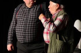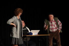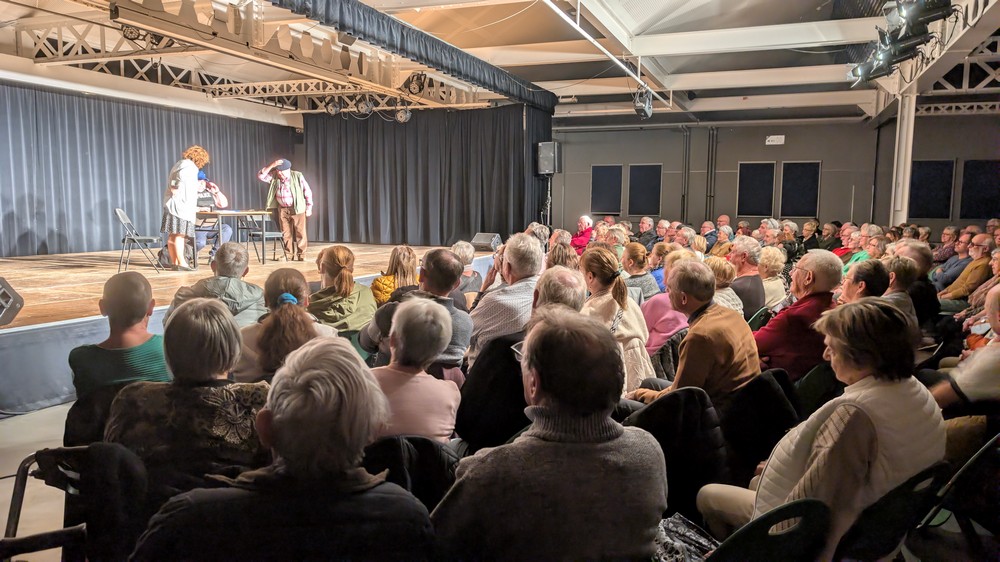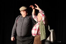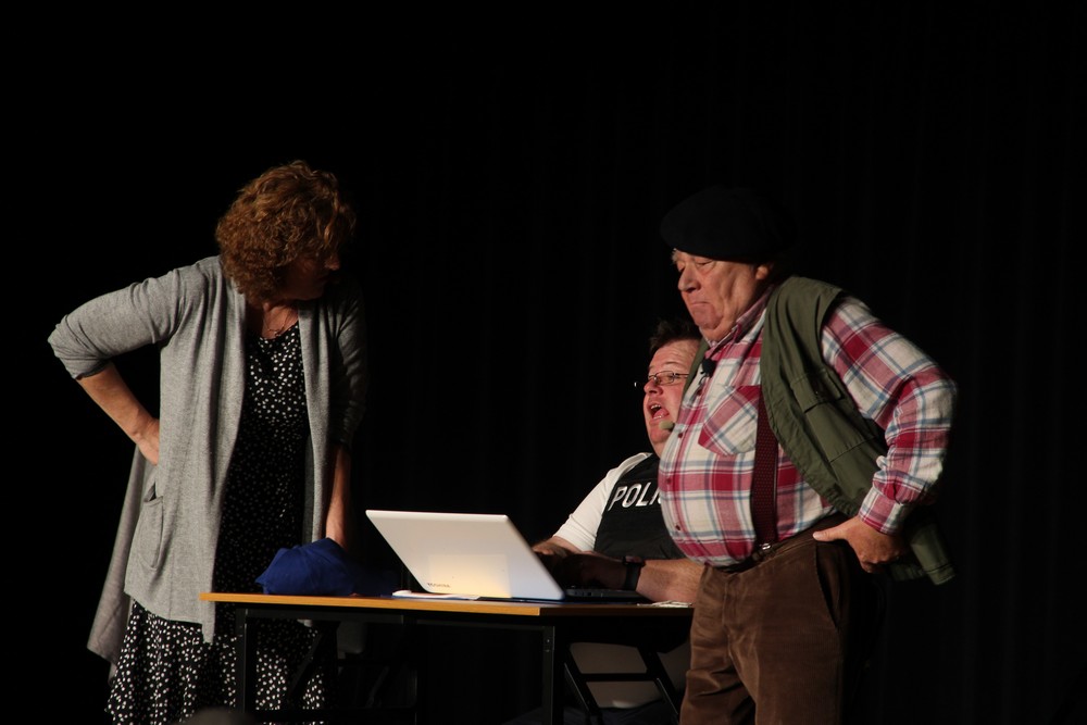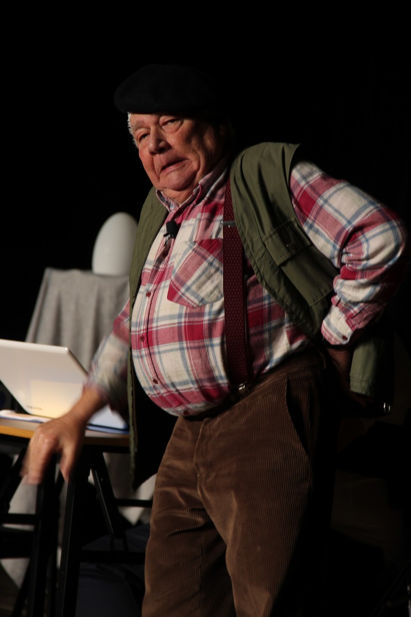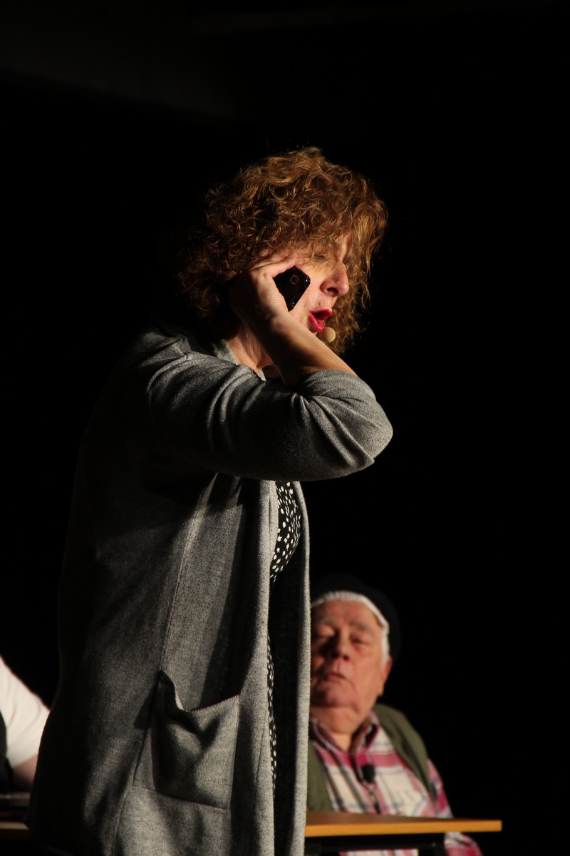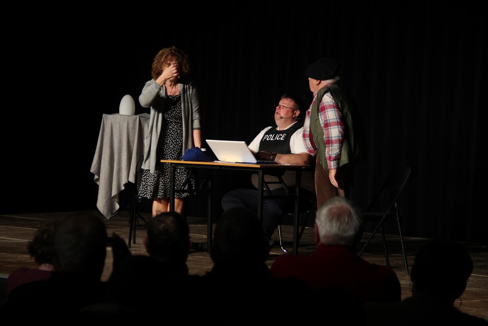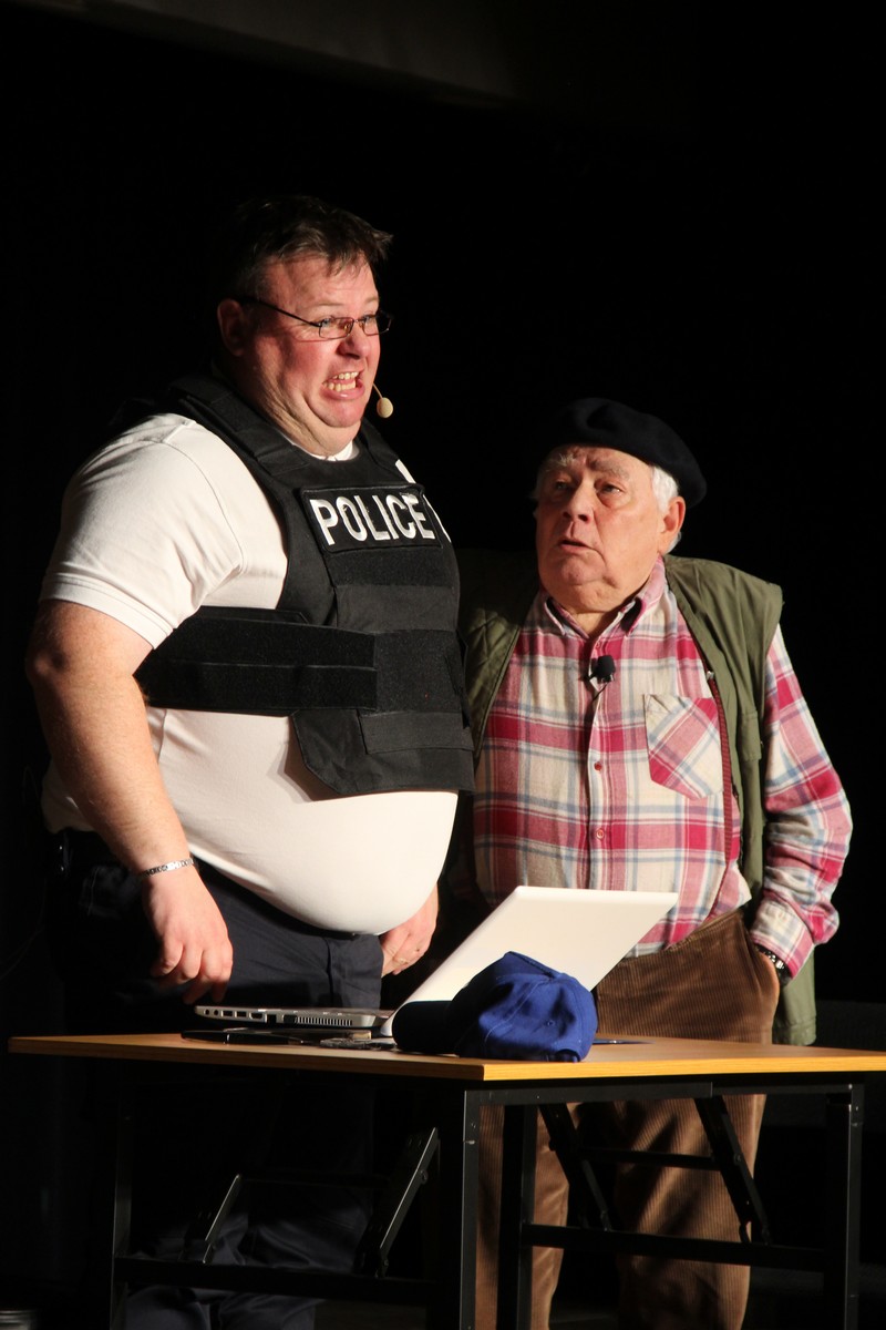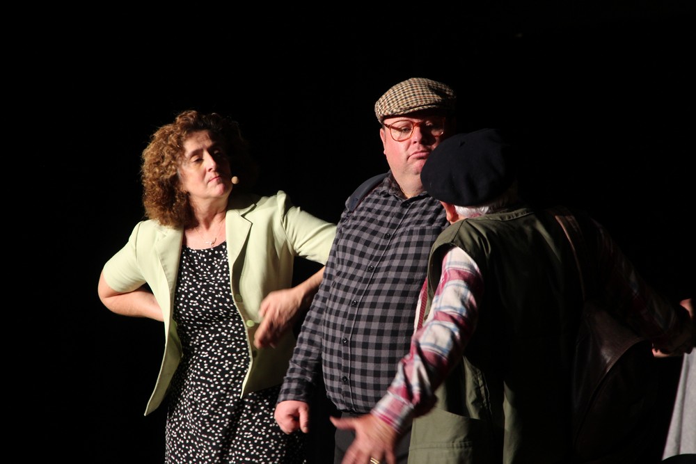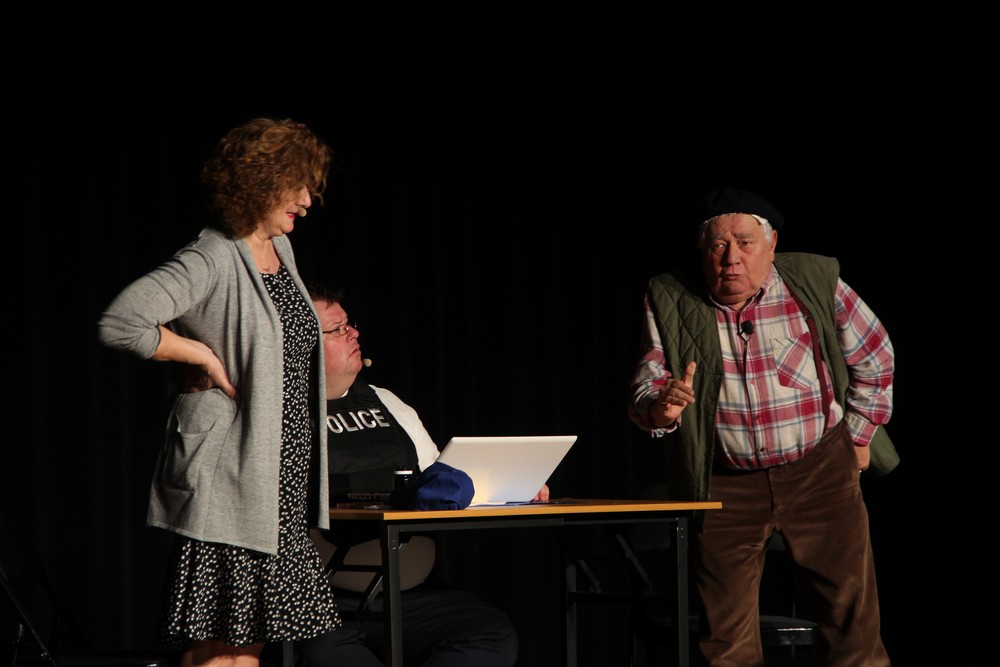 Pendant 1h30, le public a suivi les mésaventures d’Eugène et Phonsine, un couple comme on les aime. Un brin râleur, souvent dépassé, ils sont toujours plein de bon sens enfin, quand ils ne « marchent pas sus l’tête » ! Entre un skateboard rebelle qui renverse Eugène sur le trottoir et une plainte à la police qui vire à la rigolade, nos deux compères n’ont pas fini d’en voir. Et lorsqu’ils se retrouvent impliqués, bien malgré eux, dans une affaire rocambolesque après le décès suspect d’un ami, on comprend vite qu’ils vivent dans un monde… où l’on marche bel et bien sur la tête !