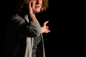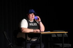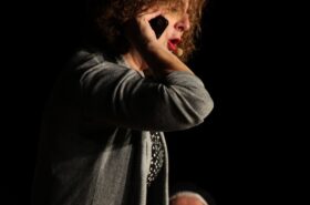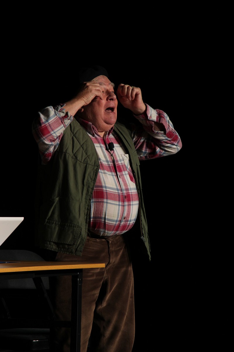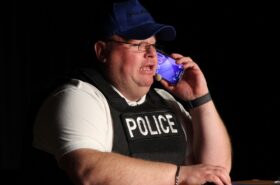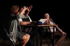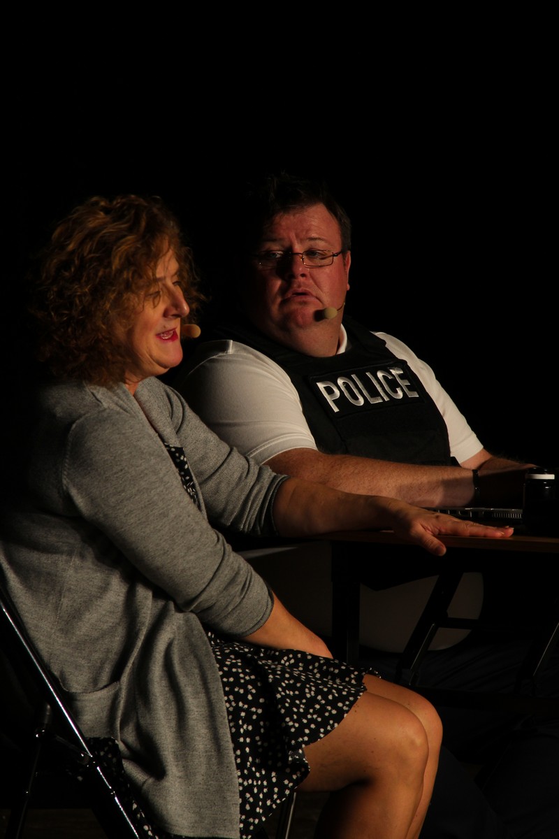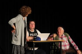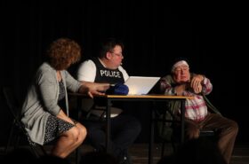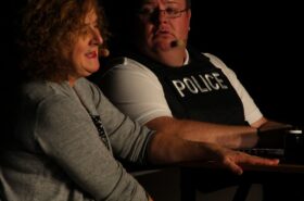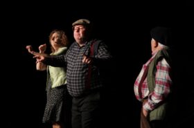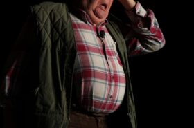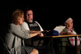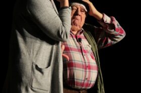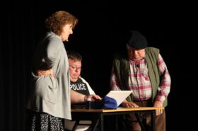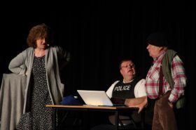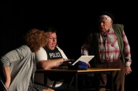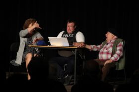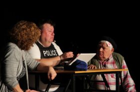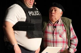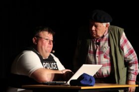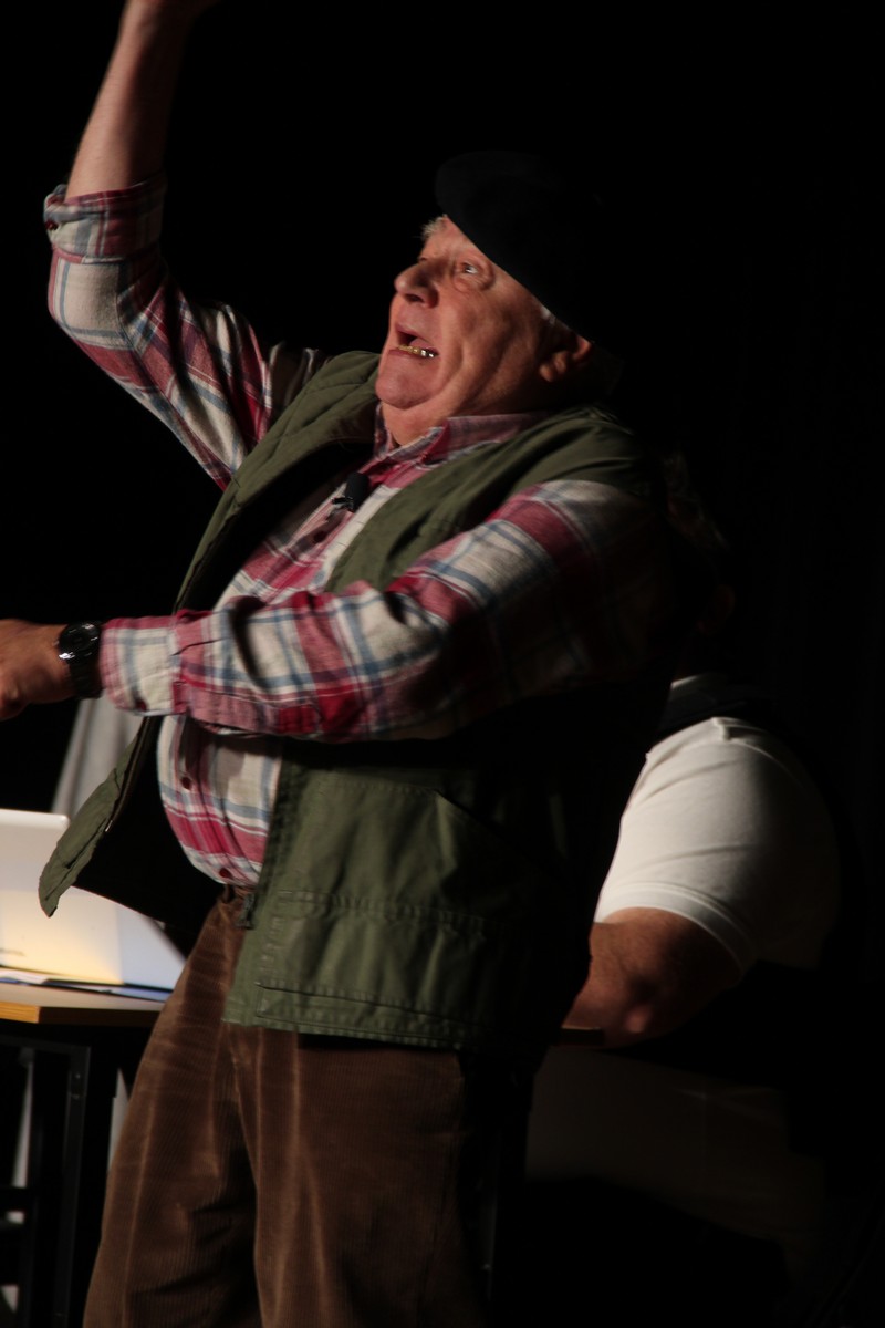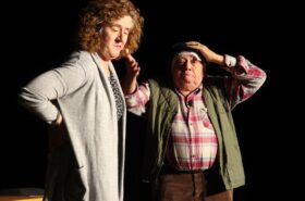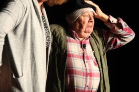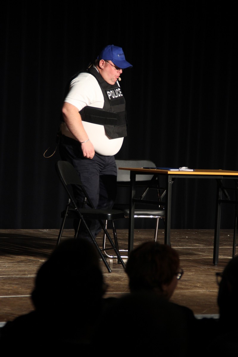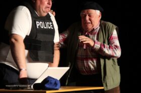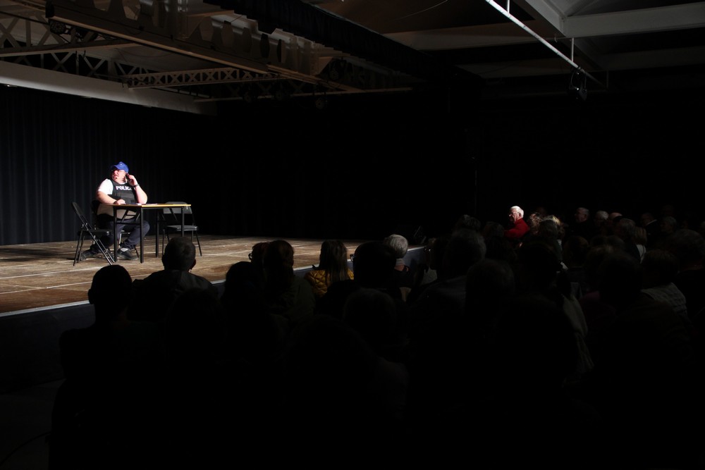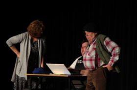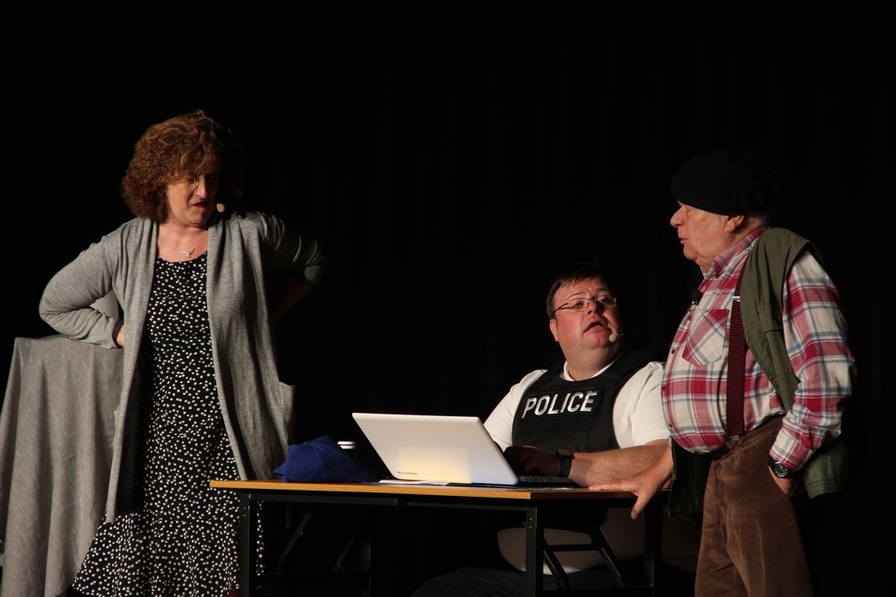 Pendant 1h30, le public a suivi les mésaventures d’Eugène et Phonsine, un couple comme on les aime. Un brin râleur, souvent dépassé, ils sont toujours plein de bon sens enfin, quand ils ne « marchent pas sus l’tête » ! Entre un skateboard rebelle qui renverse Eugène sur le trottoir et une plainte à la police qui vire à la rigolade, nos deux compères n’ont pas fini d’en voir. Et lorsqu’ils se retrouvent impliqués, bien malgré eux, dans une affaire rocambolesque après le décès suspect d’un ami, on comprend vite qu’ils vivent dans un monde… où l’on marche bel et bien sur la tête !