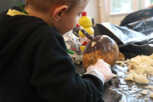 Ensuite, selon les idées de chacun, la partie la plus amusante a commencé : laisser libre cours à son imagination et révéler son côté artistique en créant leur œuvre. Les enfants n’ont pas manqué d’imagination : Monsieur Patate, une fée, un renne, un Père Noël…