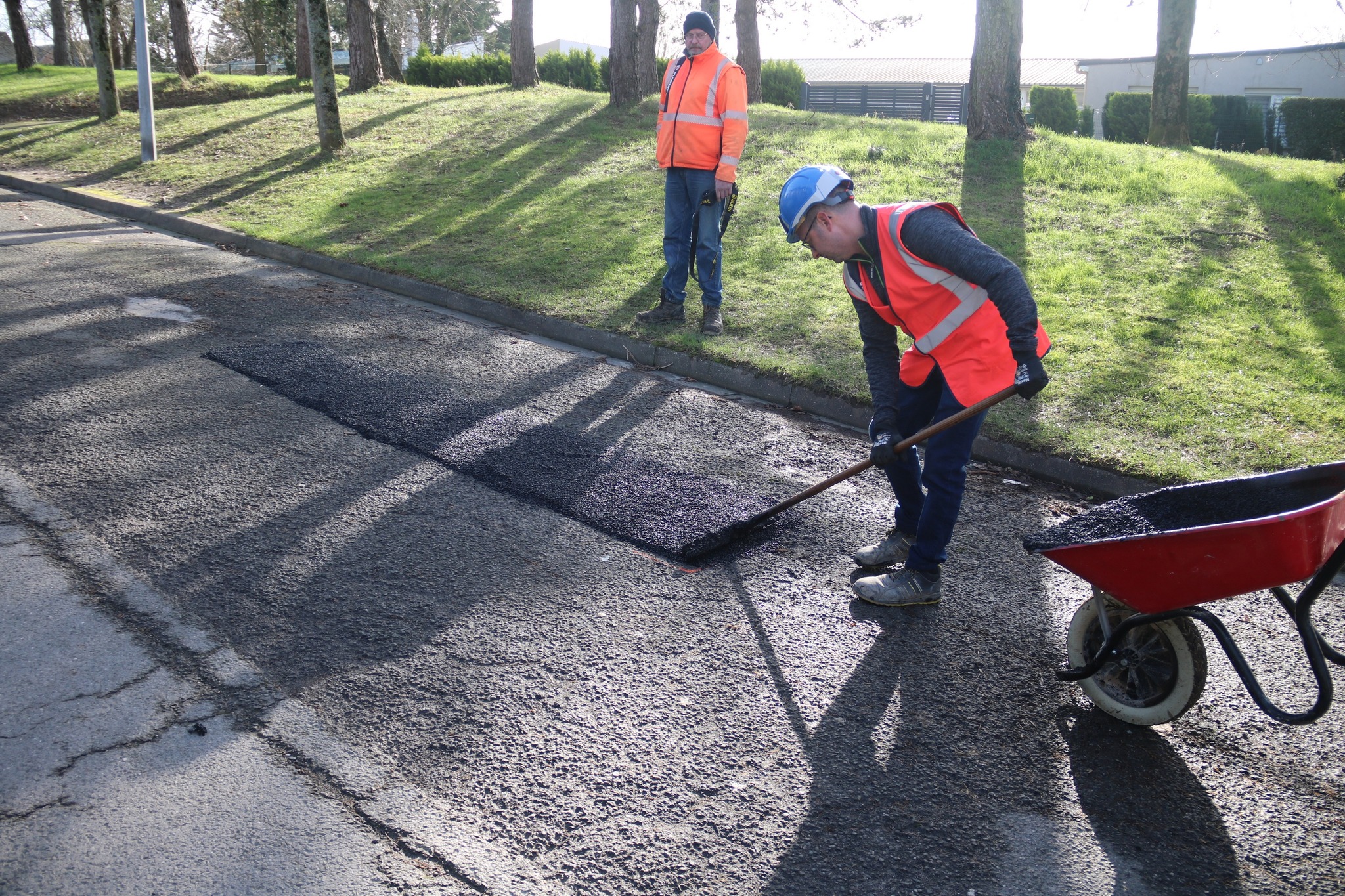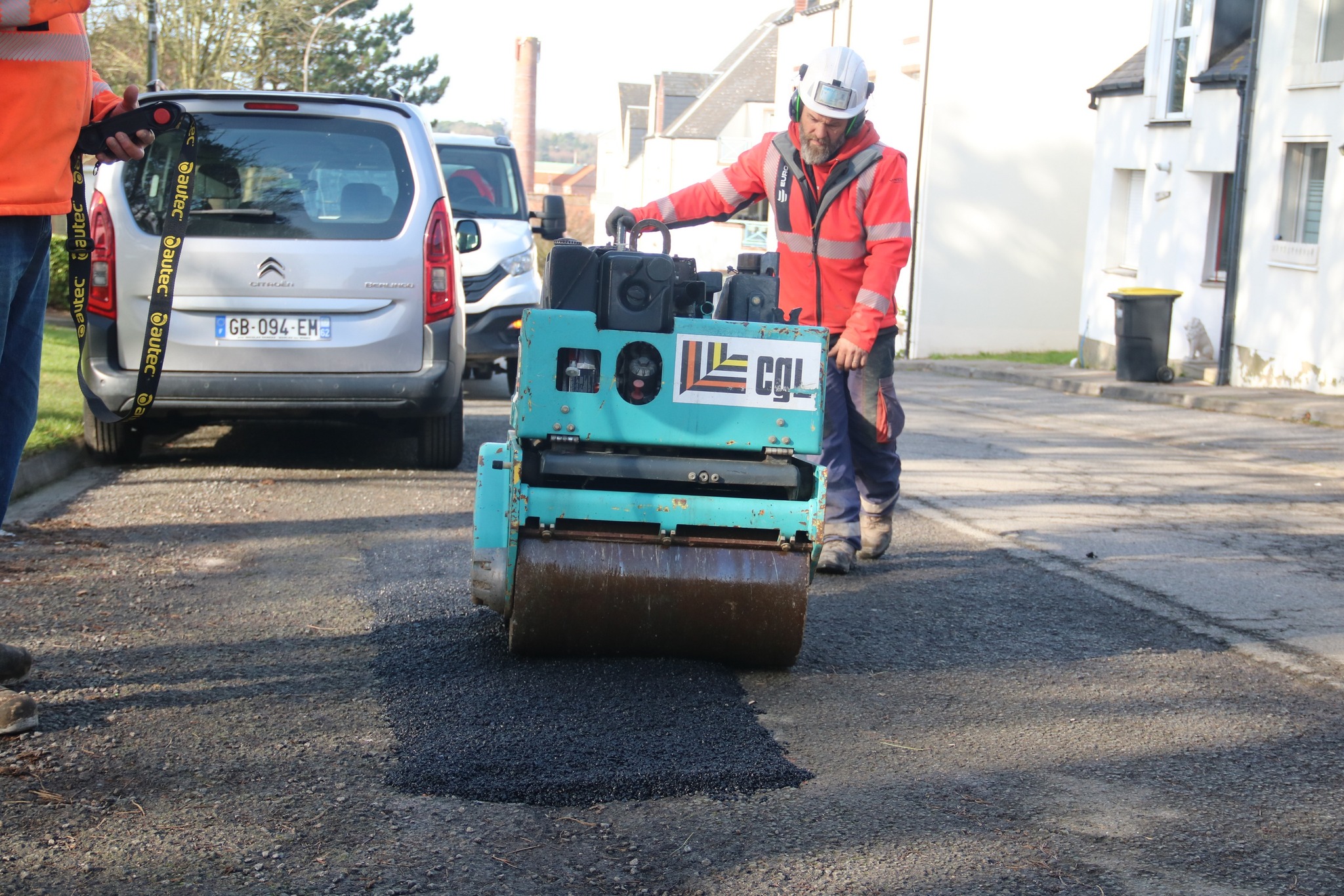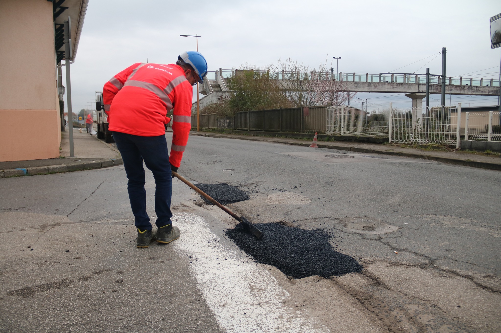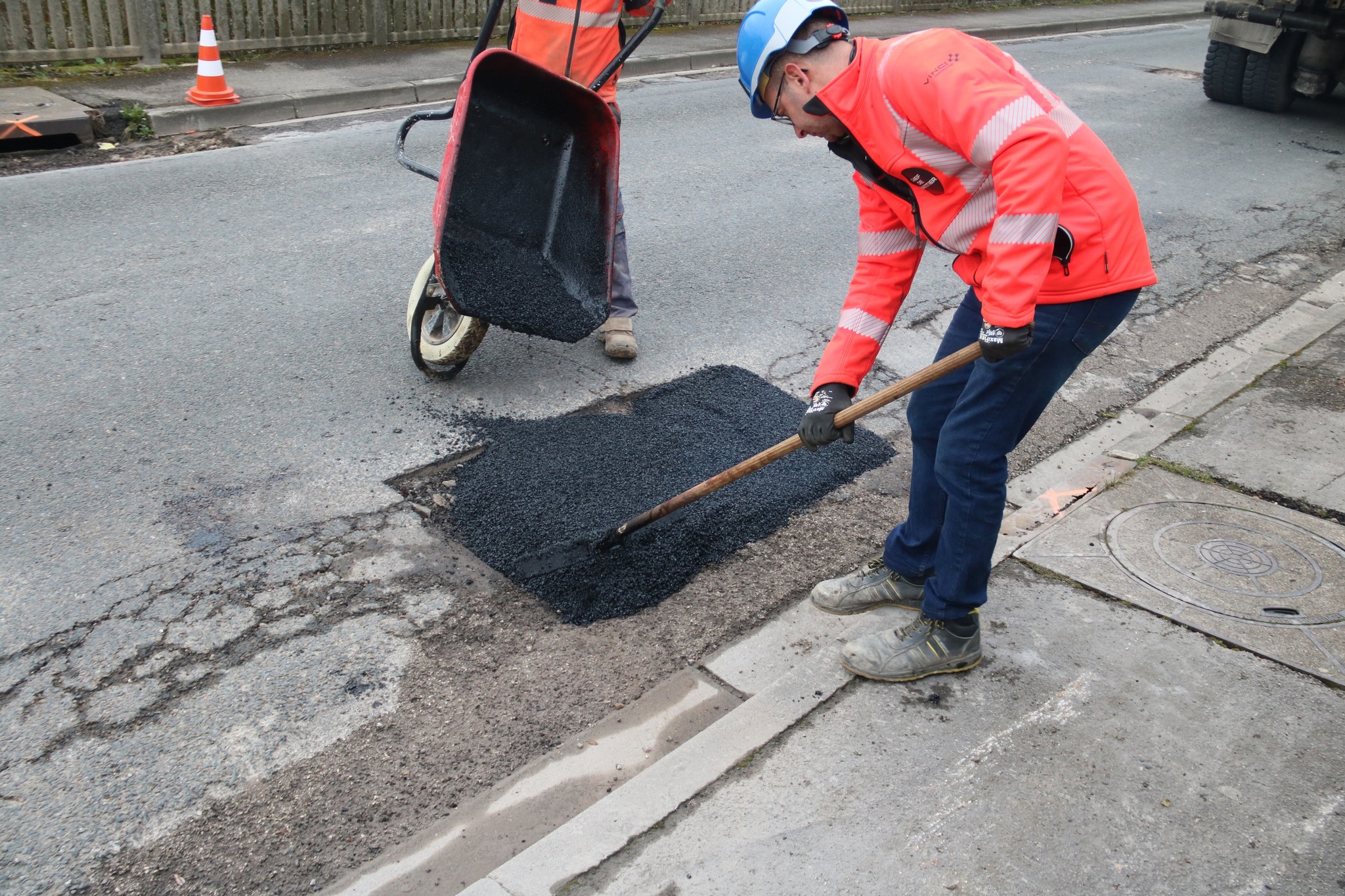 Après des découpes préparatoires effectuées en début de semaine, les équipes d’Eurovia sont intervenues ce vendredi pour reboucher plusieurs nids-de-poule. Les réparations ont été réalisées avec de l’enrobé à chaud (environ 160°C), une méthode plus résistante qu’un simple rebouchage à froid.