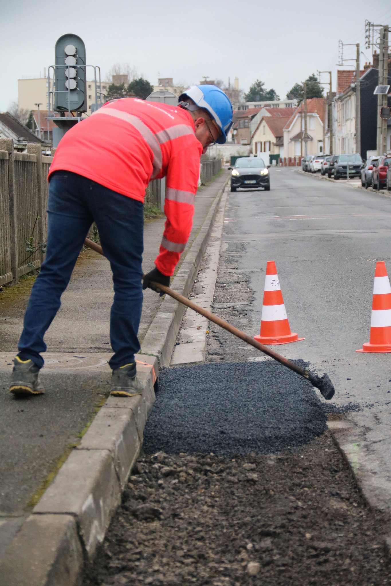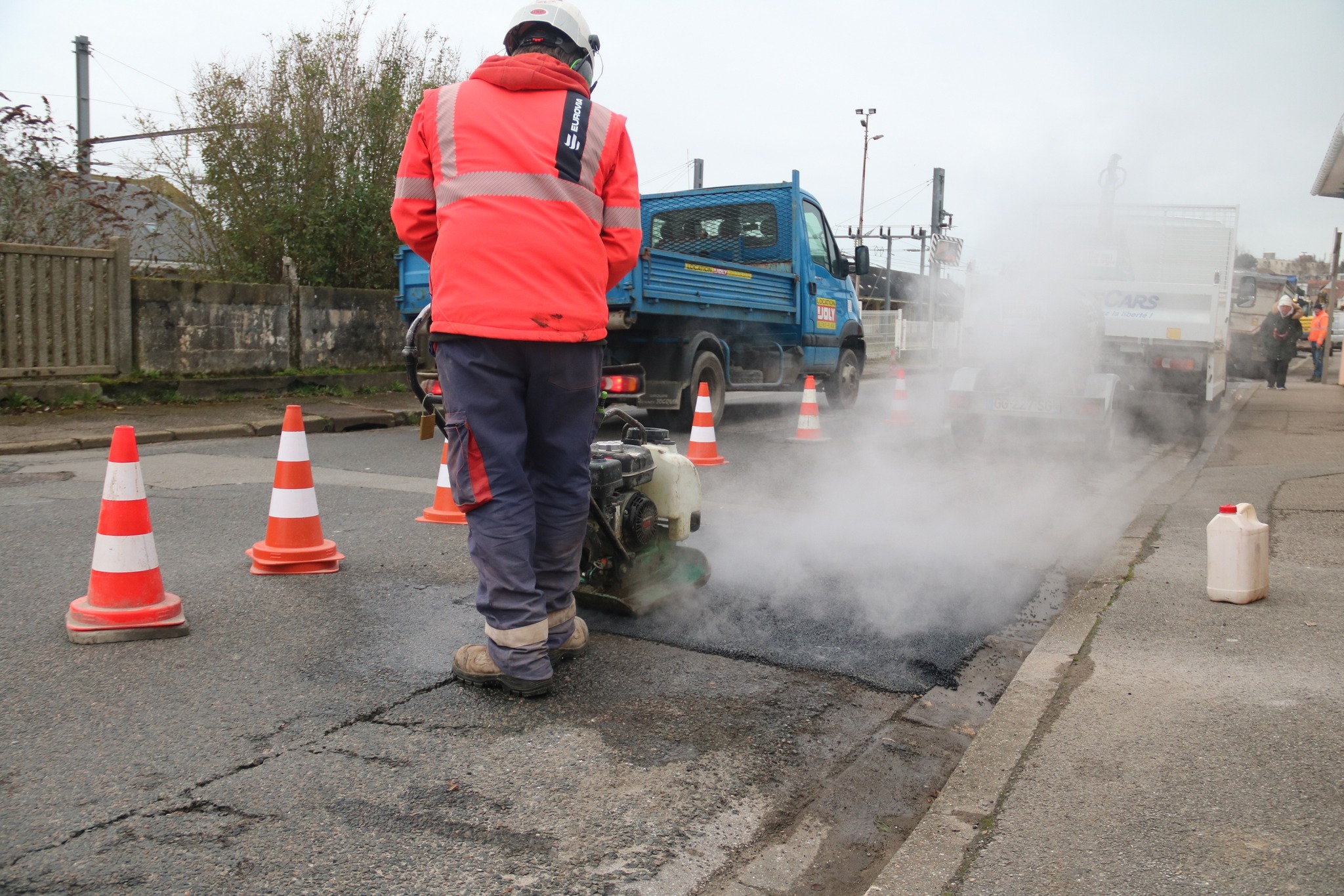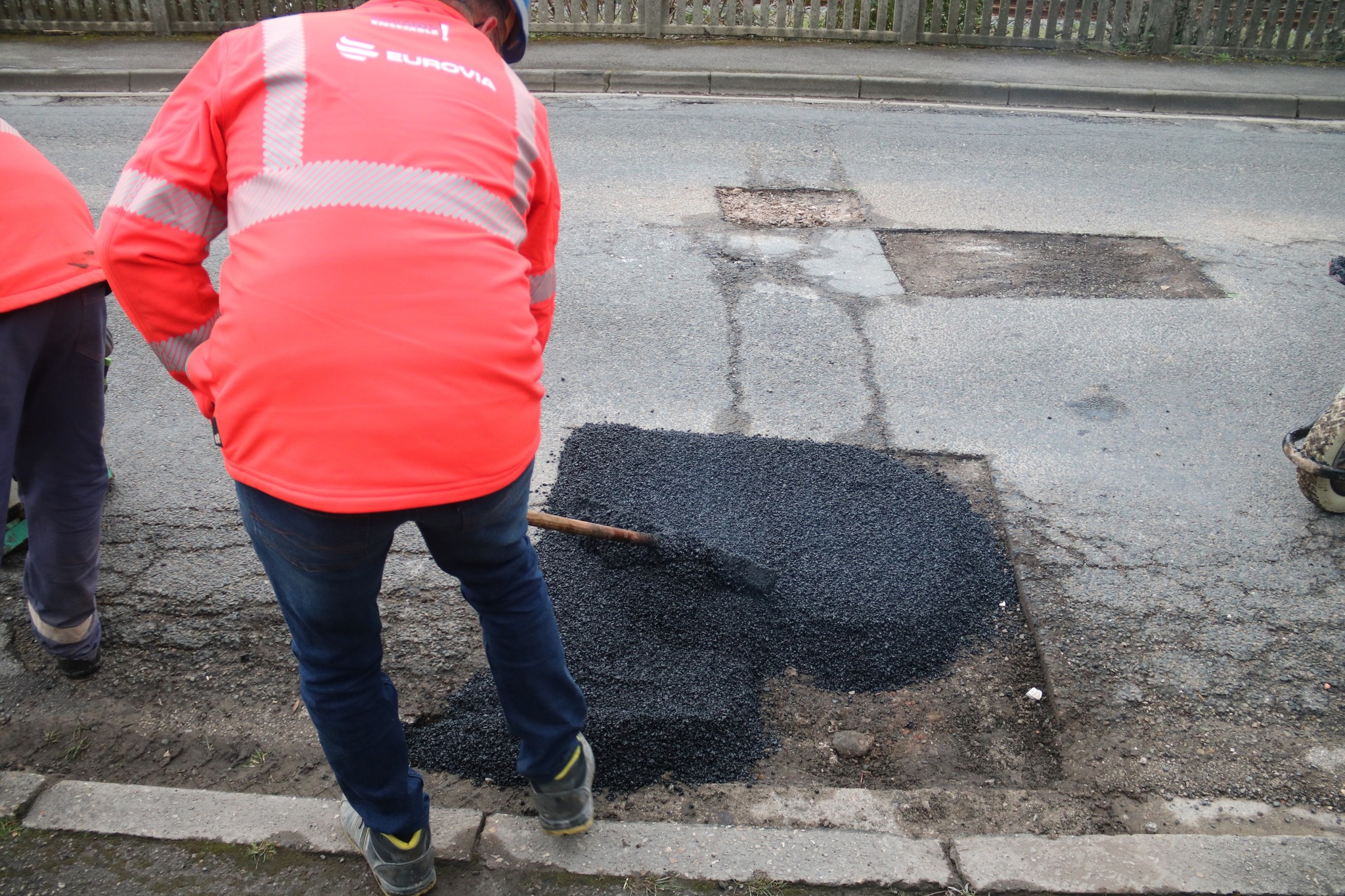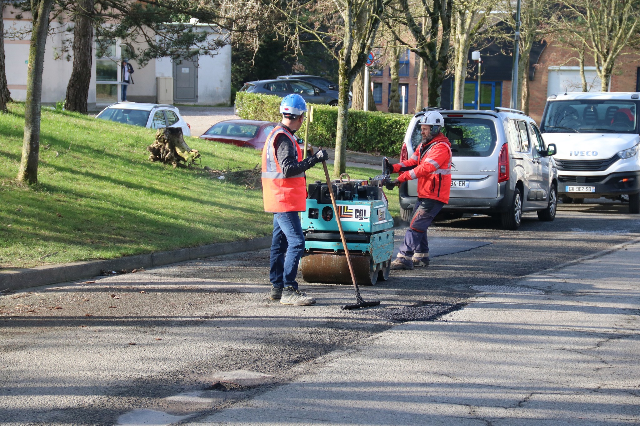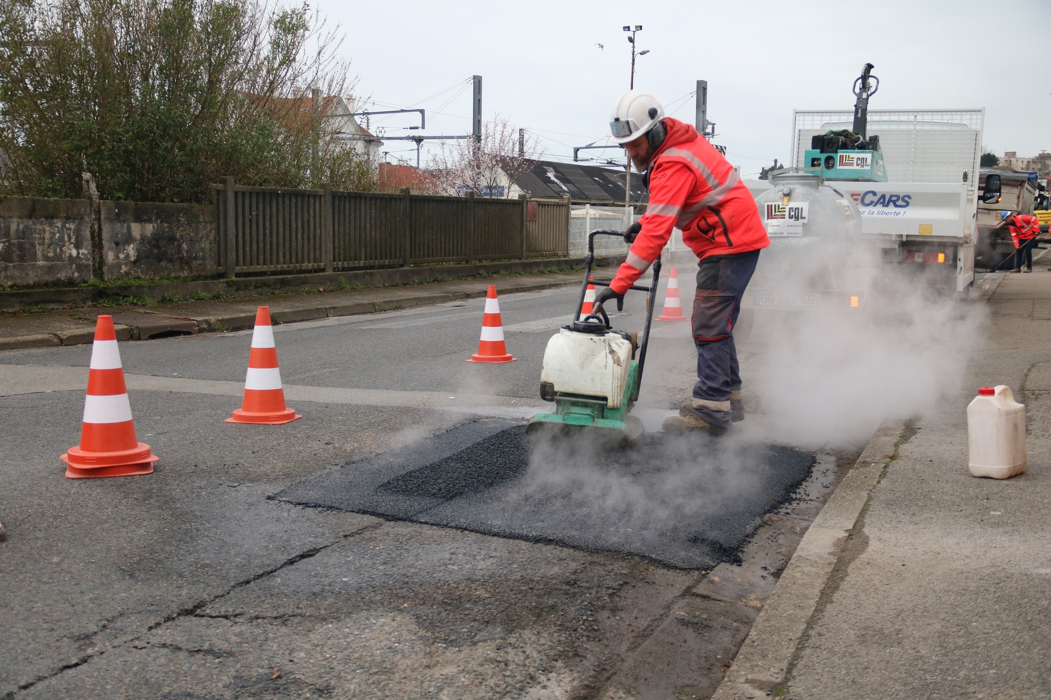 Après des découpes préparatoires effectuées en début de semaine, les équipes d’Eurovia sont intervenues ce vendredi pour reboucher plusieurs nids-de-poule. Les réparations ont été réalisées avec de l’enrobé à chaud (environ 160°C), une méthode plus résistante qu’un simple rebouchage à froid.