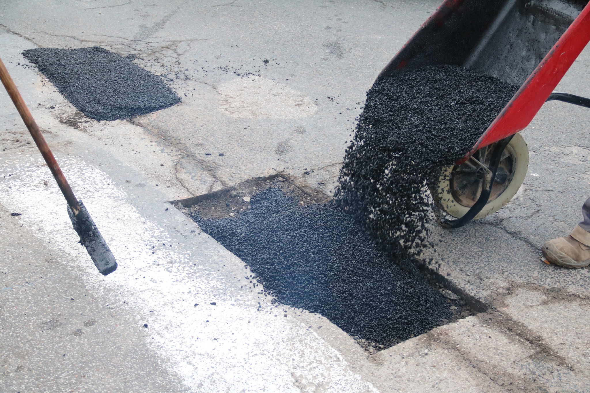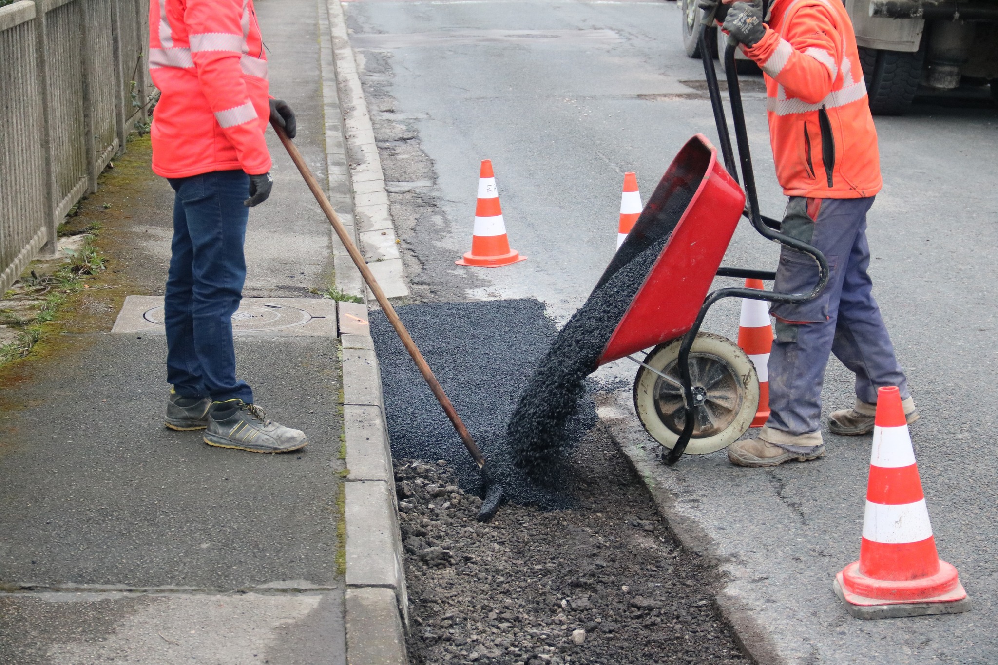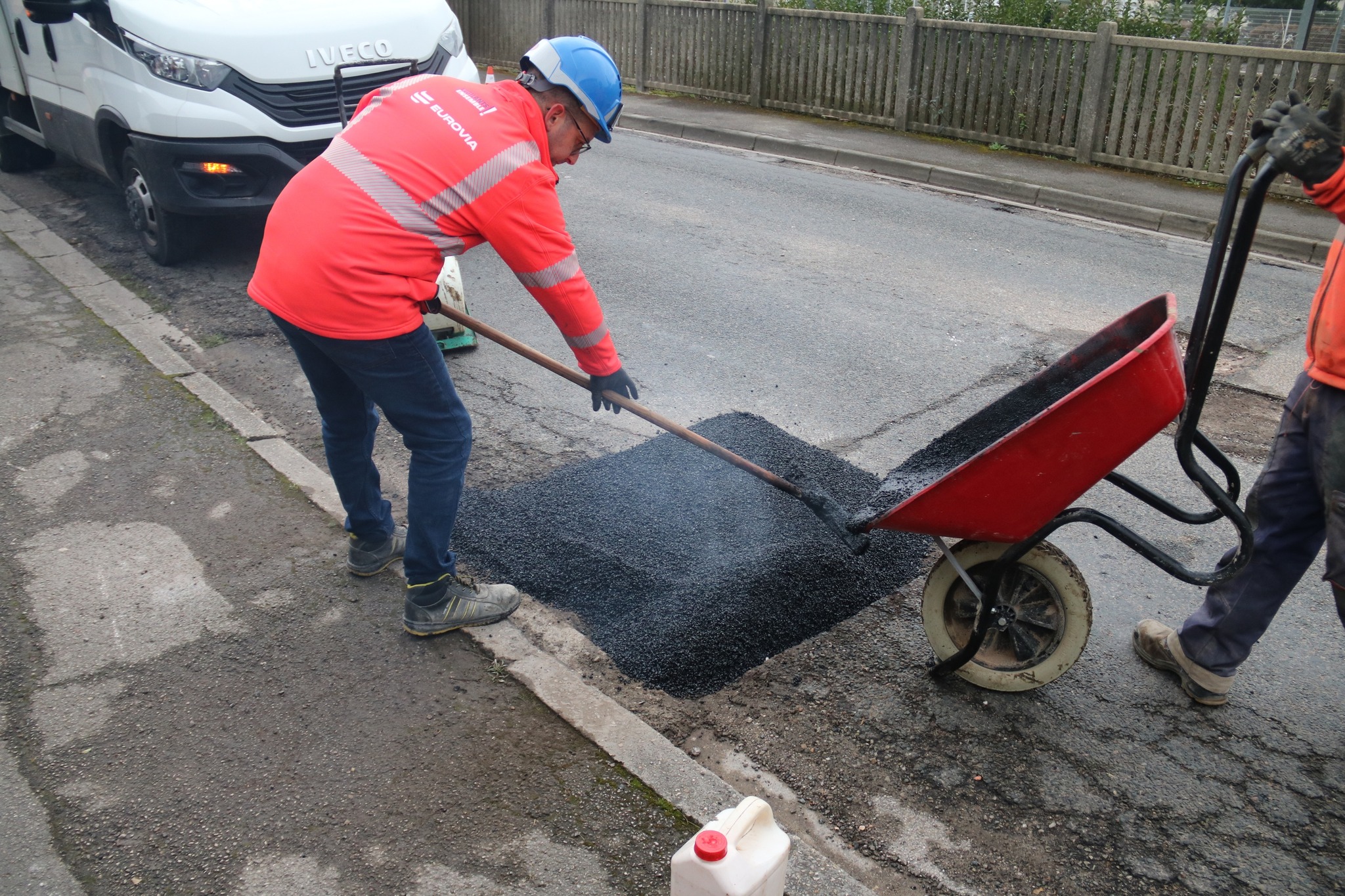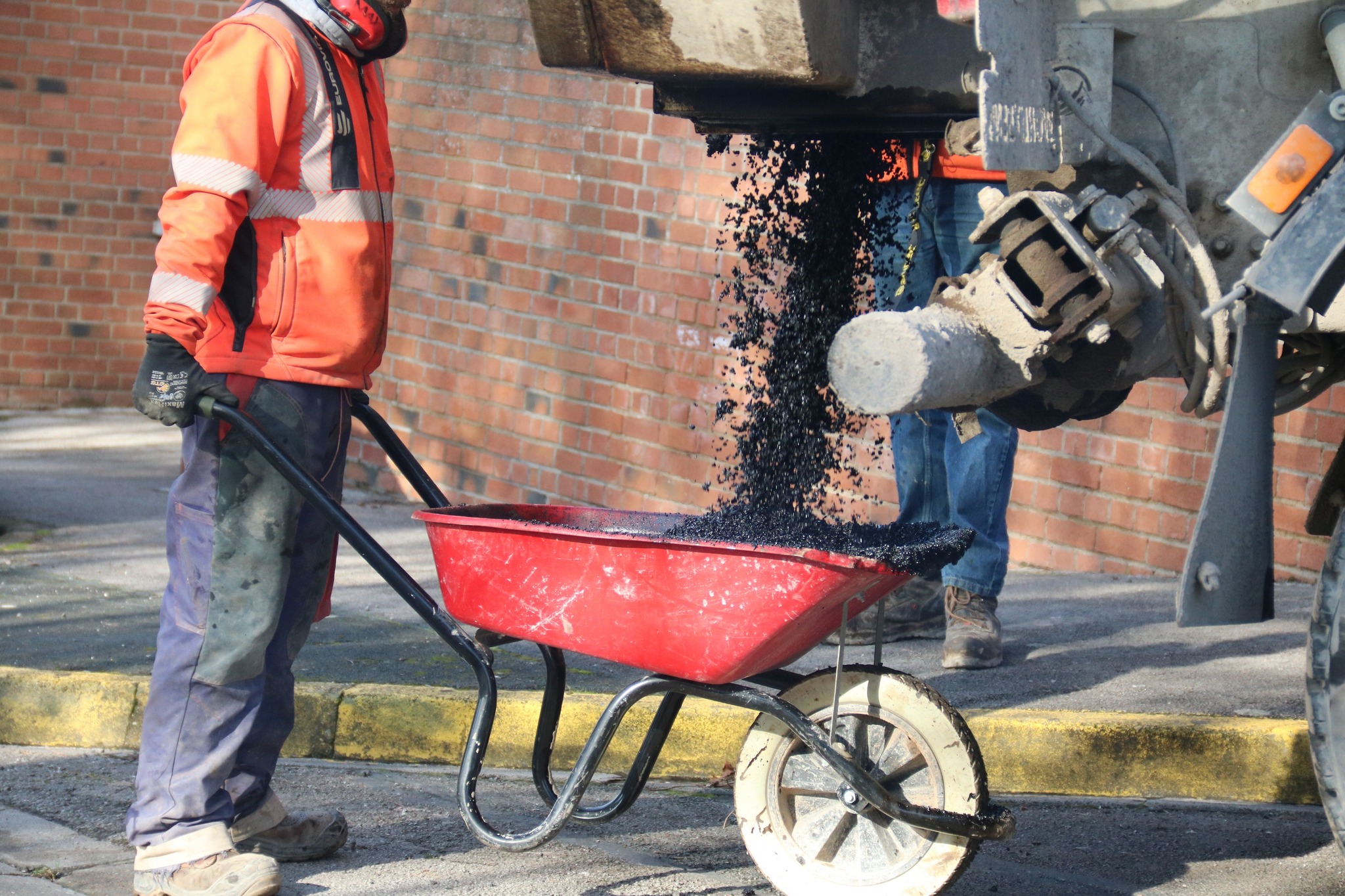 Après des découpes préparatoires effectuées en début de semaine, les équipes d’Eurovia sont intervenues ce vendredi pour reboucher plusieurs nids-de-poule. Les réparations ont été réalisées avec de l’enrobé à chaud (environ 160°C), une méthode plus résistante qu’un simple rebouchage à froid.