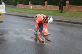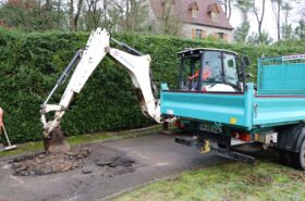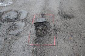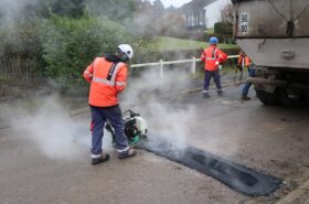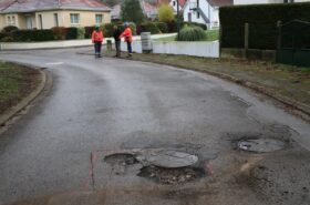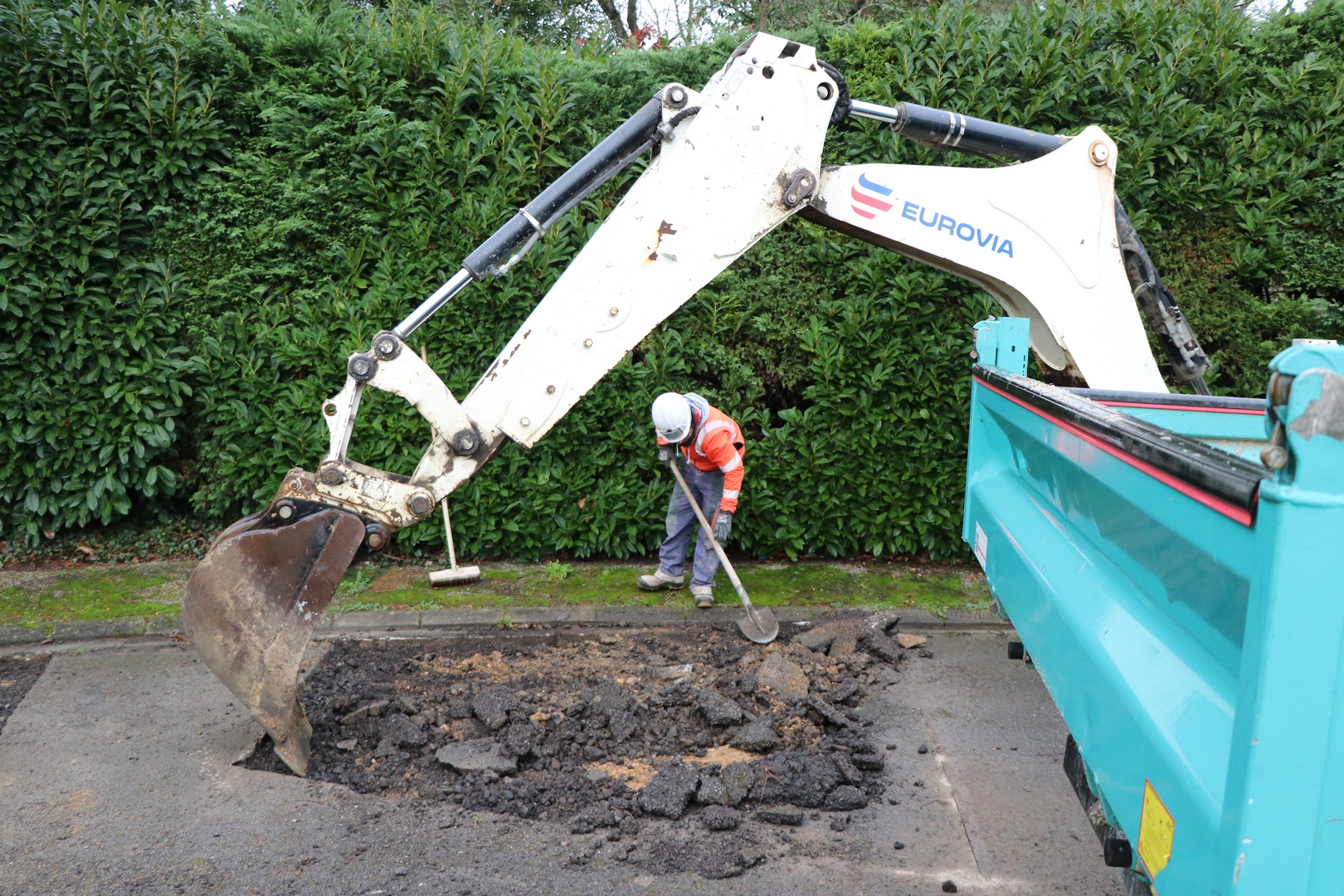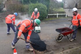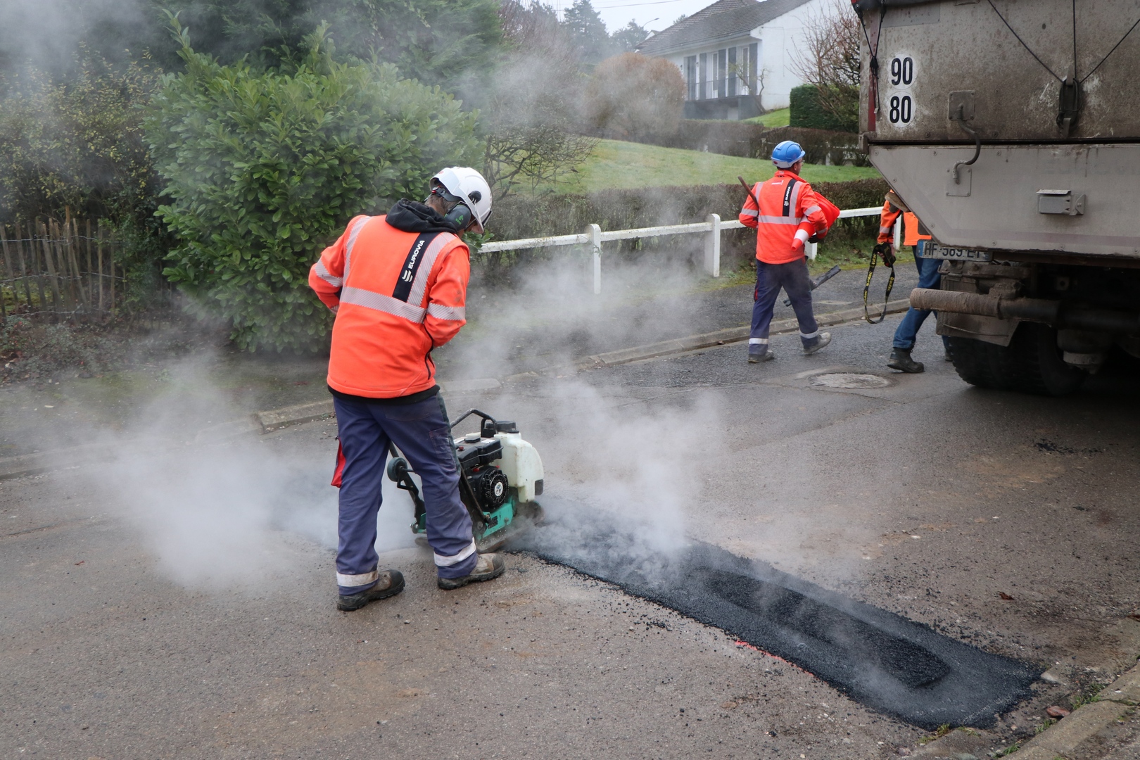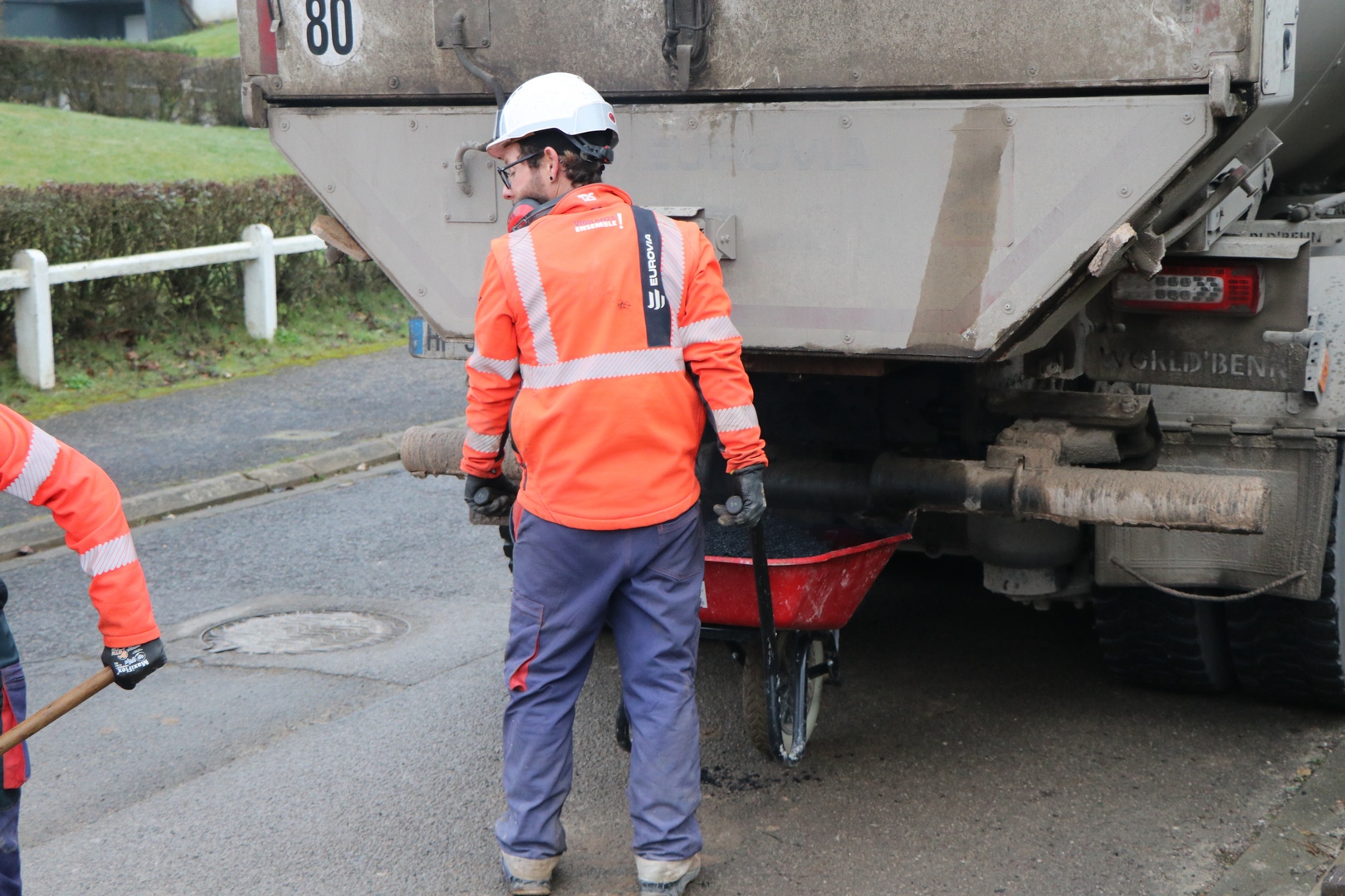 L’entreprise Eurovia intervient pour procéder aux opérations de découpe des zones dégradées, nécessaires à la préparation des surfaces à traiter. Les nids-de-poule sont ensuite rebouchés à l’aide d’enrobés à chaud, technique adaptée pour assurer la solidité et la tenue des réparations dans le temps.