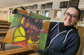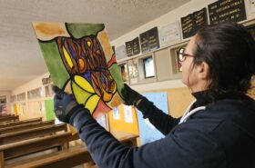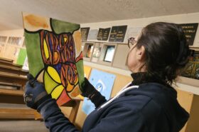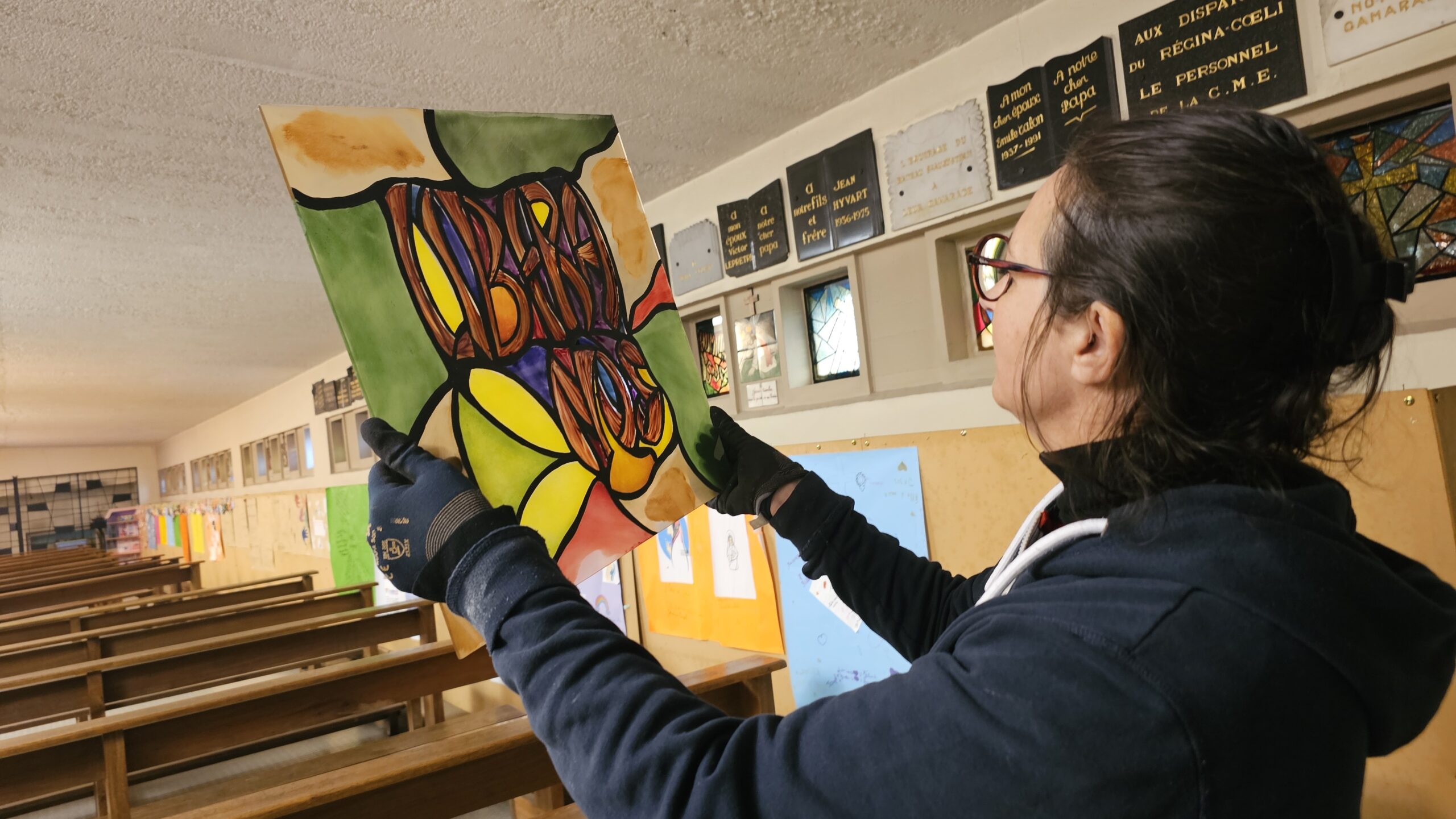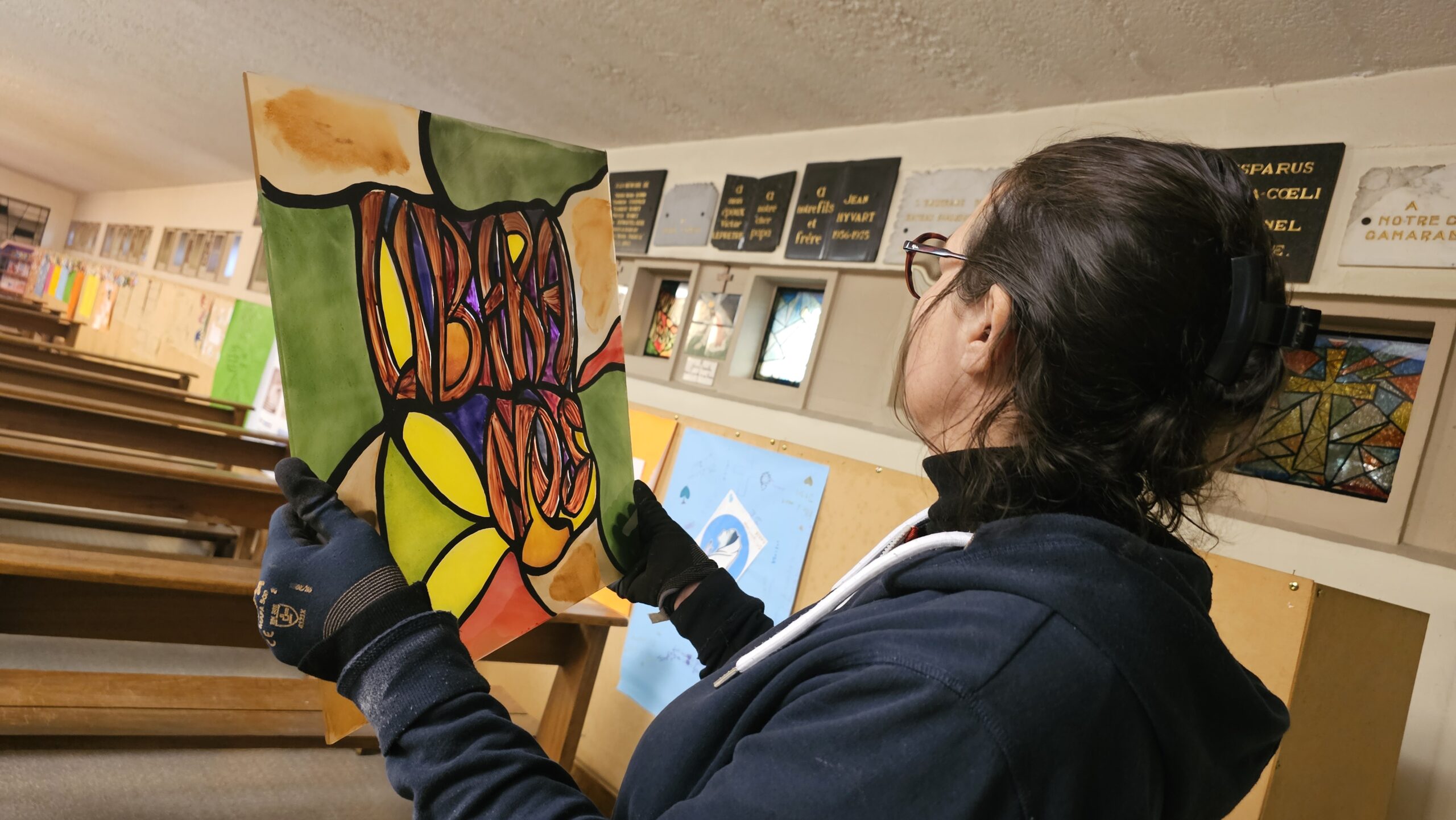 C’est l’artiste Hélène Triboulet qui a mené chaque étape du projet : dépose des éléments abîmés, reproduction fidèle des motifs, sélection des couleurs d’émail dans son atelier, cuisson du verre, puis pose des nouveaux carreaux, scellés avec du mastic aux emplacements d’origine. Ce mercredi 22 octobre l’artiste a procédé à la pose de l’un de ses 8 vitraux.