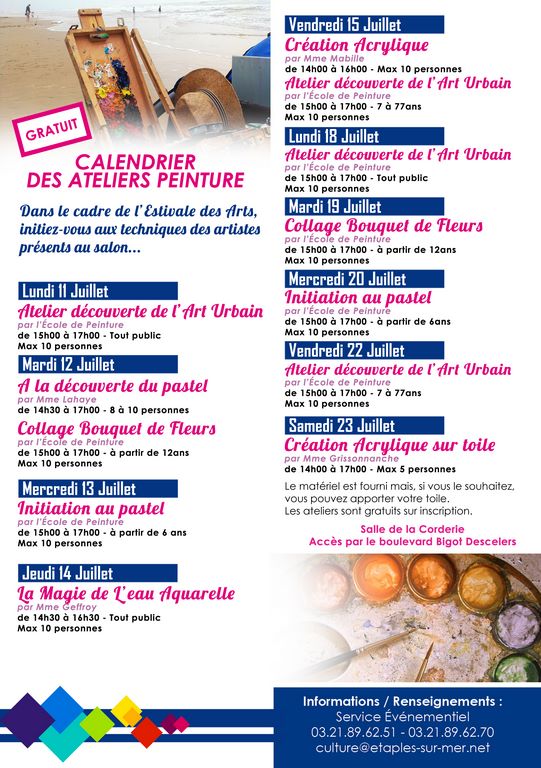 Découverte de l’Art Urbain, des peintures acryliques, initiation au pastel…, les ateliers sont gratuits sur inscription et se dérouleront à la Salle de la Corderie.