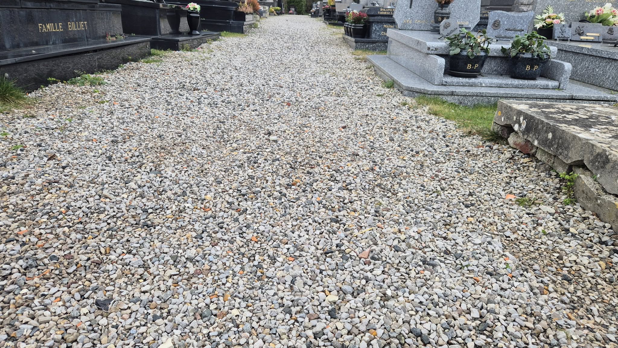 Le passage à des allées enherbées (tout en conservant une partie de graviers pour assurer la stabilité du sol) permet à la fois de faciliter l’entretien grâce à la tonte et de rafraîchir l’atmosphère. C’est également un moyen de redonner une place à la nature, tout en protégeant les sols des pollutions liées aux herbicides.