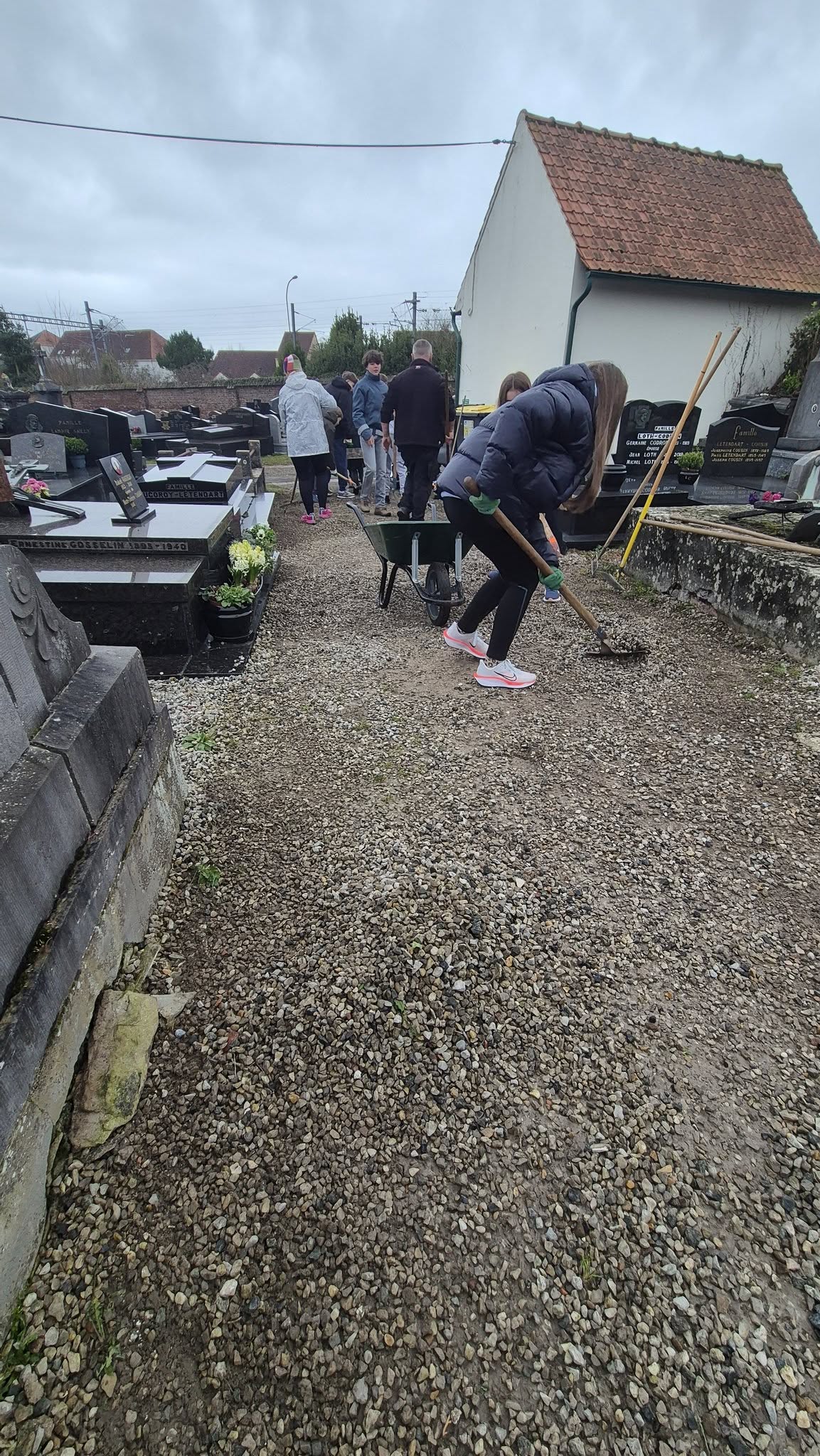 L’objectif de cette intervention était d’aménager une nouvelle allée, en supprimant la couche superficielle de gravier. Munis de râteaux, pelles et brouettes, les élèves ont retiré près de 10 tonnes. Ce gravier sera réutilisé pour d’autres opérations d’aménagement.